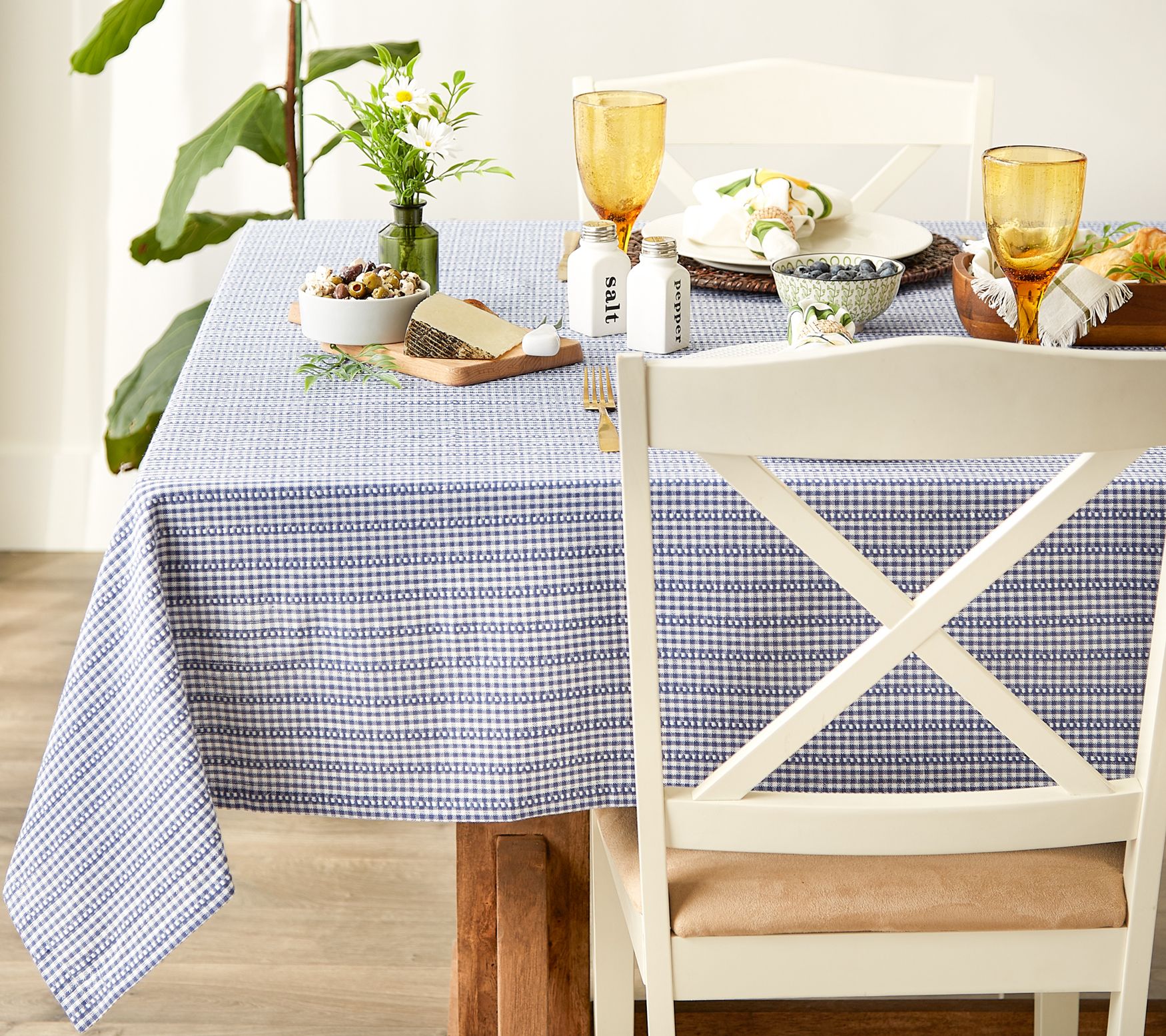 Add farmhouse charm to your dining table with this sweet gingham cotton tablecloth, with 1" hems and mitered corners. From Design Imports.