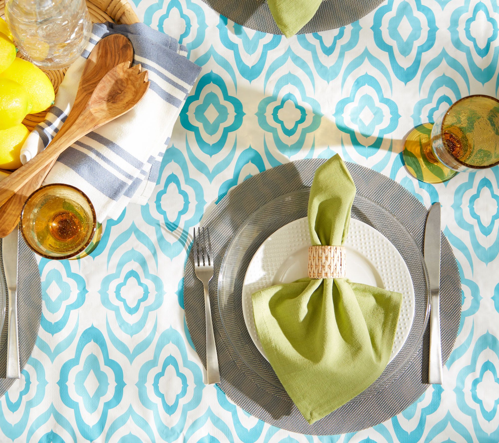 Vibrant shades of blue and an eye-catching print make this Ikat vinyl tablecloth a gorgeous addition to your indoor or outdoor table. From Design Imports.