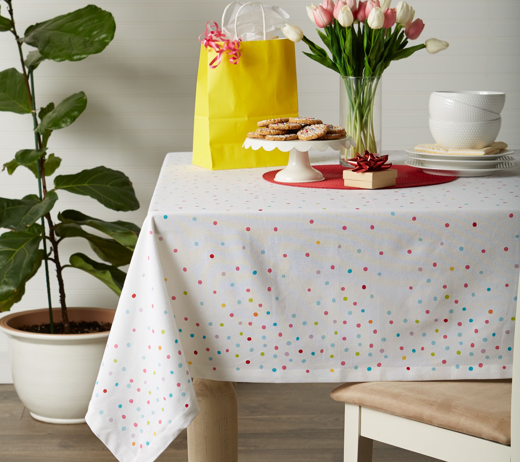 Set the stage for celebration with this Confetti Toss tablecloth. With its festive design and color-fast, wrinkle-resistant fabric, it adds style to any party. From Design Imports.
