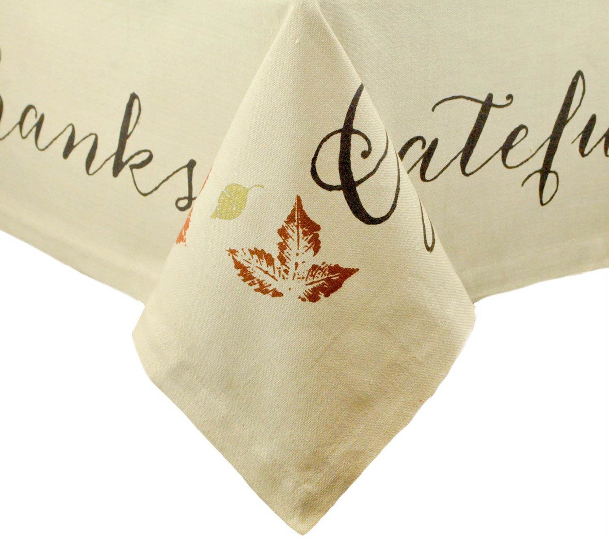 • Tablecloth: rustic leaves in warm fall colors; "Give Thanks", "Friends and Family", "Grateful", "Welcome", "Happy Home" print
