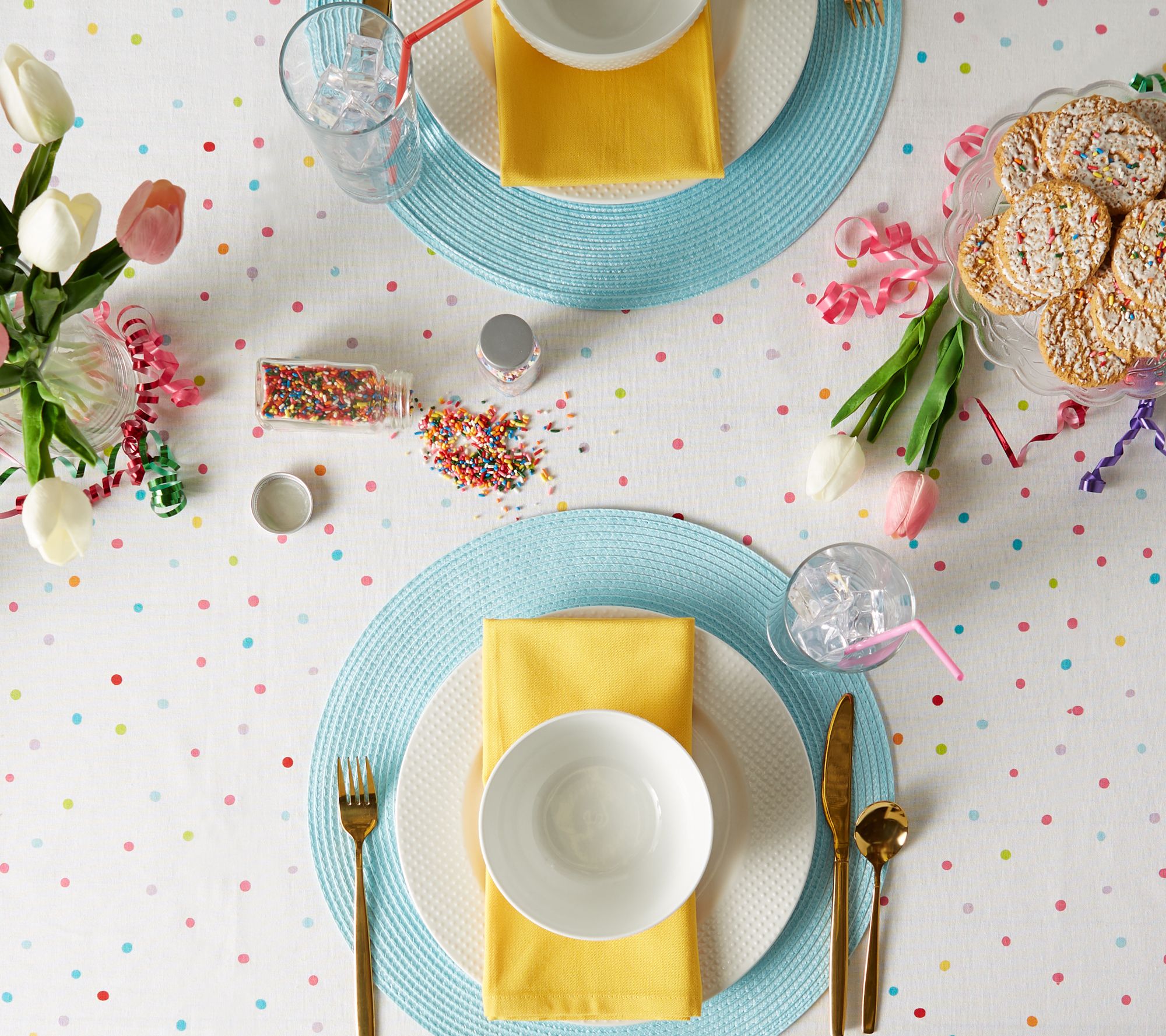 Set the stage for celebration with this Confetti Toss tablecloth. With its festive design and color-fast, wrinkle-resistant fabric, it adds style to any party. From Design Imports.