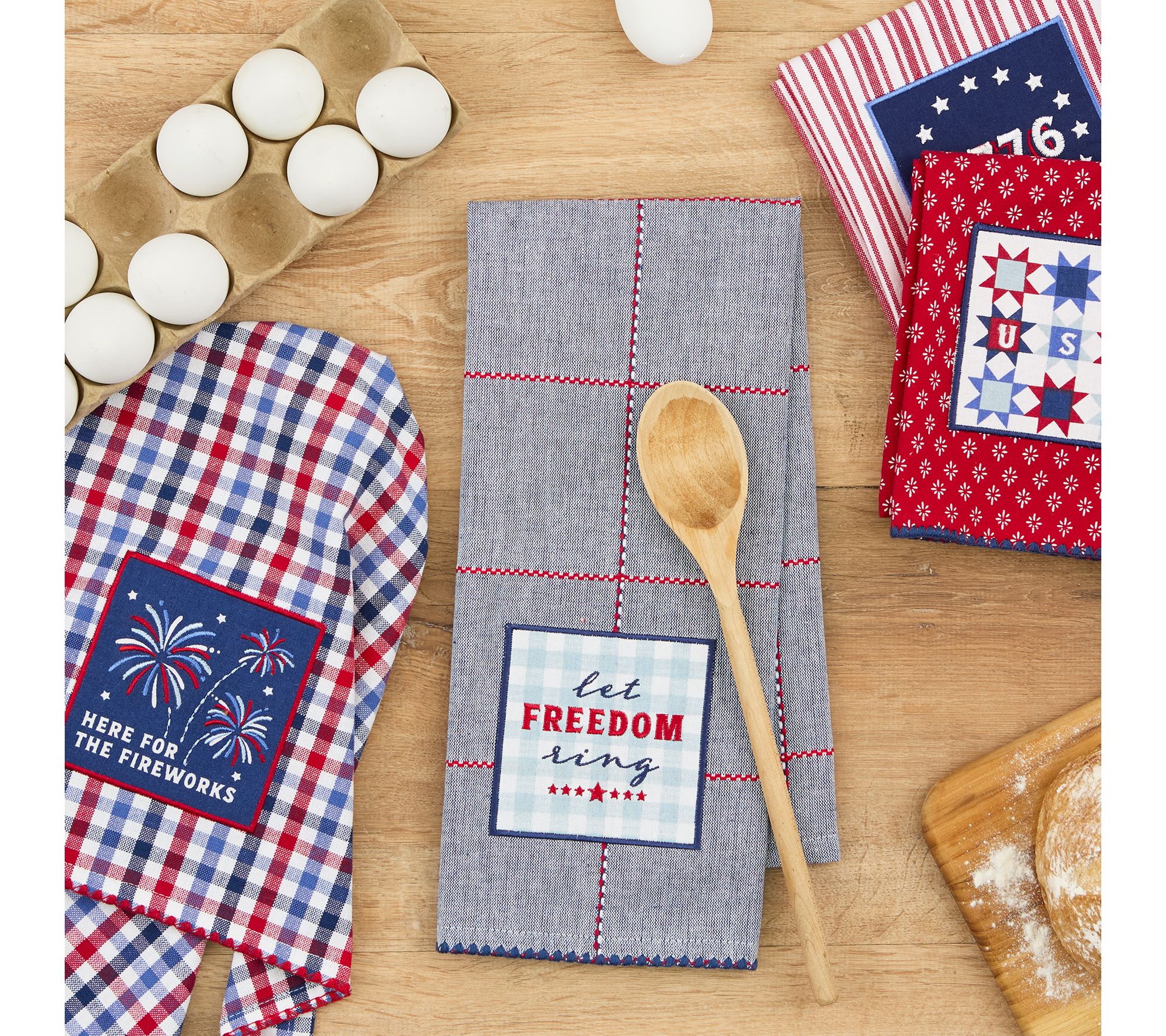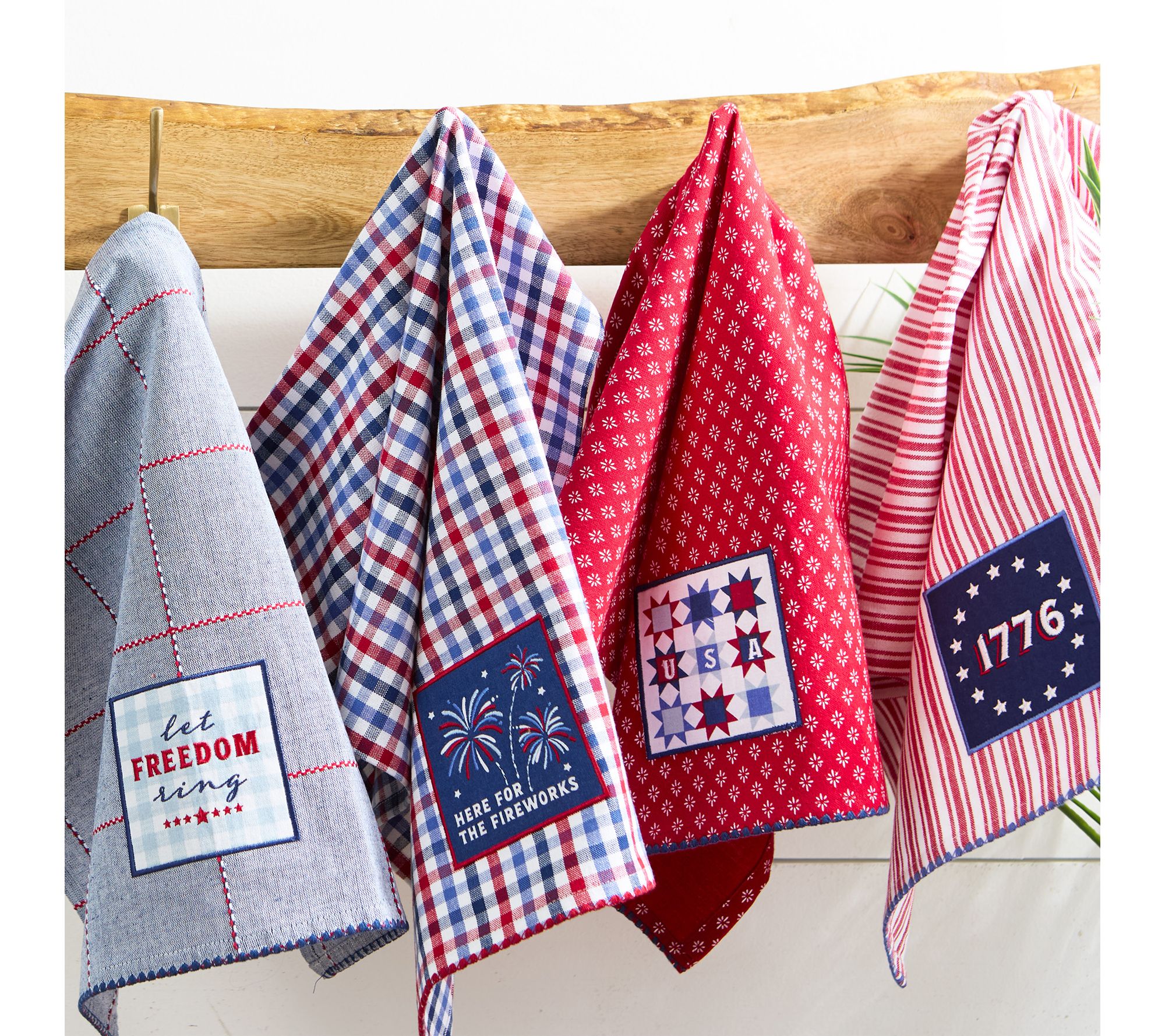 Celebrate every meal with a set of kitchen towels that brings festive charm and functionality to your space. Four whimsical designs, each featuring embroidered appliques, shell trim, and convenient hanging loops, make daily cleanups a breeze while adding a touch of Americana style to your kitchen. From Design Imports.