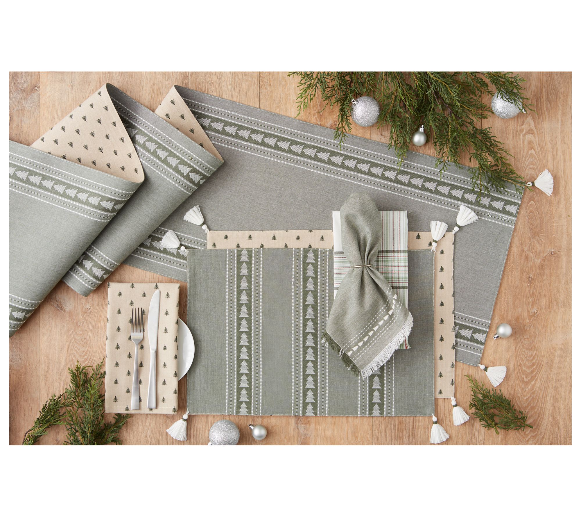 Strike a festive note this holiday season with the Balsam Fir Tree Jacquard Table Runner from Design Imports. Featuring an intricate jacquard design with fused and lined tree dots print, it seamlessly adds a touch of elegance to your dining table. Perfect for festive gatherings, this table runner is sure to impress your guests. From Design Imports.