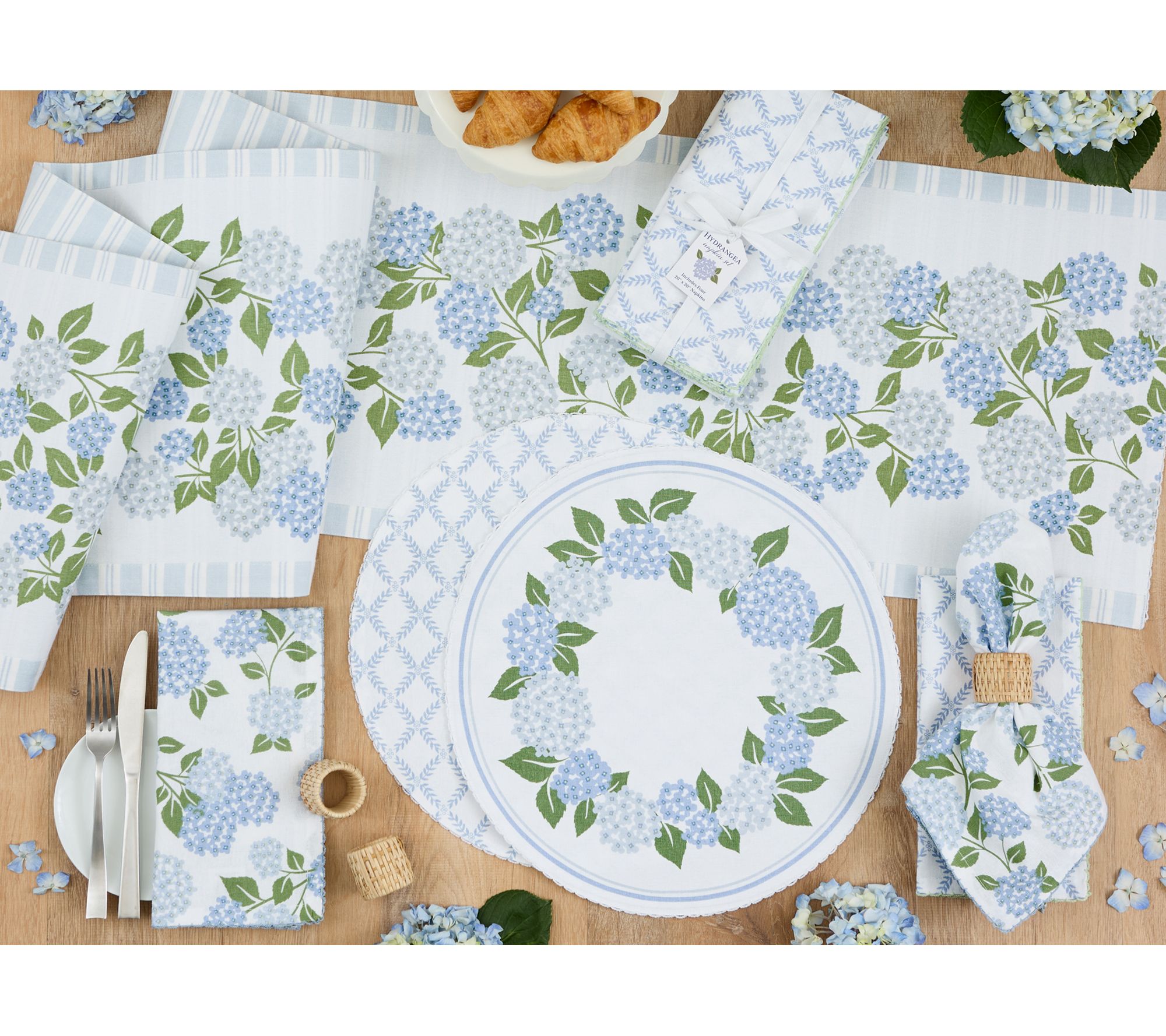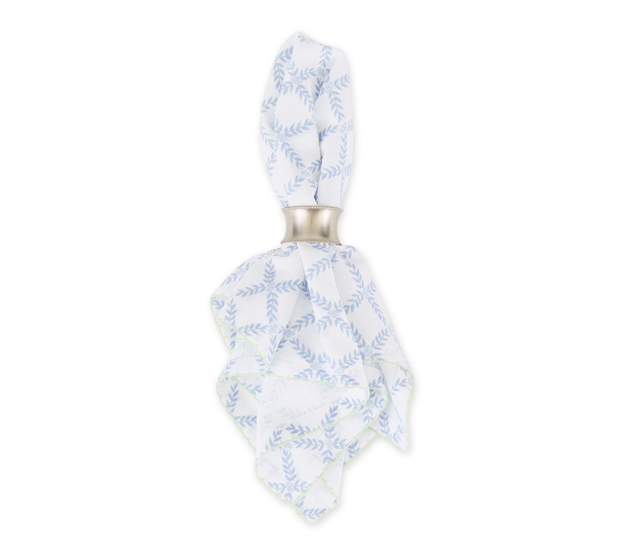 Set a charming scene for brunches, dinners, or everyday meals with this set of trellis printed napkins. Their soft blue hues, elegant pattern, and delicate lace stitch trim bring a fresh, inviting touch to your table -- just right for springtime gatherings or sunny summer celebrations. From Design Imports.