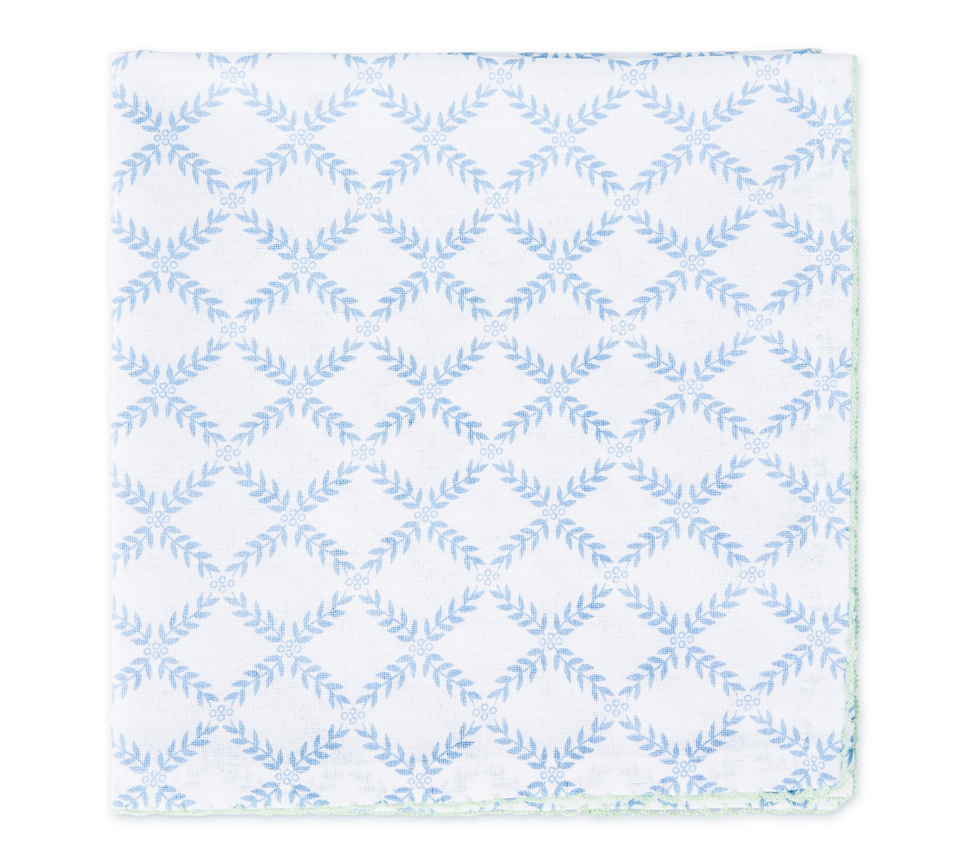 • Features elegant blue trellis print, decorative lace stitch trim, and 1/2" hem with mitered corners; tied with white twill tape and hang tag