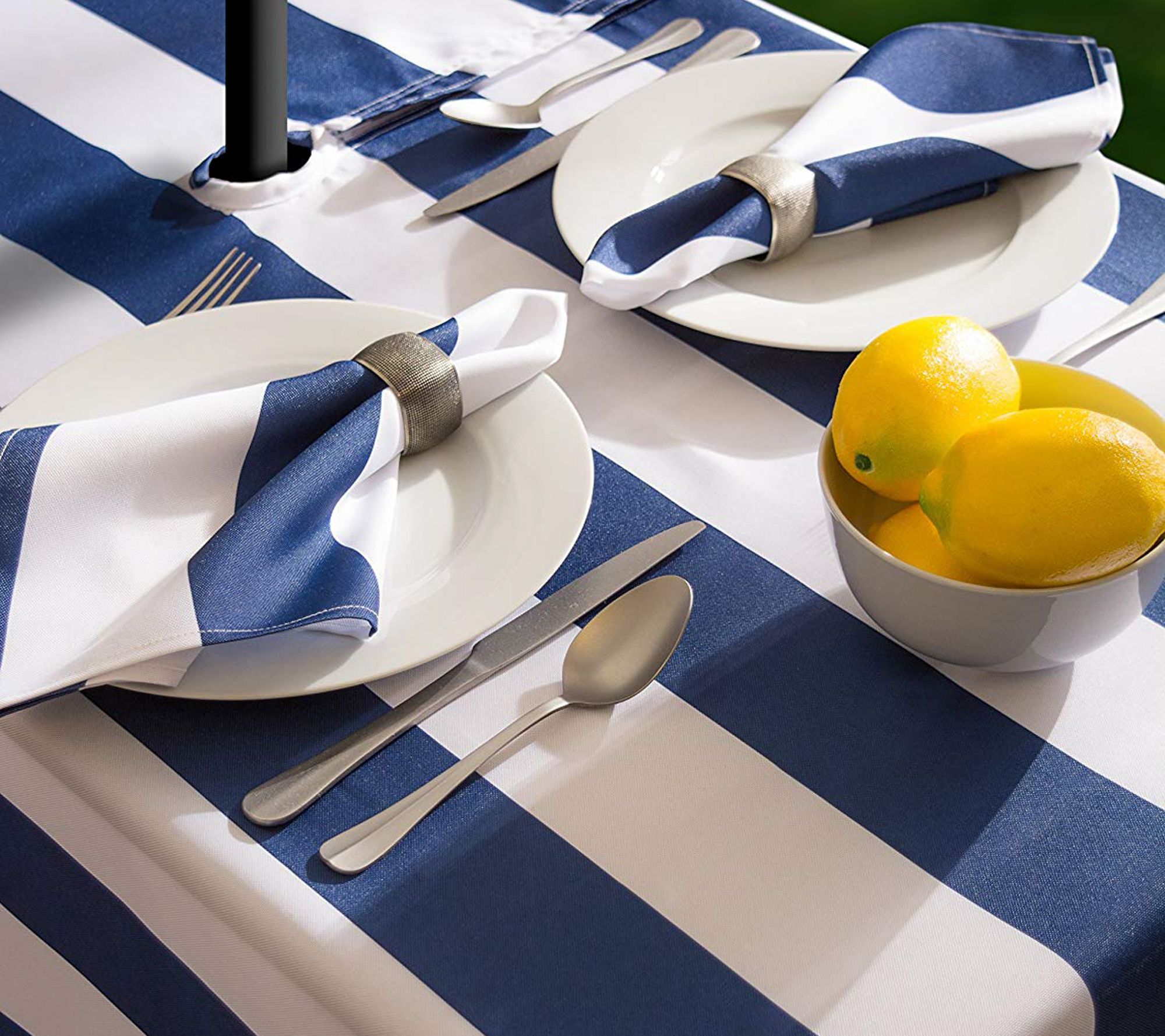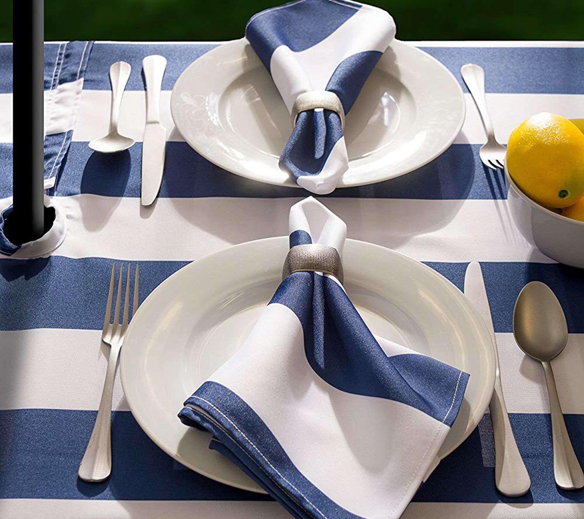 "How To" barbecue? Grilled grub and chilled cocktails aren't the only essentials. Set your table with this fresh cabana stripe tablecloth and you're ready for summer fun. The handy zipper makes it possible to cover and protect your outdoor umbrella table from spills, so you can get this party started! From Design Imports.