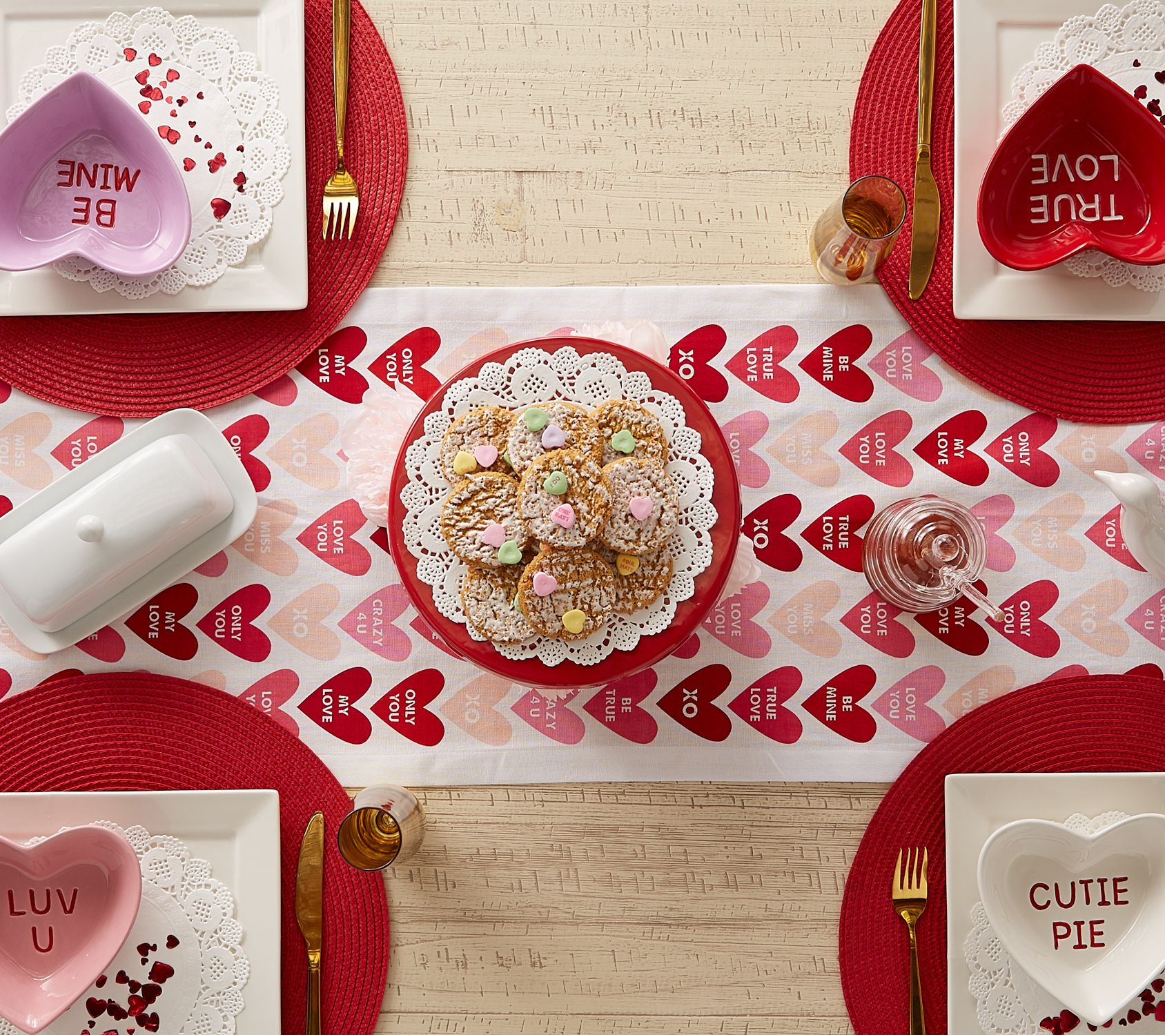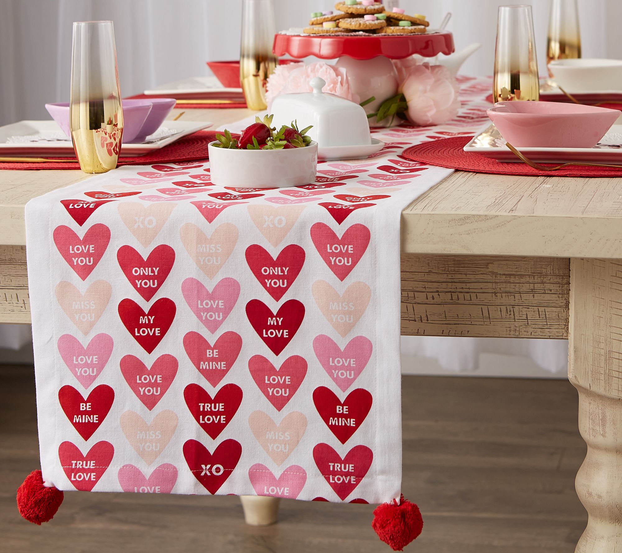 • Conversation heart-themed runner with poms on each corner