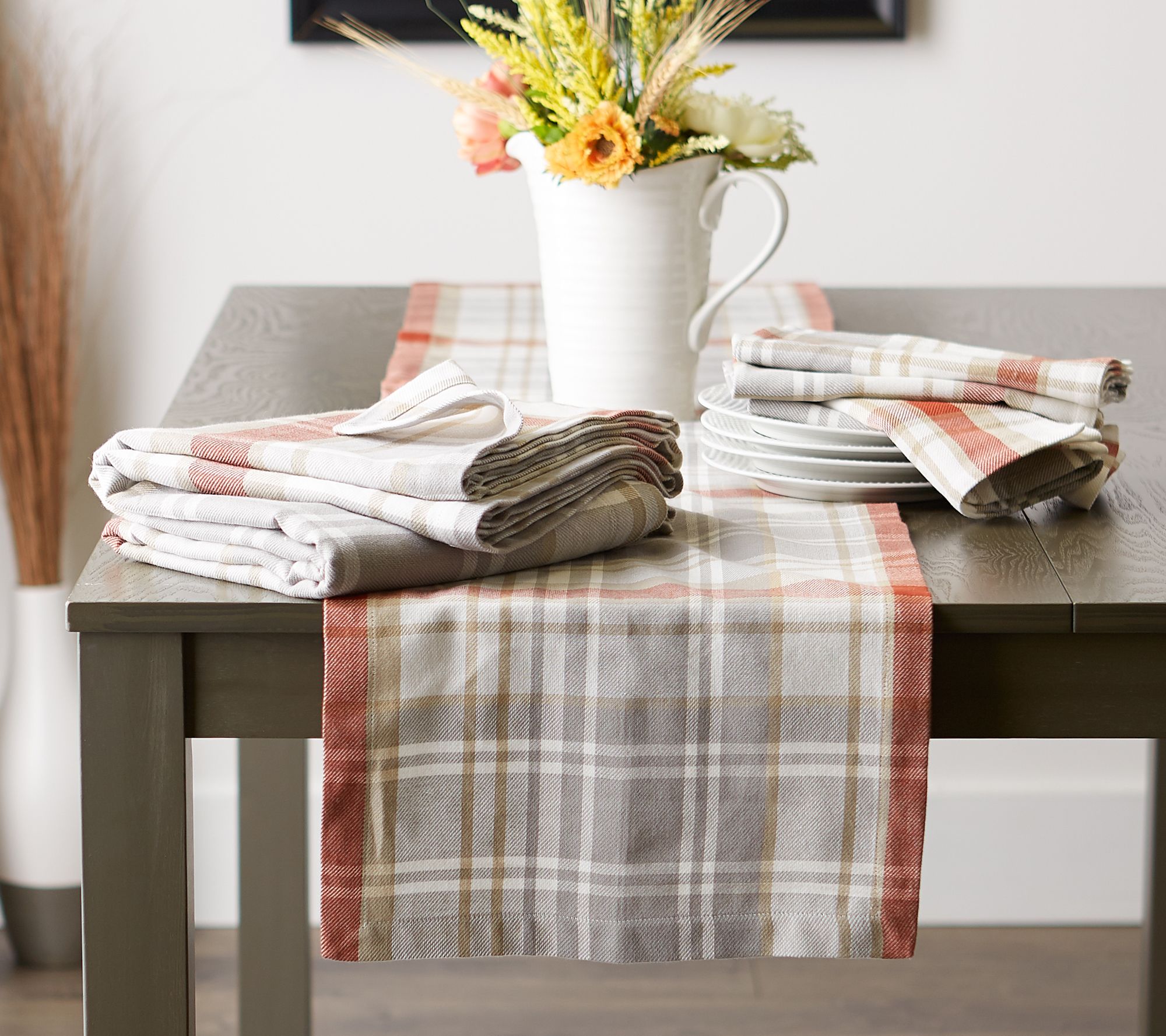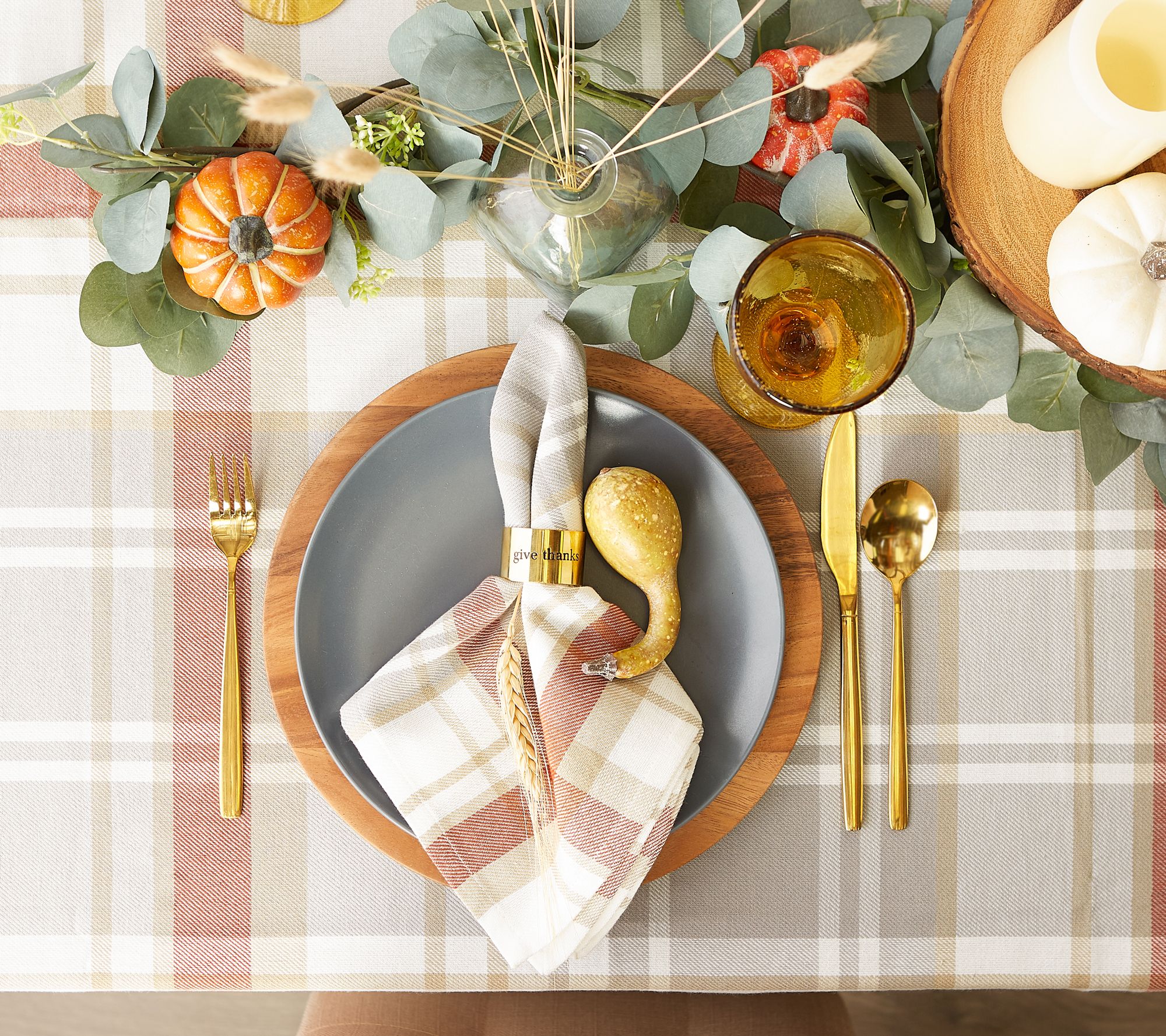 Combining a picnic plaid print with soft harvest hues, this cozy cotton tablecloth is the perfect finishing touch for your fall dining room decor. From Design Imports.
