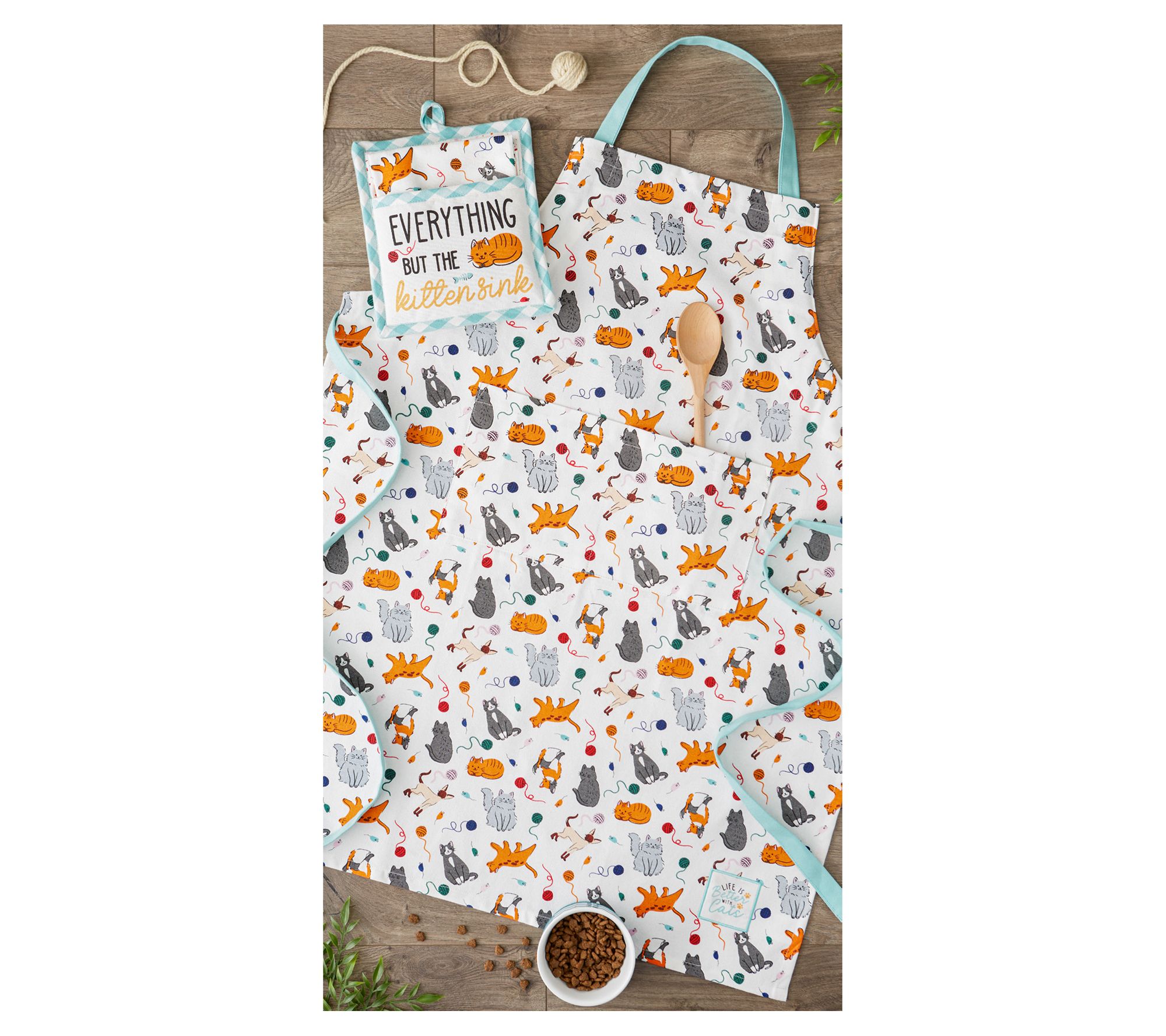 Embrace your love of cats and cooking with the Feline Fine chef's apron. Adorned with an adorable kitty motif and the heartwarming phrase "Life is Better with Cats" on the lower hem, this 100% cotton apron combines functionality with whimsy. Its adjustable ties and convenient pocket make it a practical choice for any culinary adventure. From Design Imports.