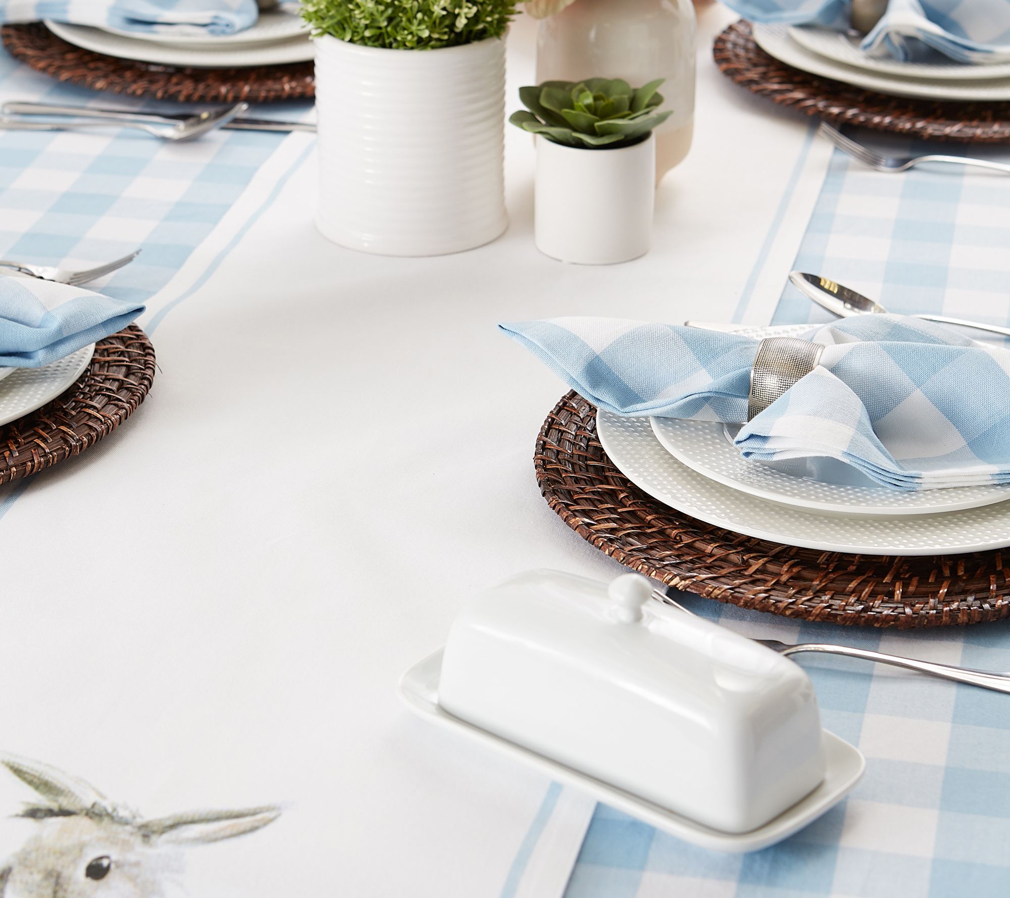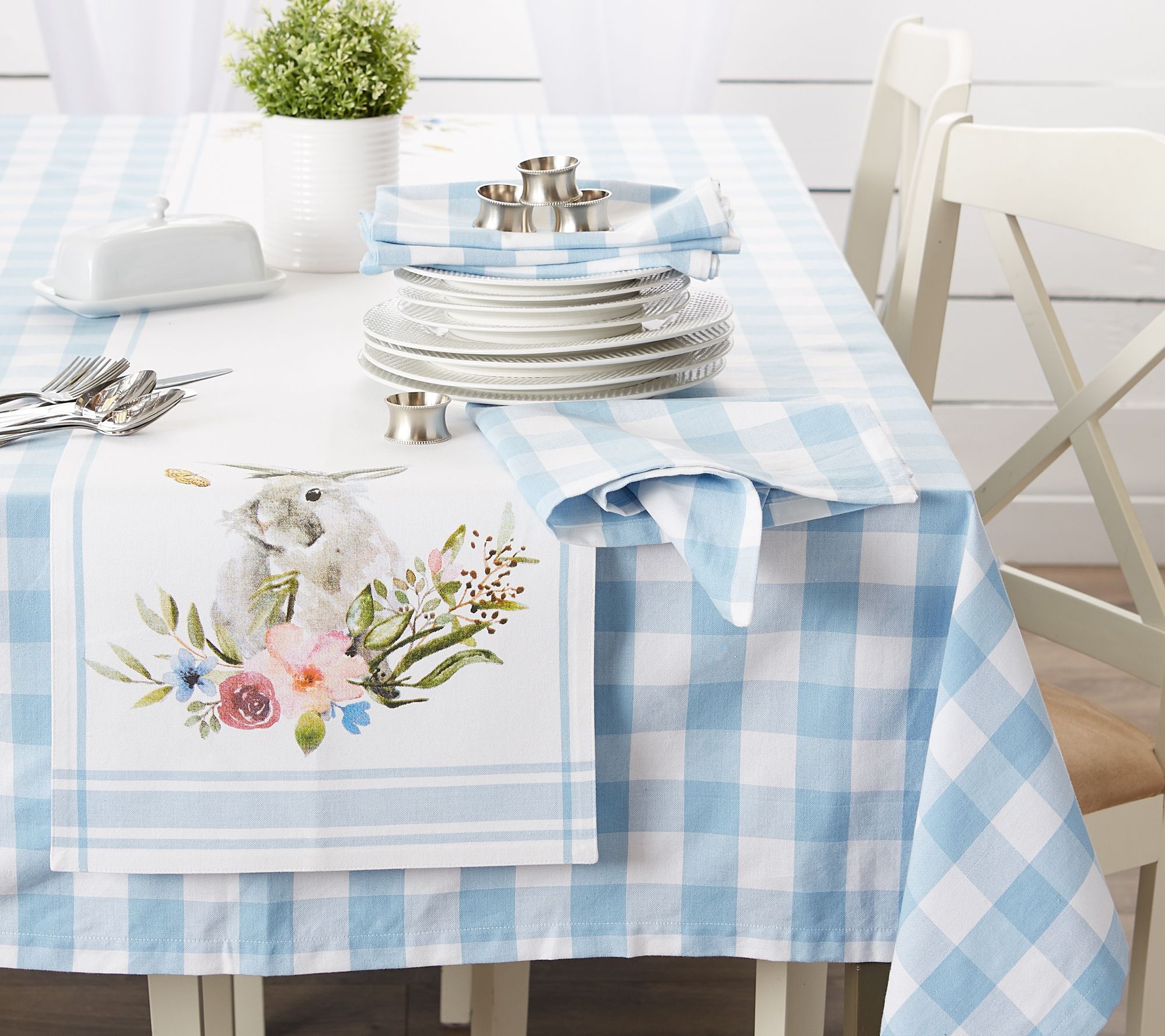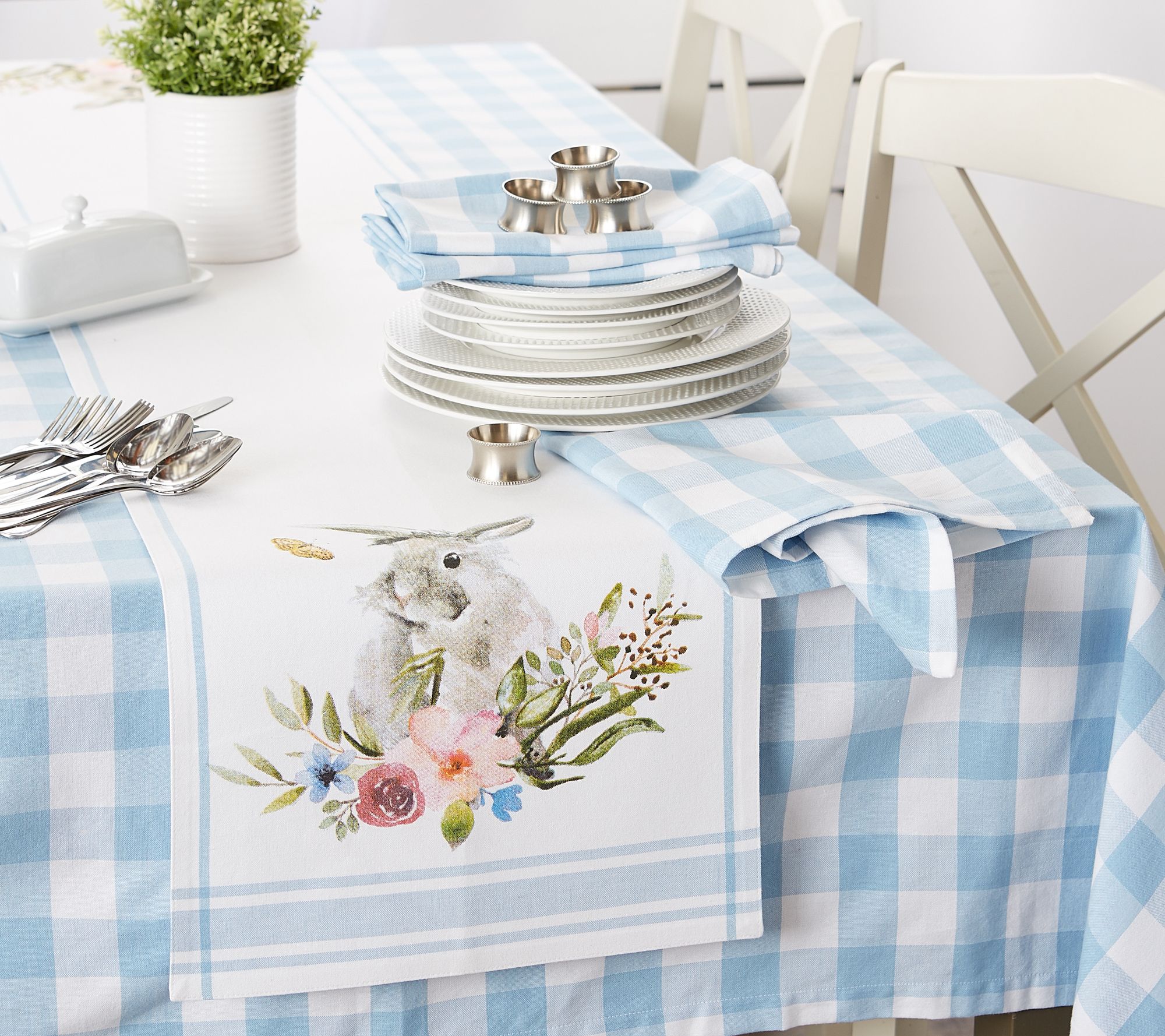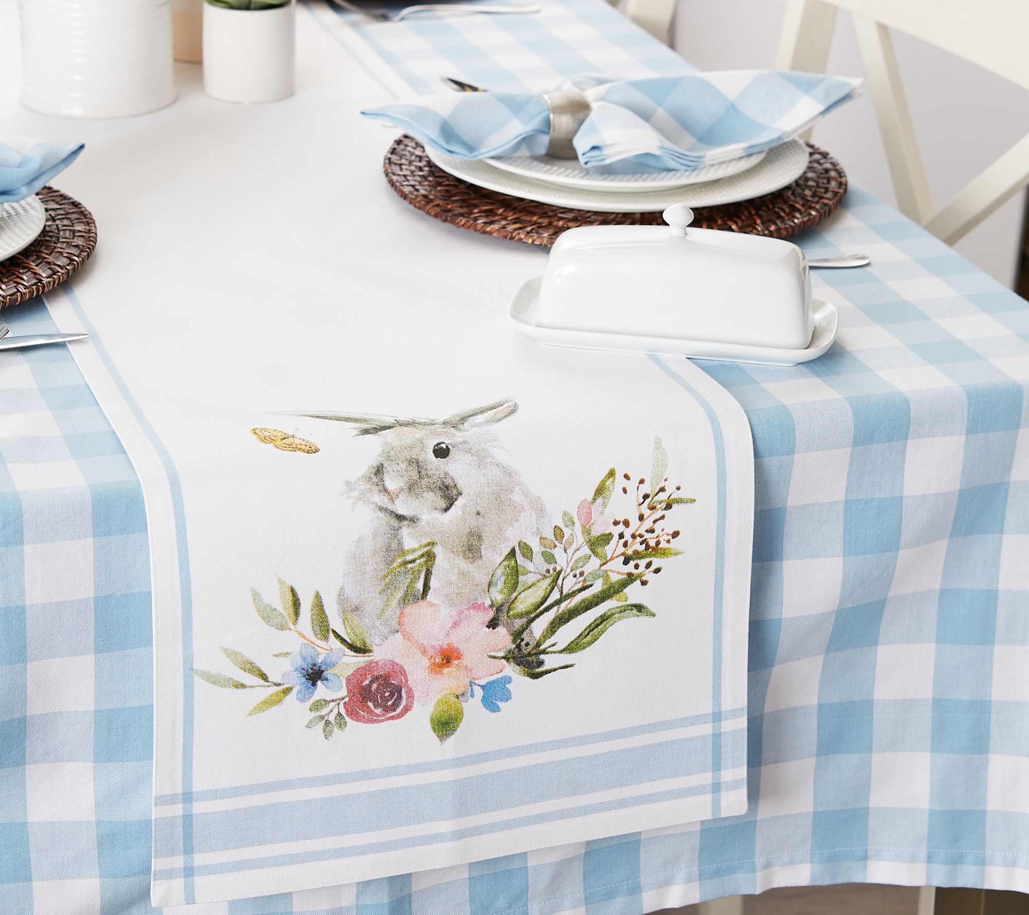Perfect for your spring or Easter tablescape, this cotton table runner features an adorable bunny among flora and fauna, reminiscent of a fine watercolor painting. Use it for parties, showers, coffee table or buffet table. This table runner is crafted with a folded hem and mitered corners. From Design Imports.