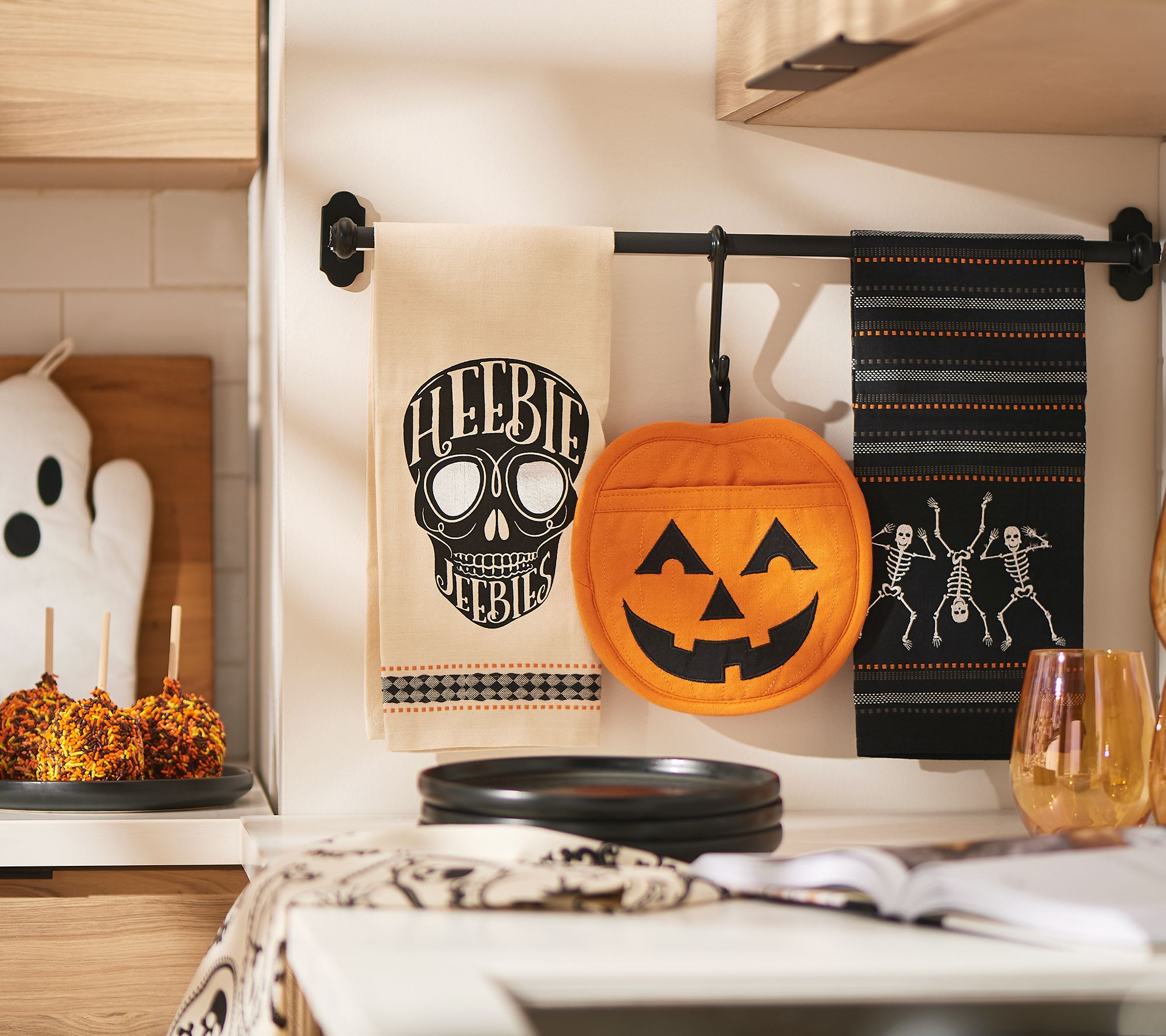 This oven mitt and pot holder set are a delightfully spooky addition to your kitchen this Halloween season. From Design Imports.