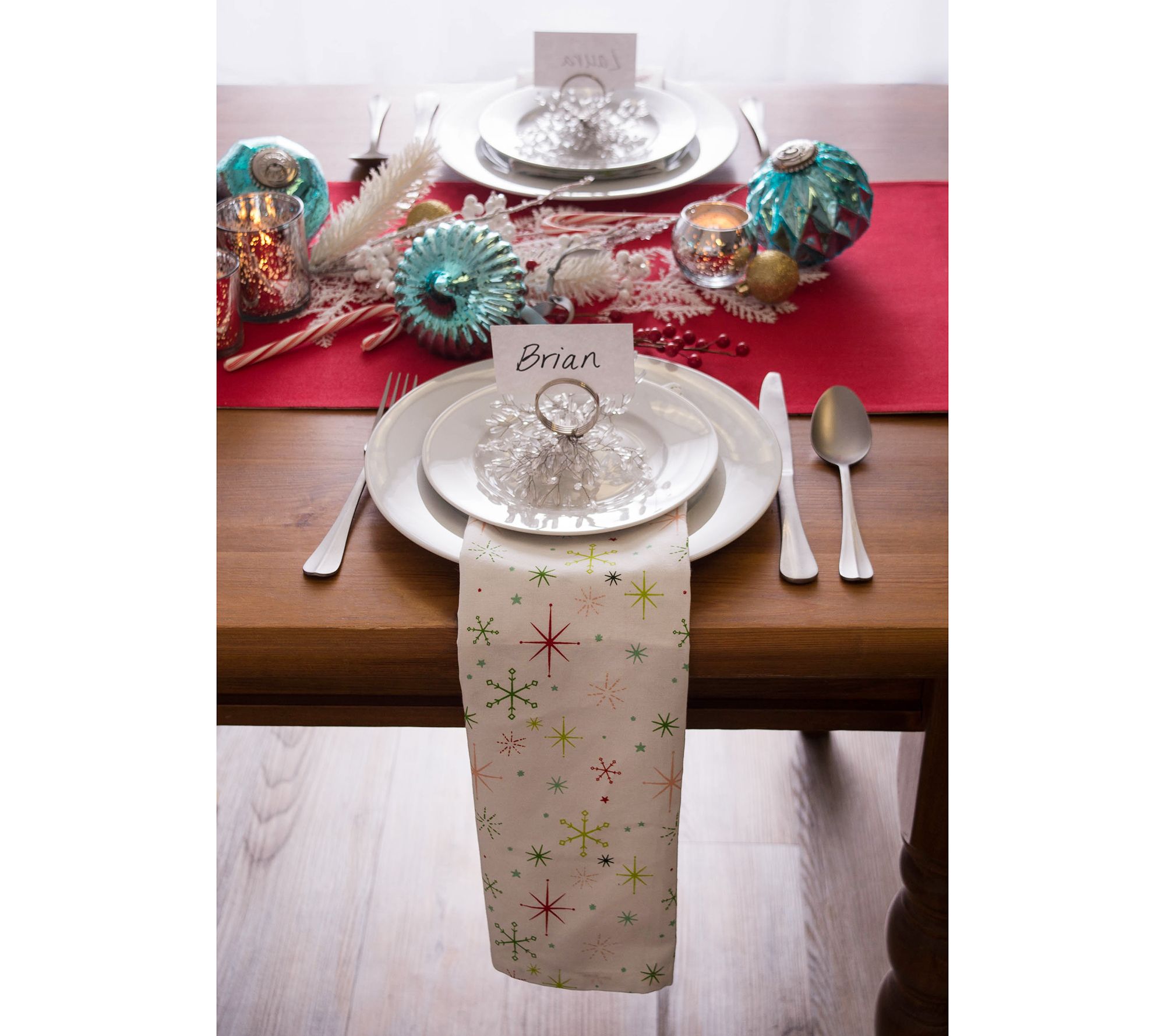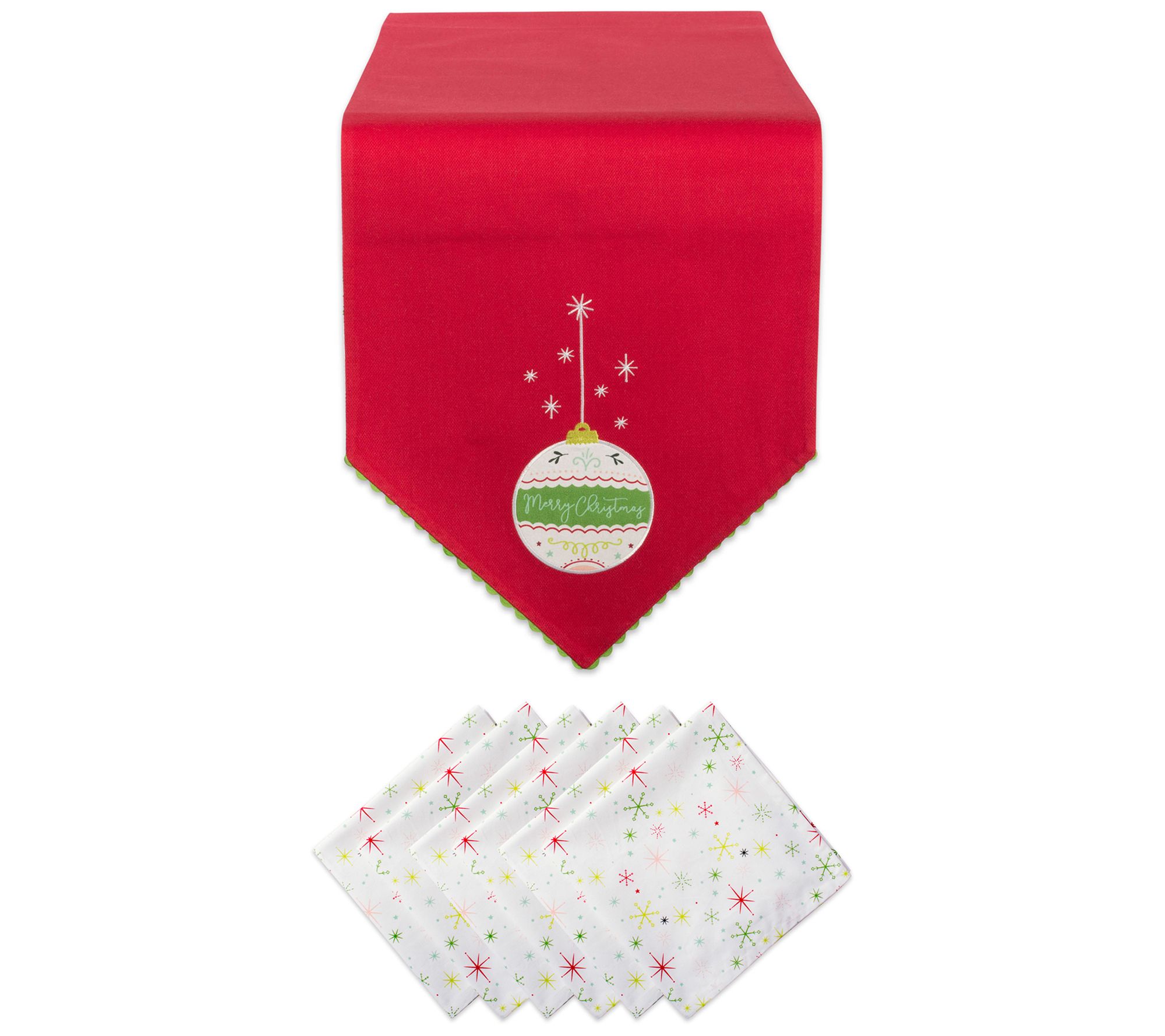 Set your table with classic Christmas colors and designs with this traditional table runner and napkin set. From Design Imports.