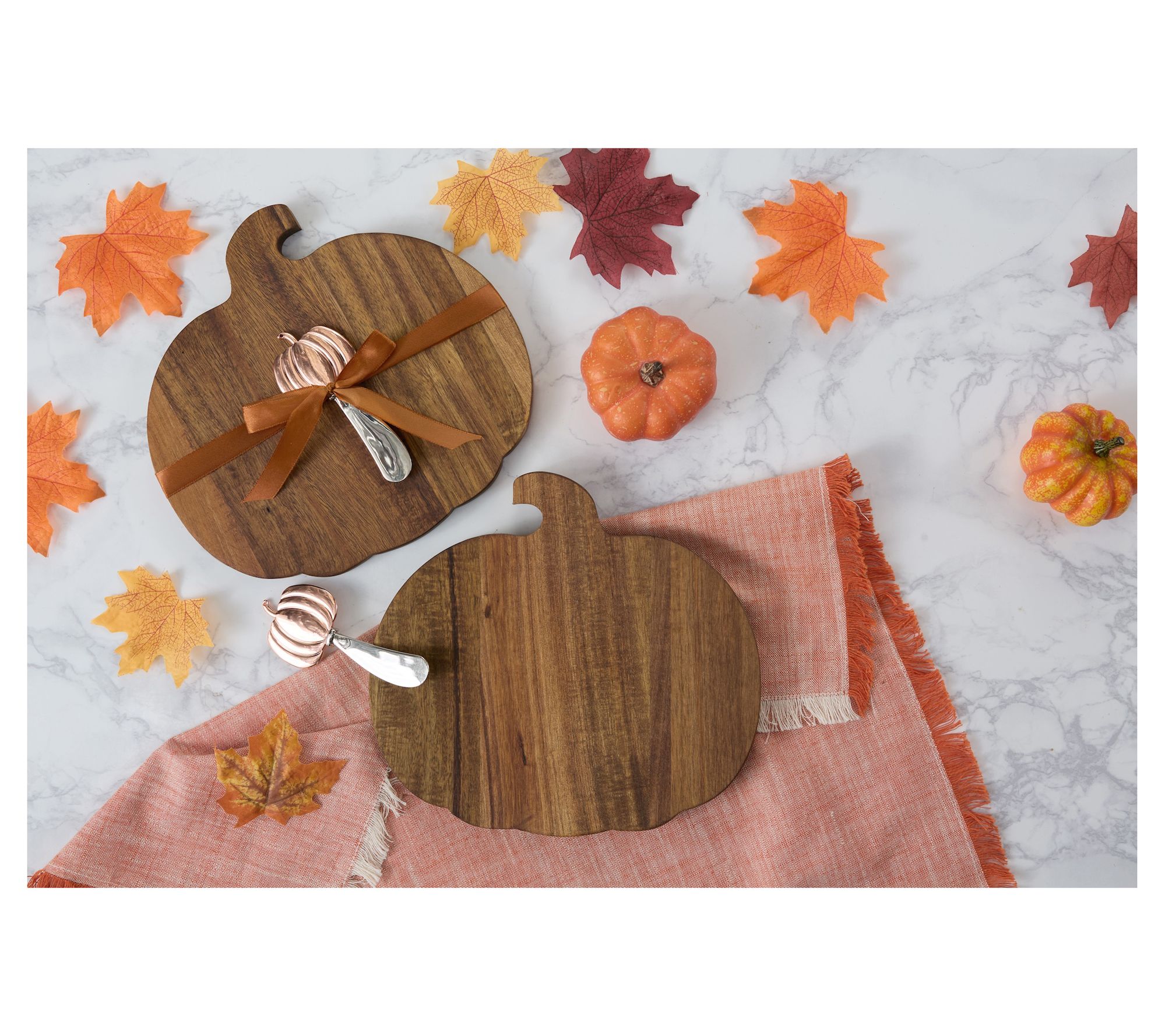 Host autumn get-togethers in style with this pumpkin-shaped cutting board and coordinating spreader set, ready for delicious cheeses or appetizers all season long. The acacia wood board offers a festive touch from Halloween through Harvest, while the zinc alloy spreader makes serving easy and elegant. From Design Imports.