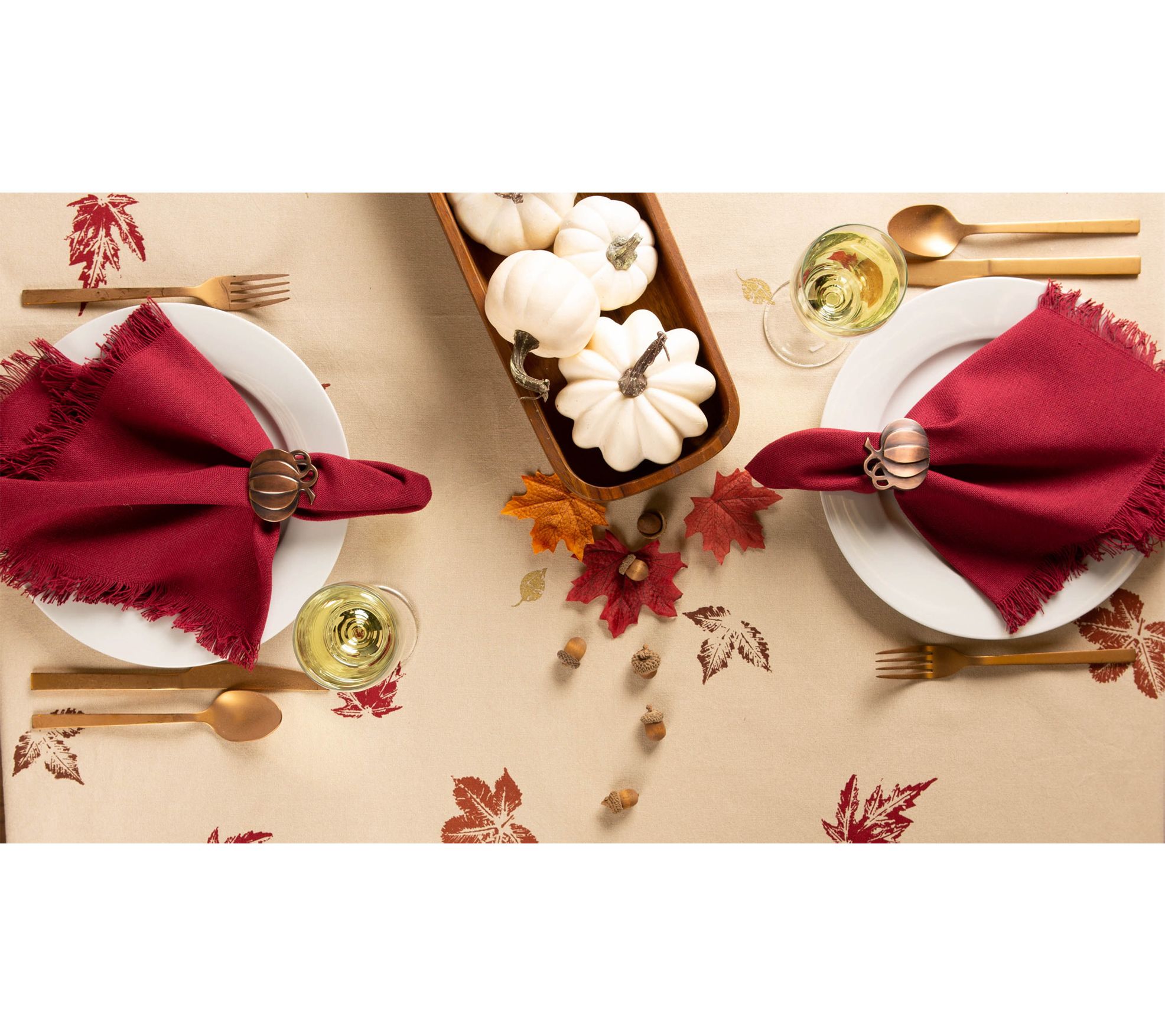 At the table--and on the table--words matter! This tablecloth is printed with Give Thanks, Friends and Family, Grateful, Welcome, and Happy Home. From Design Imports.