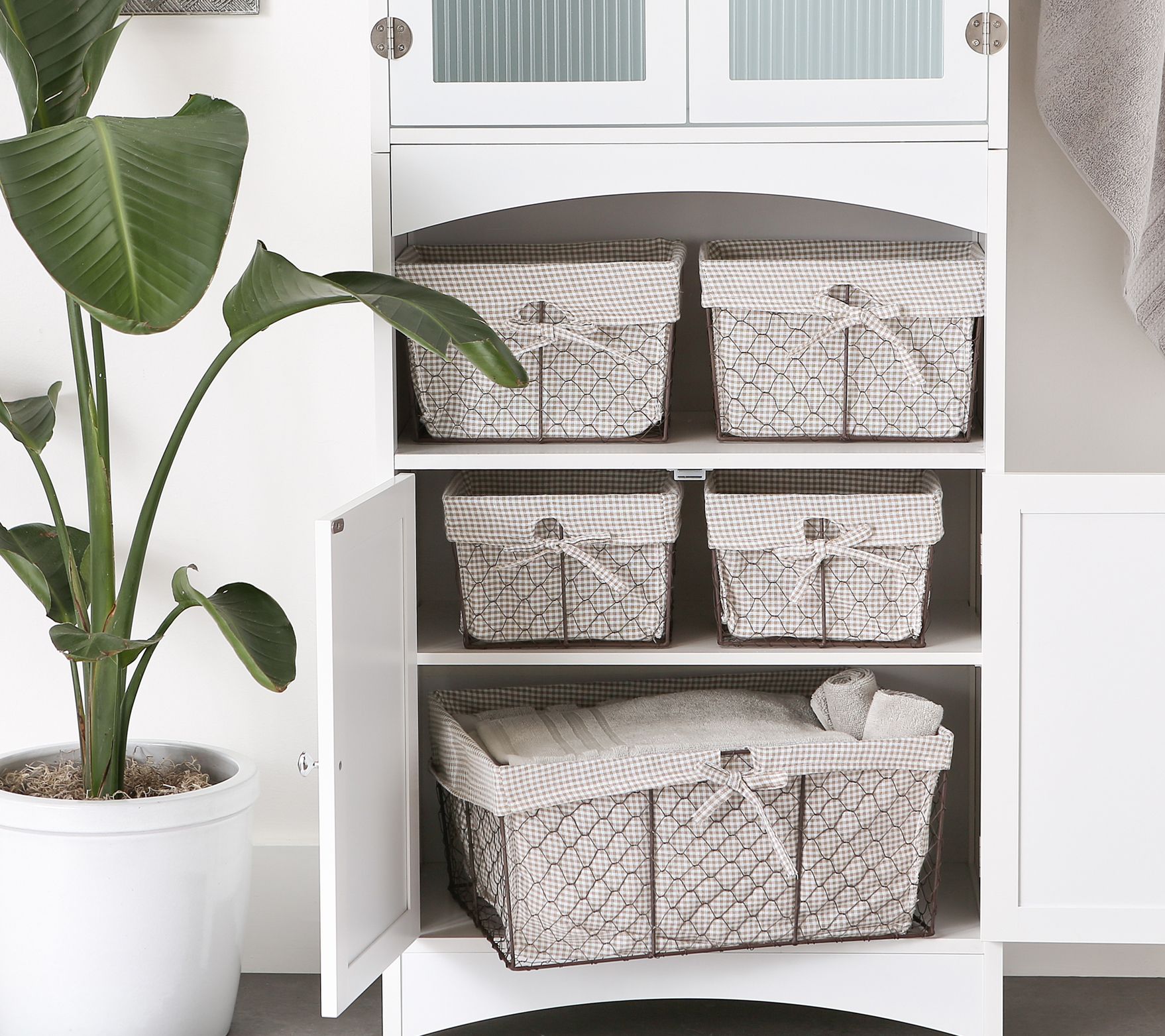 • Includes two small, two medium, and one x-large nesting metal wire baskets, each with a removable fabric liner