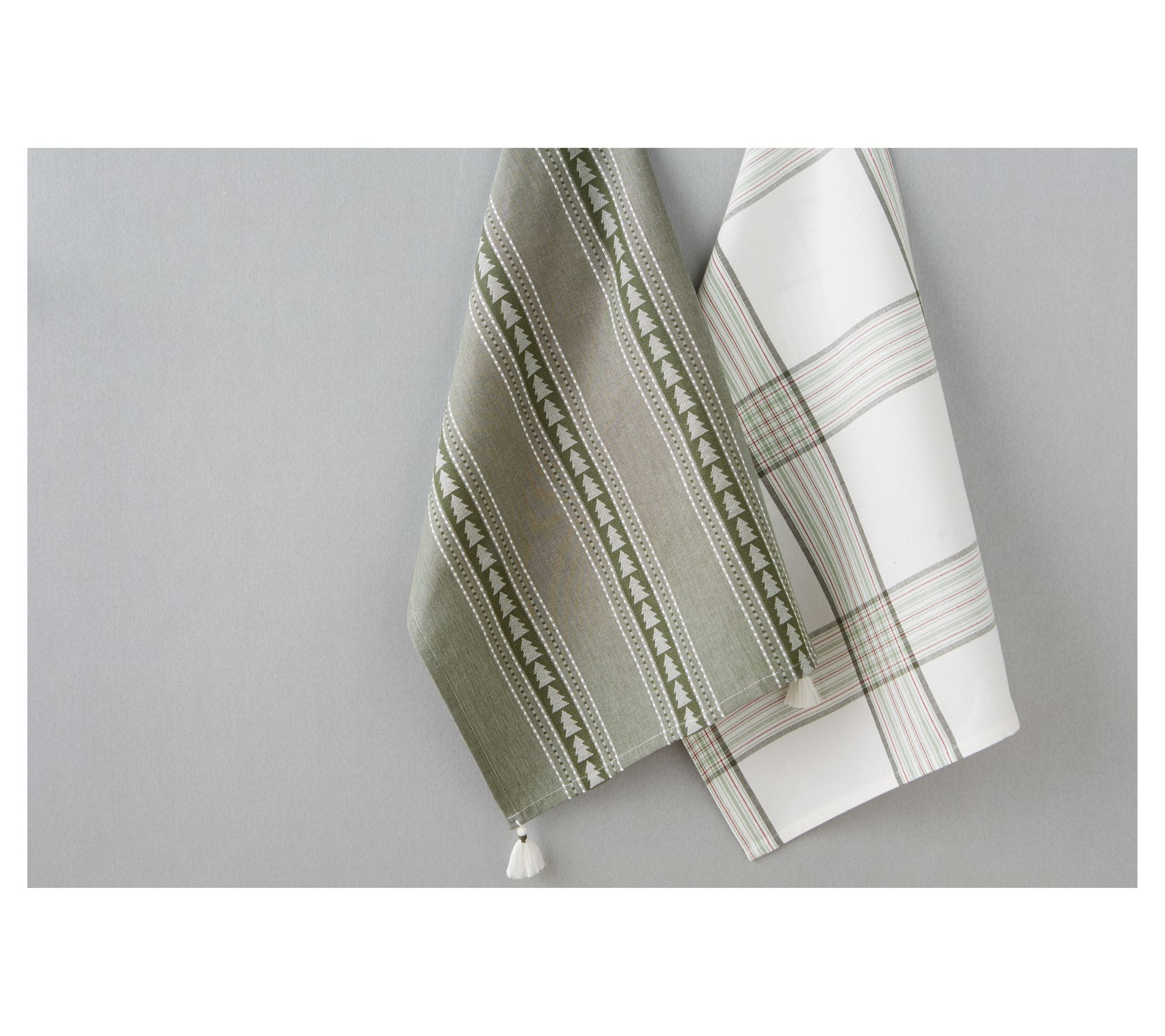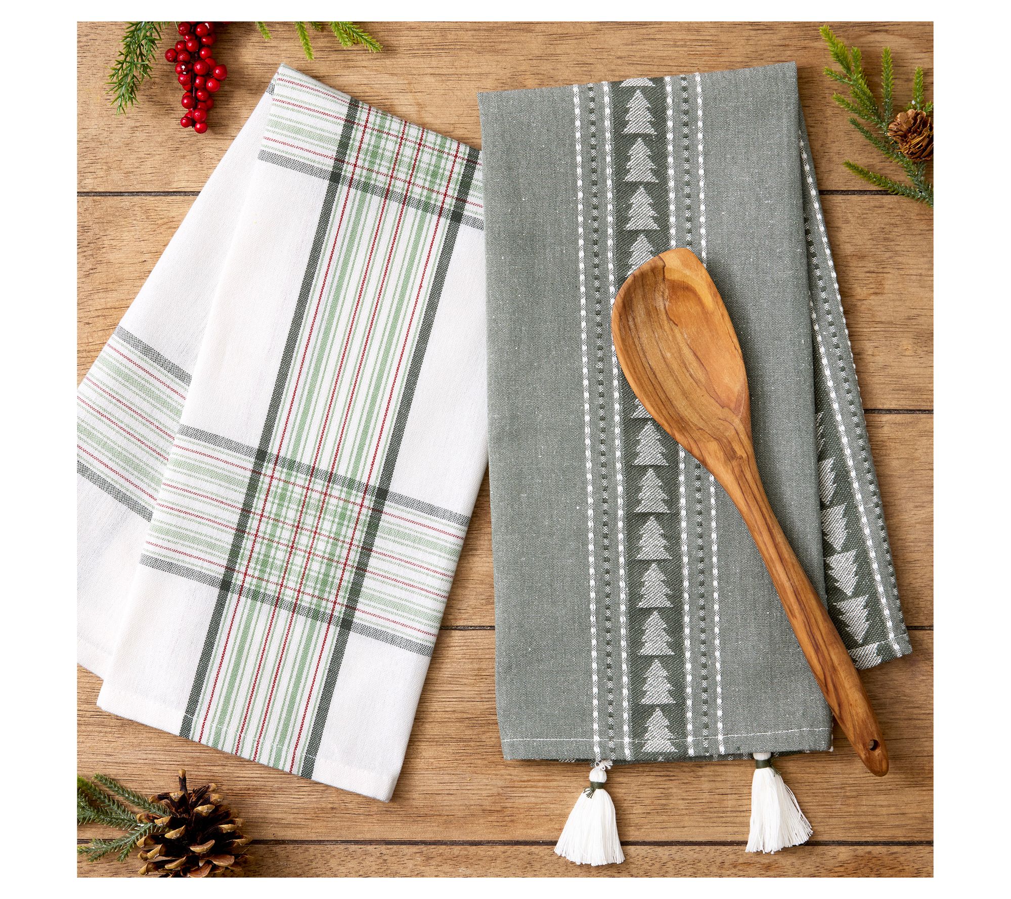 Bringing fresh style to your kitchen, this set brings together a classic jacquard balsam fir tree and cheerful tree farm plaid to make everyday cleanups or holiday baking feel more inviting. Both towels feature generous sizing and handy hanging loops, making them a welcome spot to dry your hands or dishes. From Design Imports.