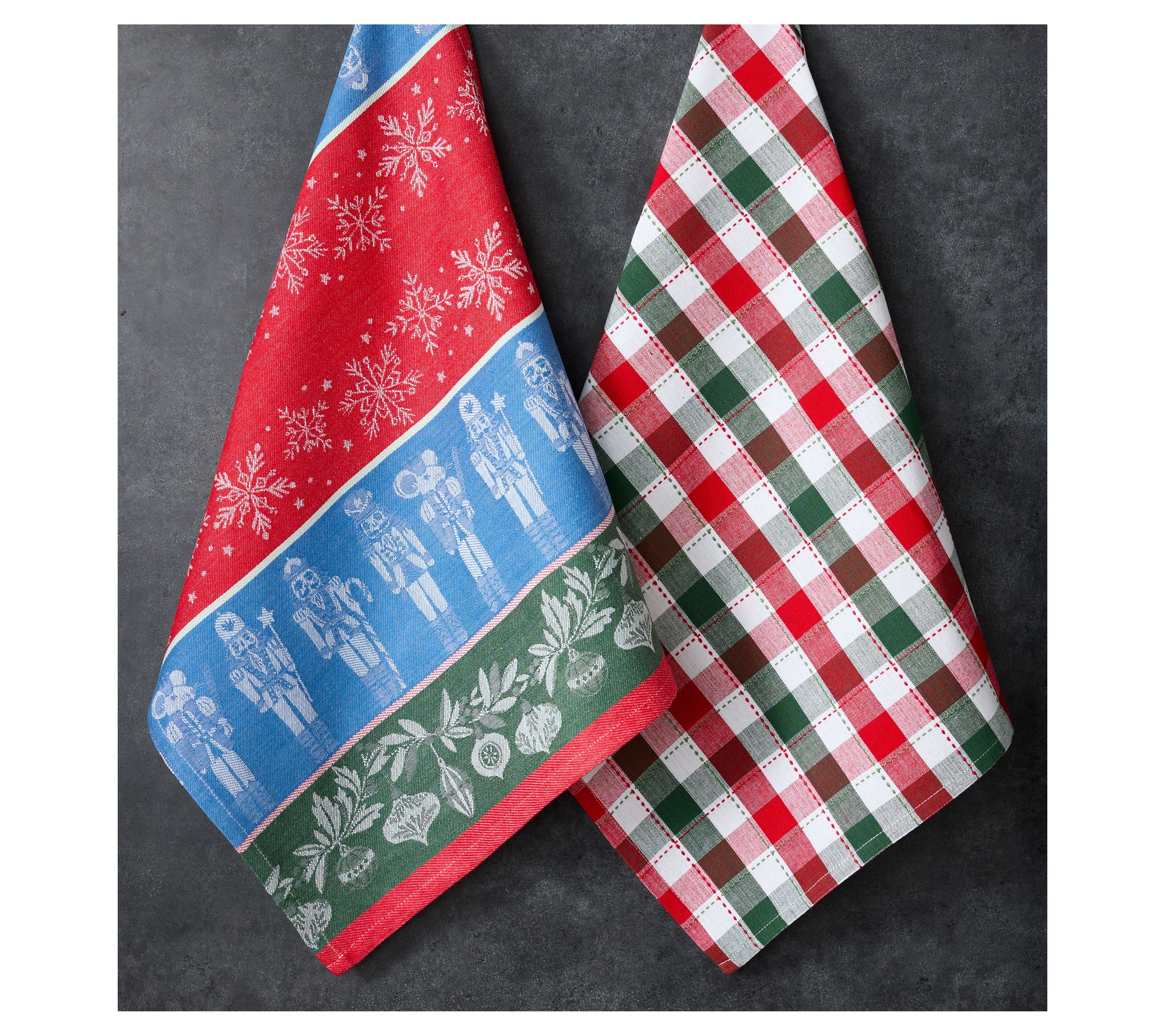 Whether you're tidying up after family brunch or adding a lively accent to your kitchen for the holidays, this festive set combines the cheer of traditional nutcrackers with a classic check design. Each towel is made to handle daily spills and messes while looking right at home draped over your oven handle. From Design Imports.