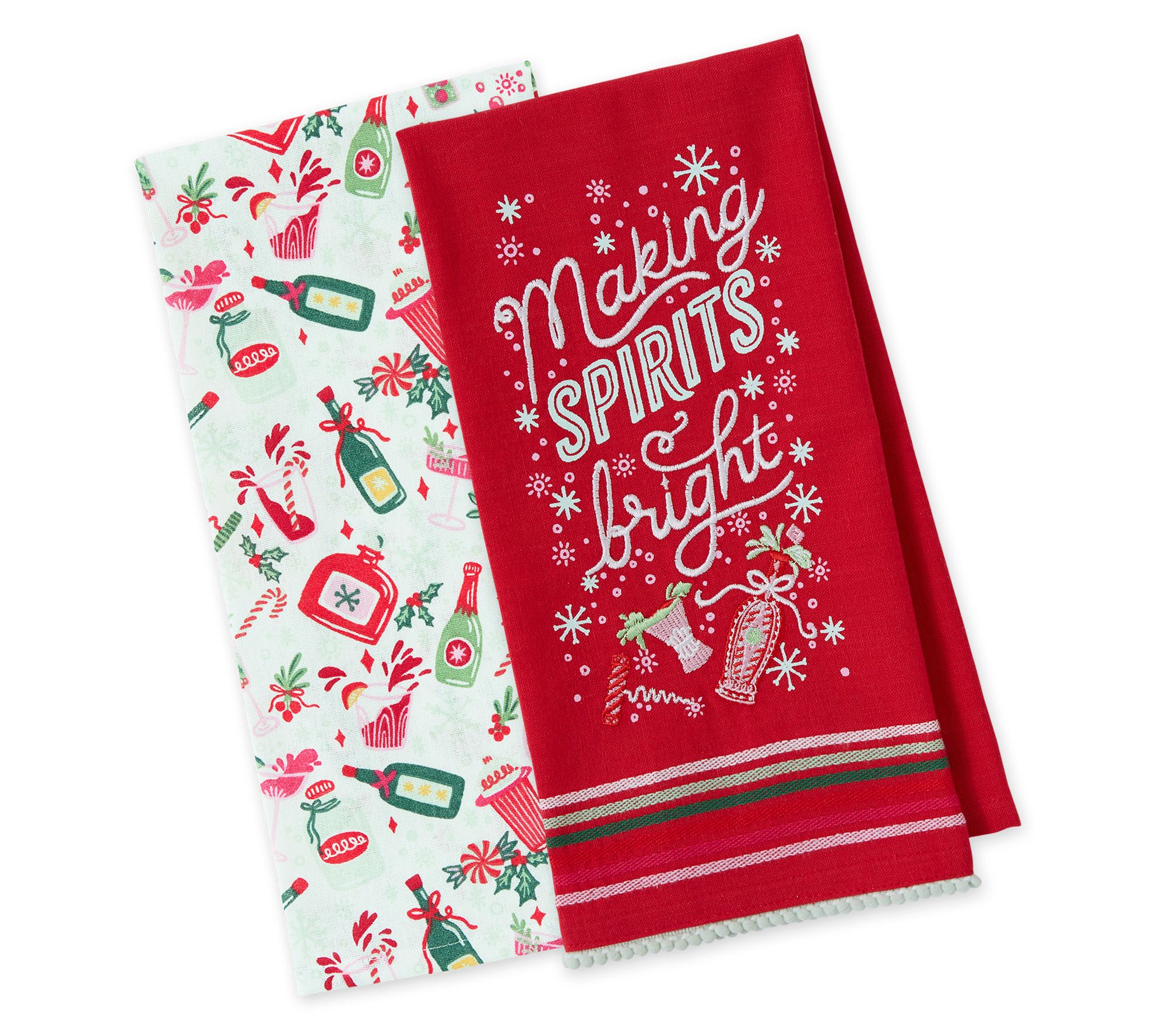 • Set includes one "Spirits Bright" embroidered towel and one "Holiday Spirits" print towel