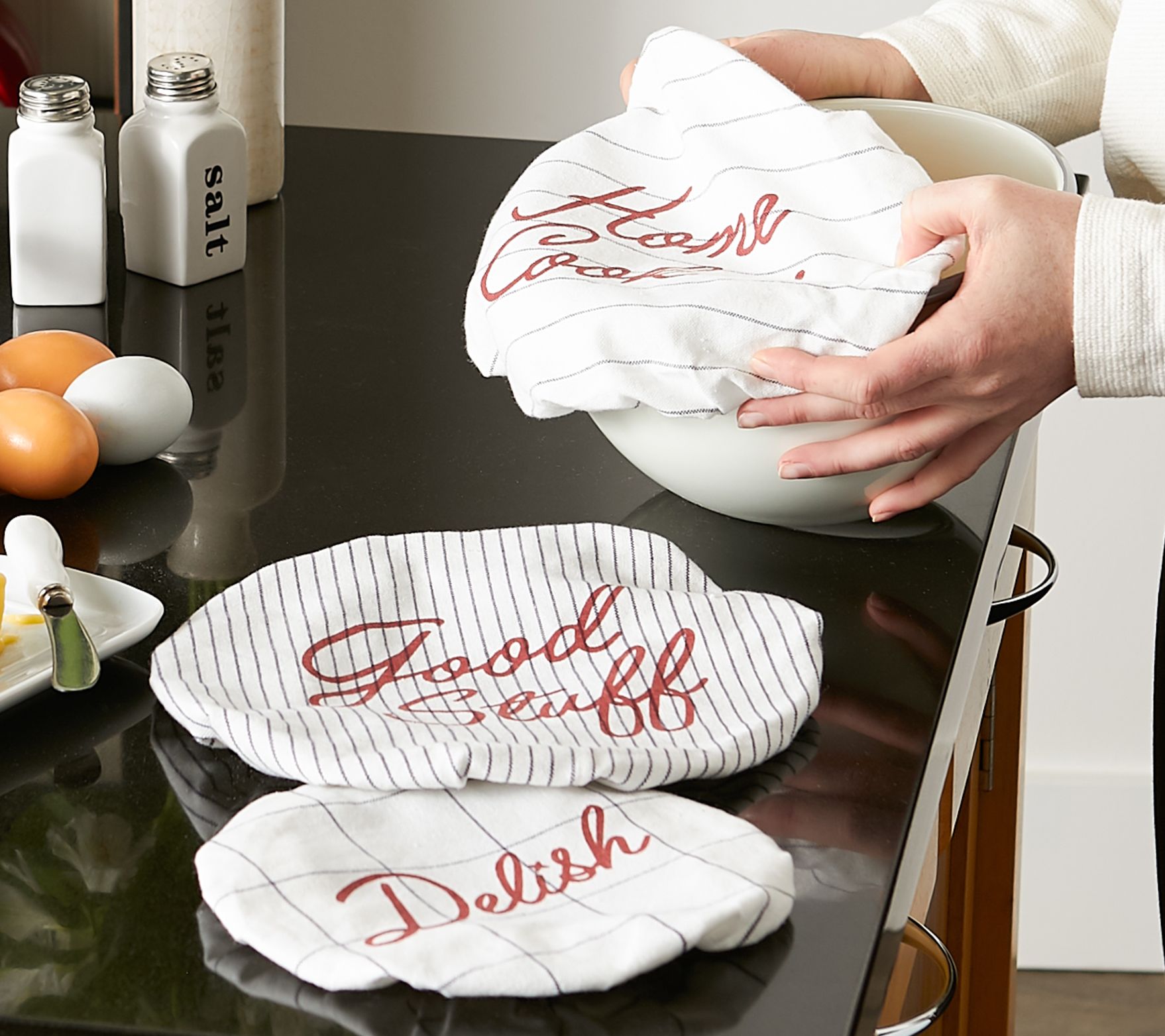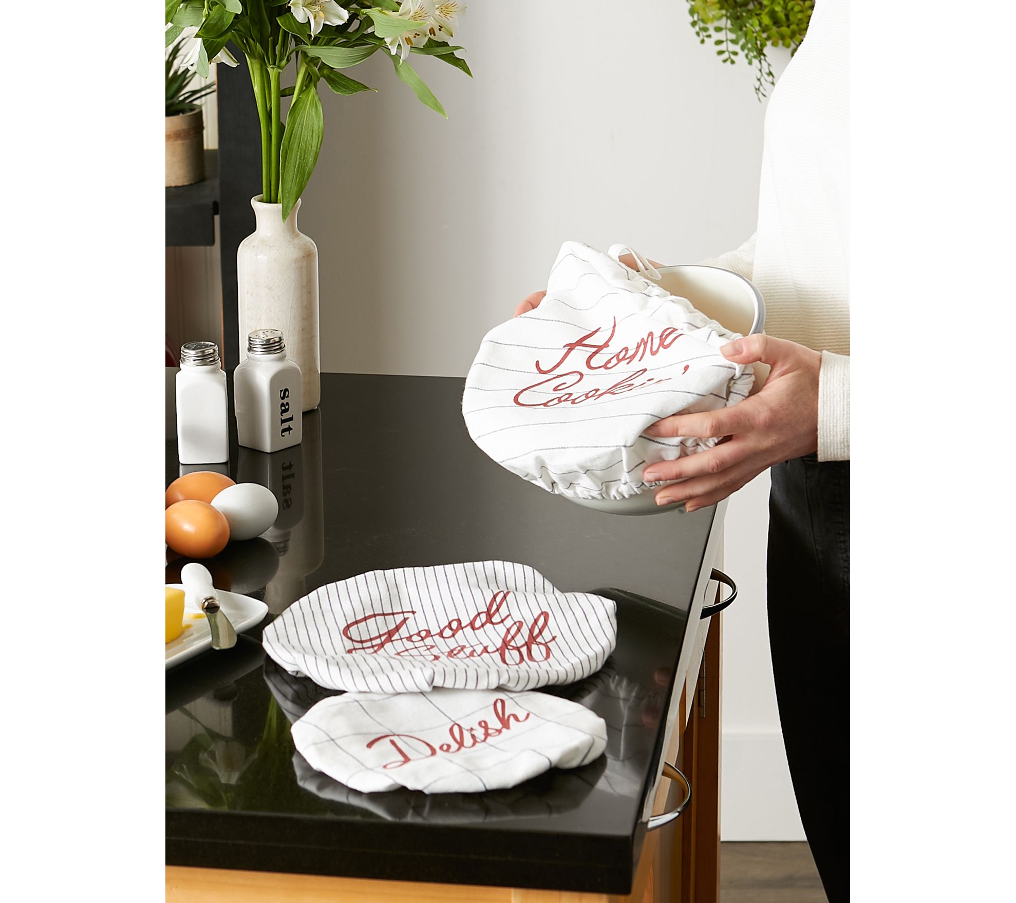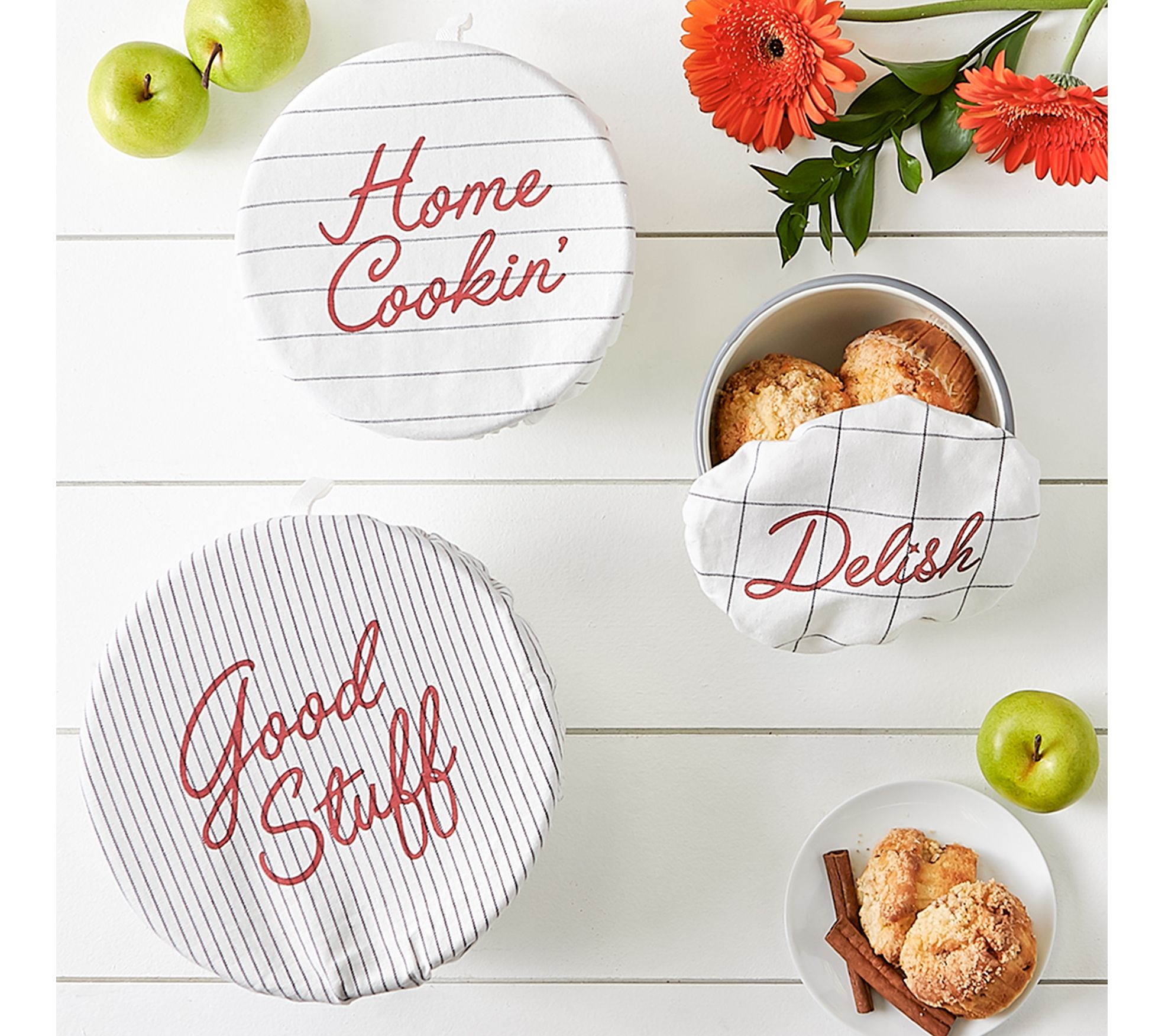 Tired of searching for that elusive lid that fits? These three reusable dish covers work well and feature cute sayings. These small, medium and large diameter lids have elastic openings to fit over bowls. From Design Imports.