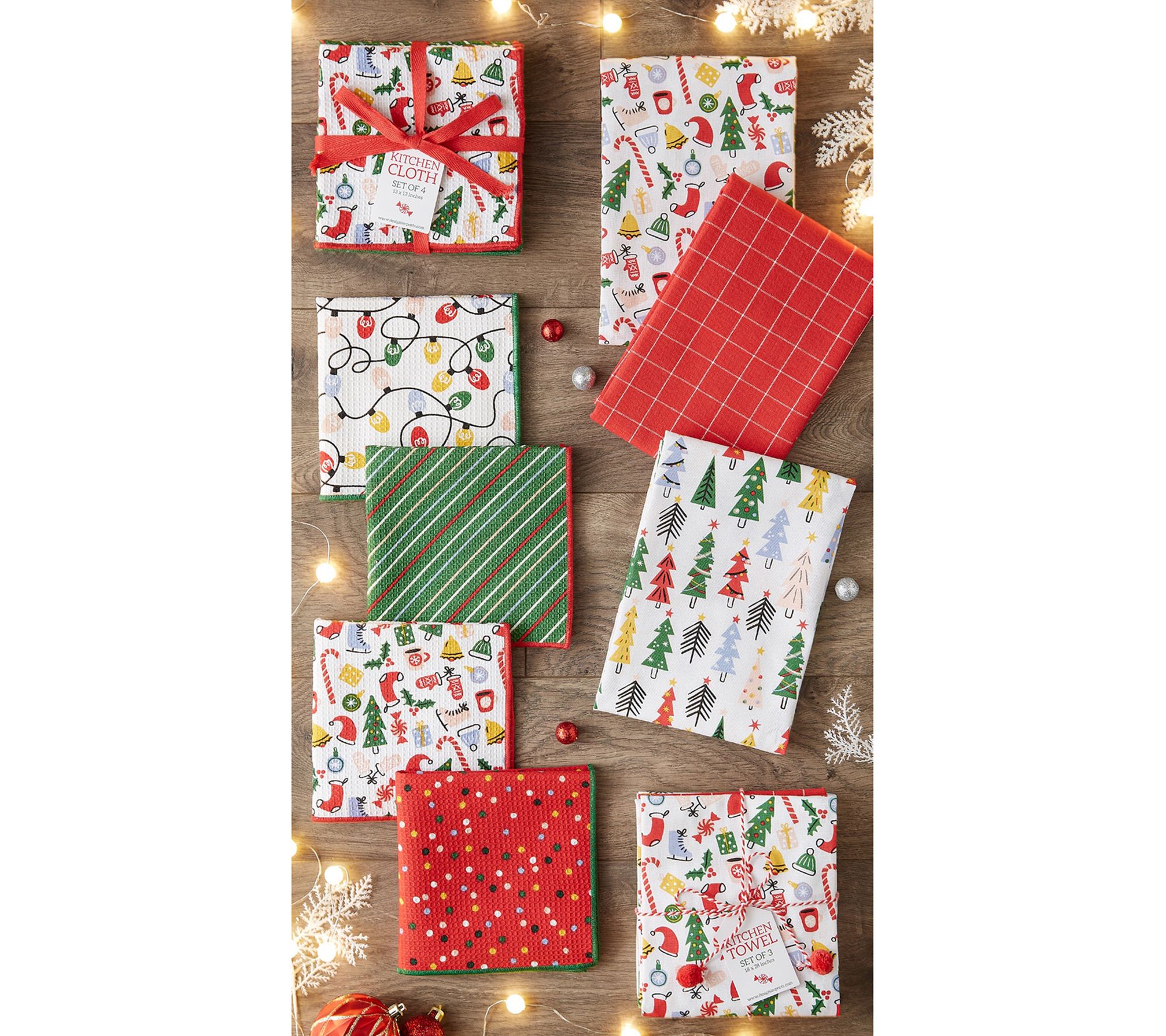 Bring a festive touch to everyday chores with these cheerful kitchen towels. This set provides three different designs in soft cotton, ideal for brightening up your cooking space or tackling spills with style. Arriving tied together with a decorative rope and pom poms, they make a delightful gift or a playful update to your own kitchen. From Design Imports.