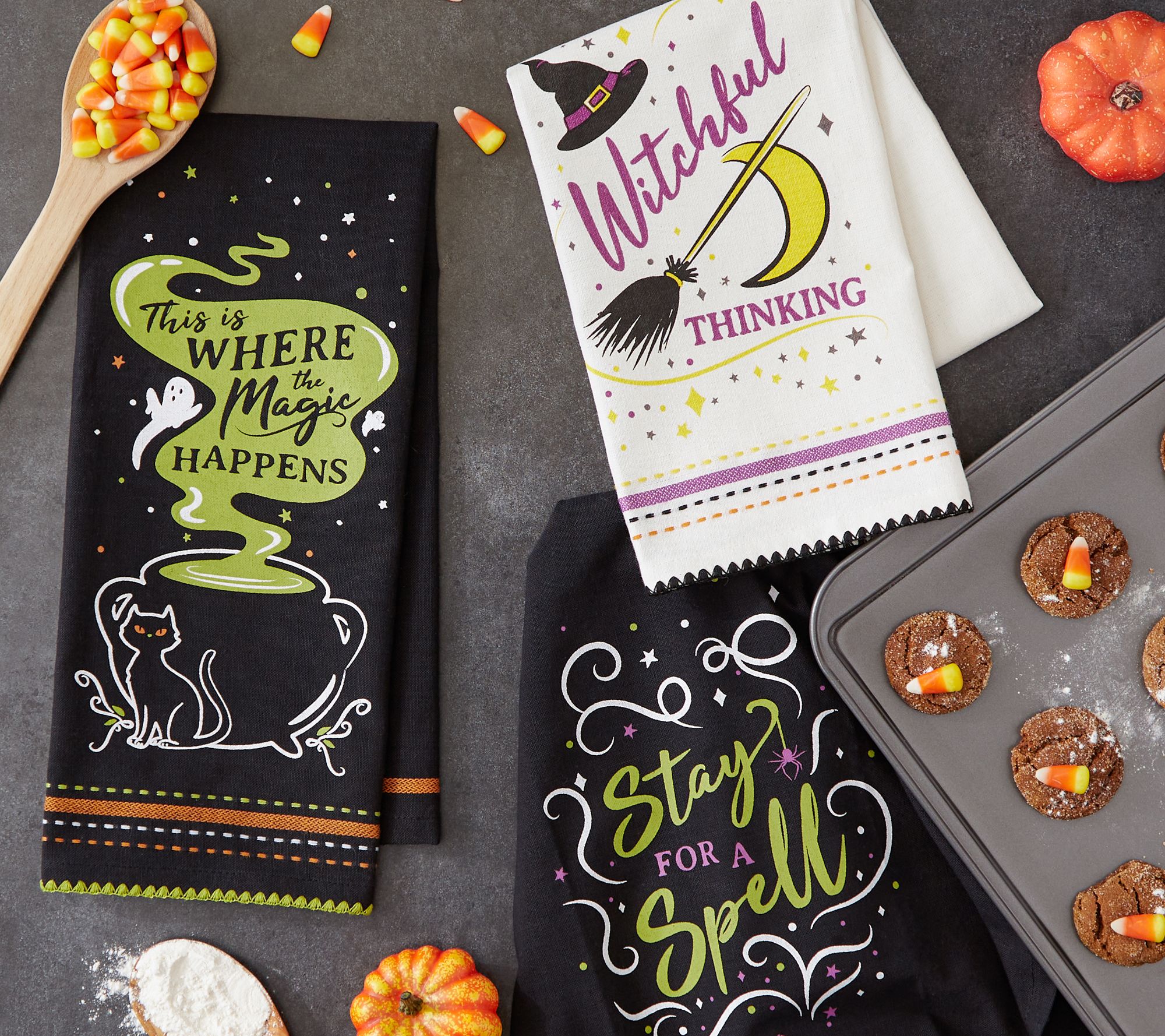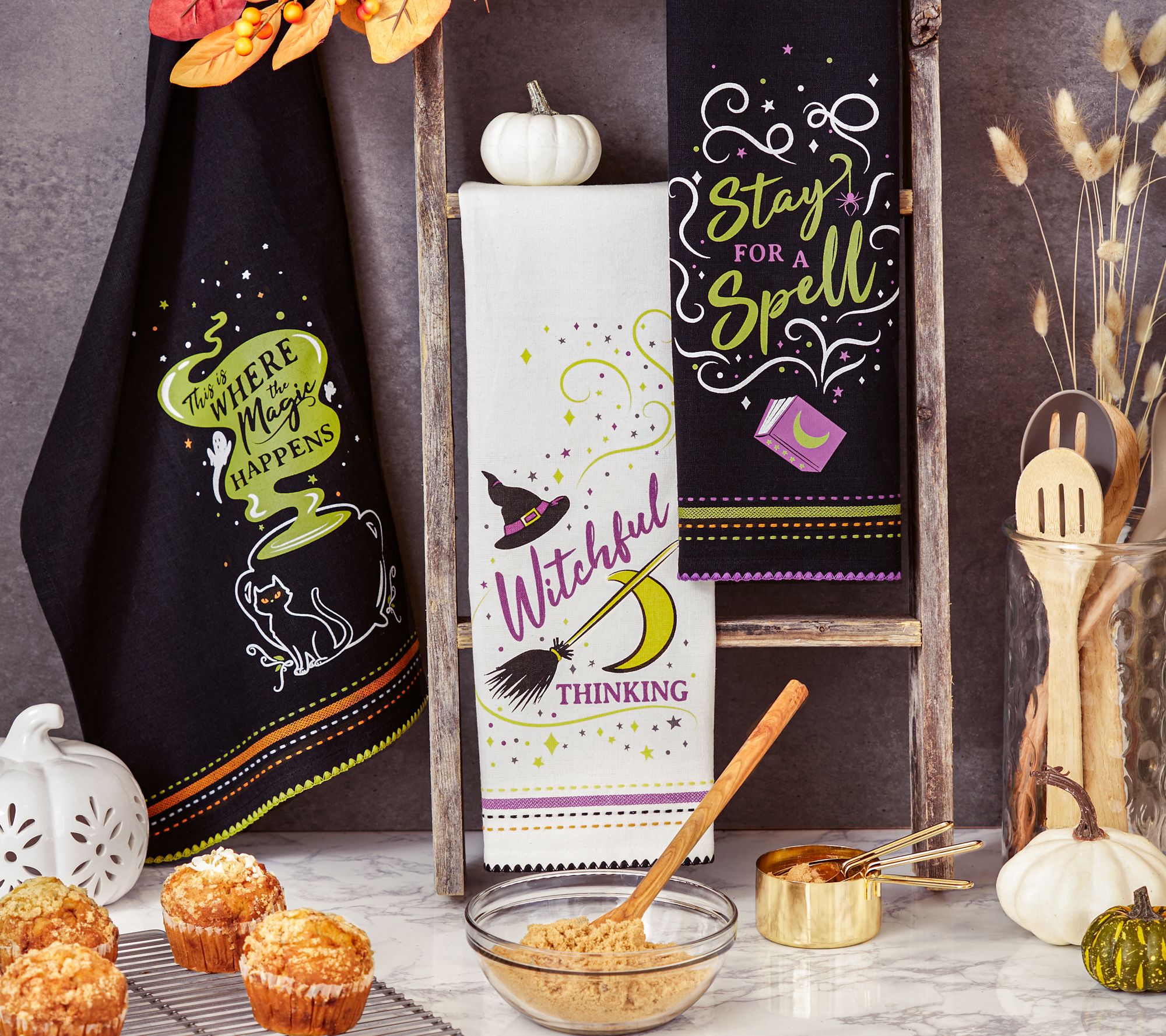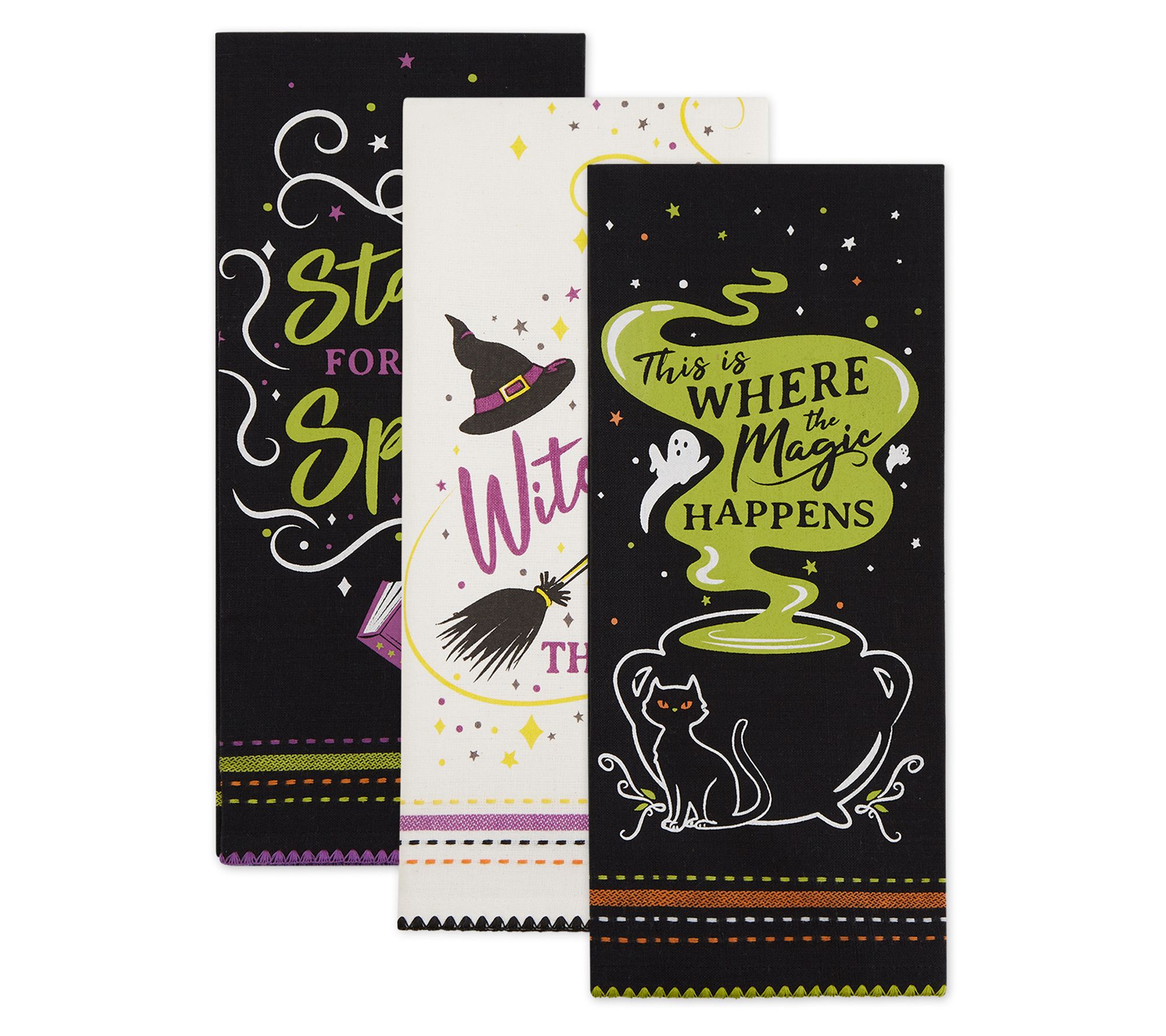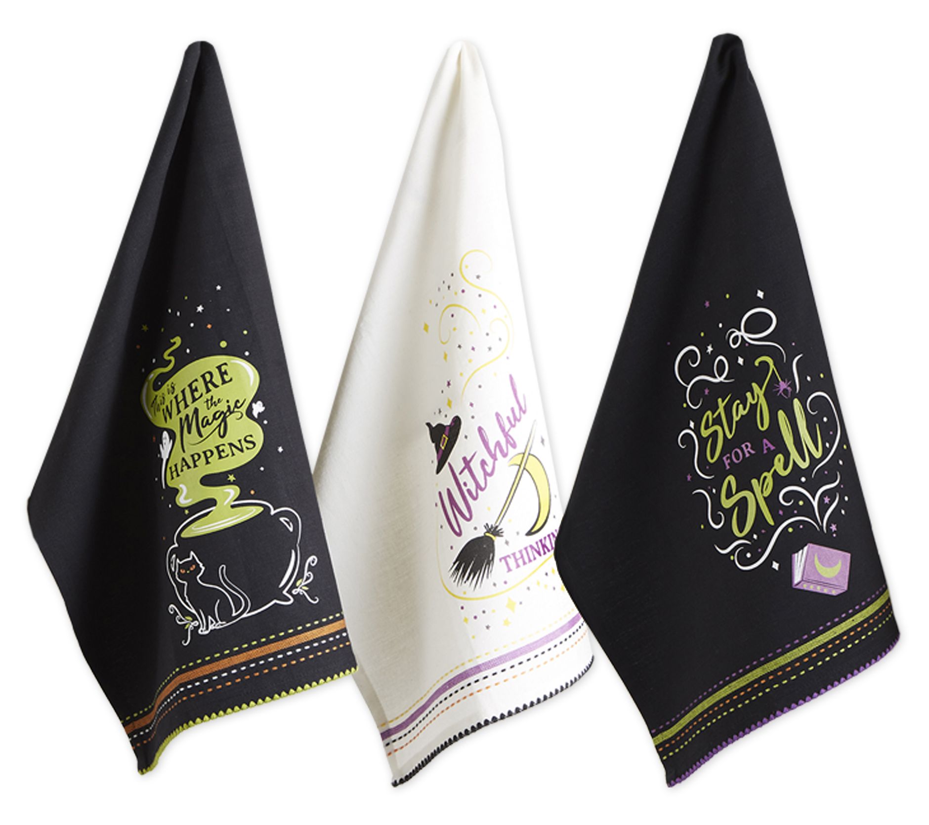 Perfect for use in the kitchen while cooking, baking, or doing dishes, this coordinated kitchen towel set features Stay for a Spell, Witchful Thinking, and Where the Magic Happens designs. From Design Imports.