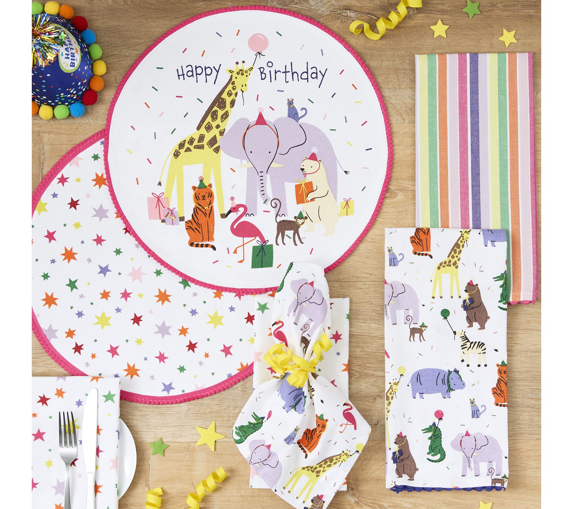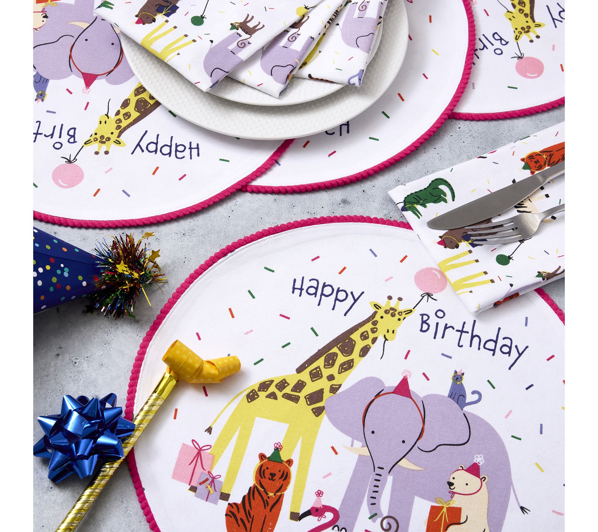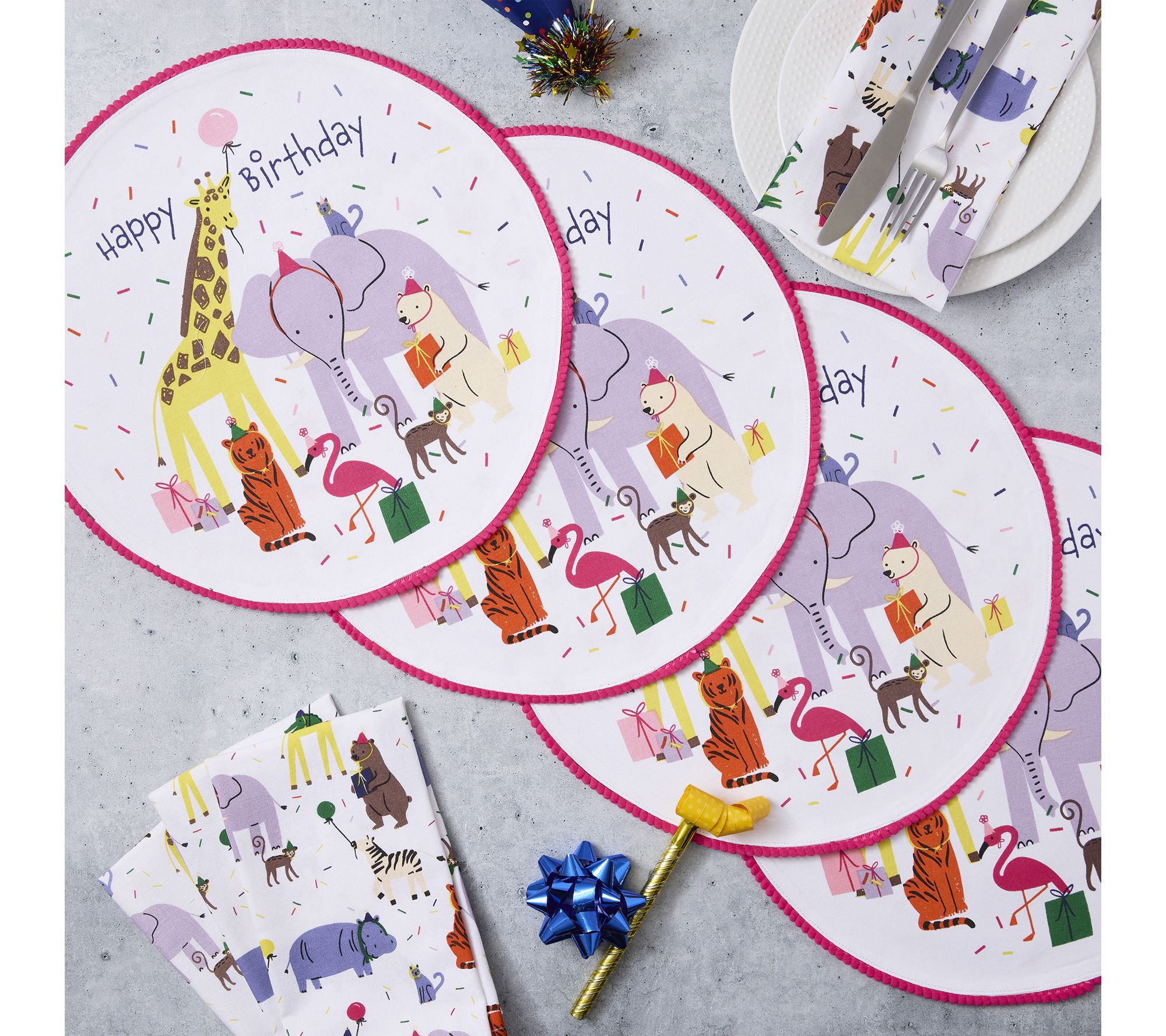 Brighten up mealtimes with these playful animal party placemats, designed to spark smiles at every gathering. Whether it's a weekend lunch or a festive birthday dinner with kids, the cheerful pompom trim and vibrant design add a touch of fun to your table setting. From Design Imports.