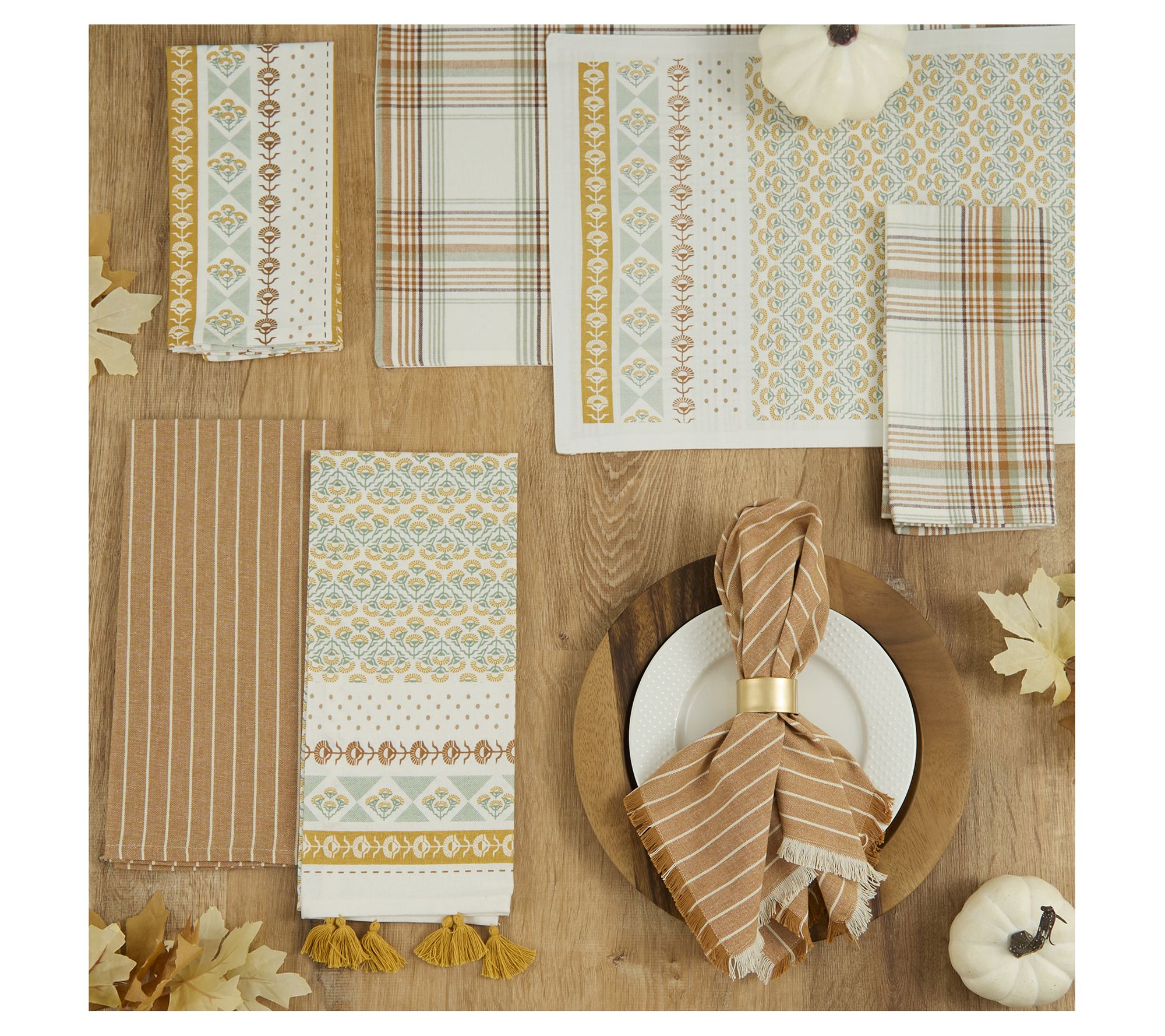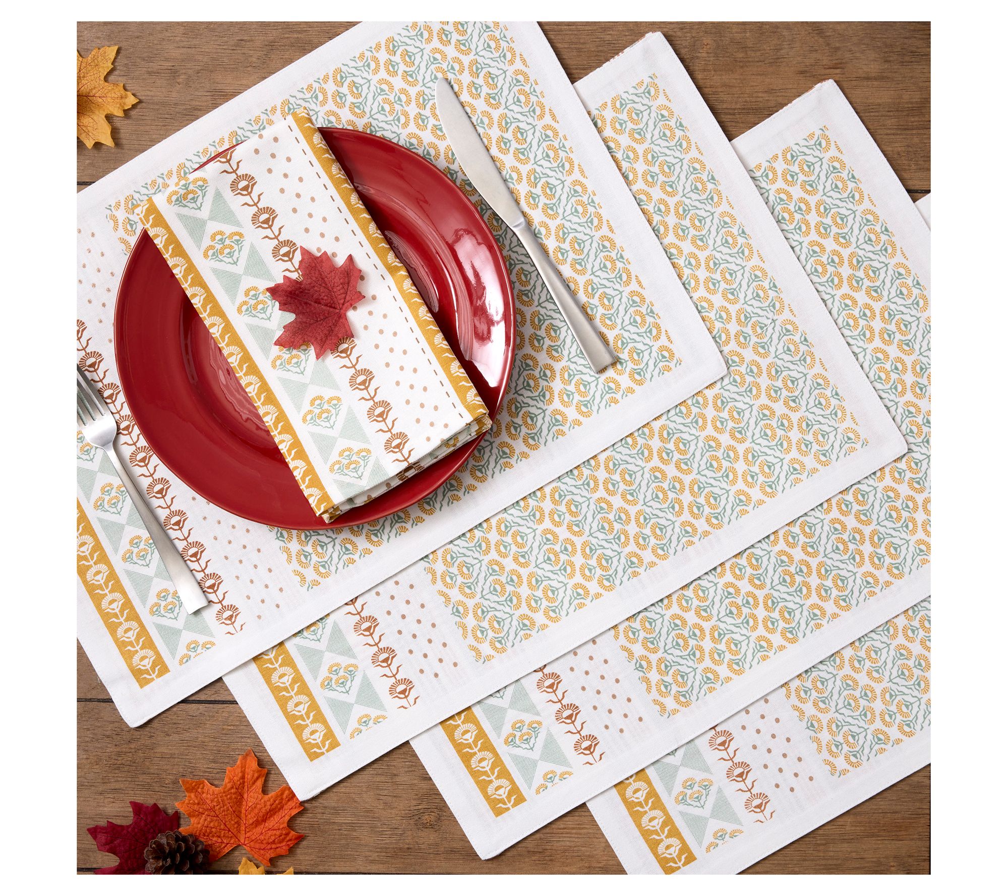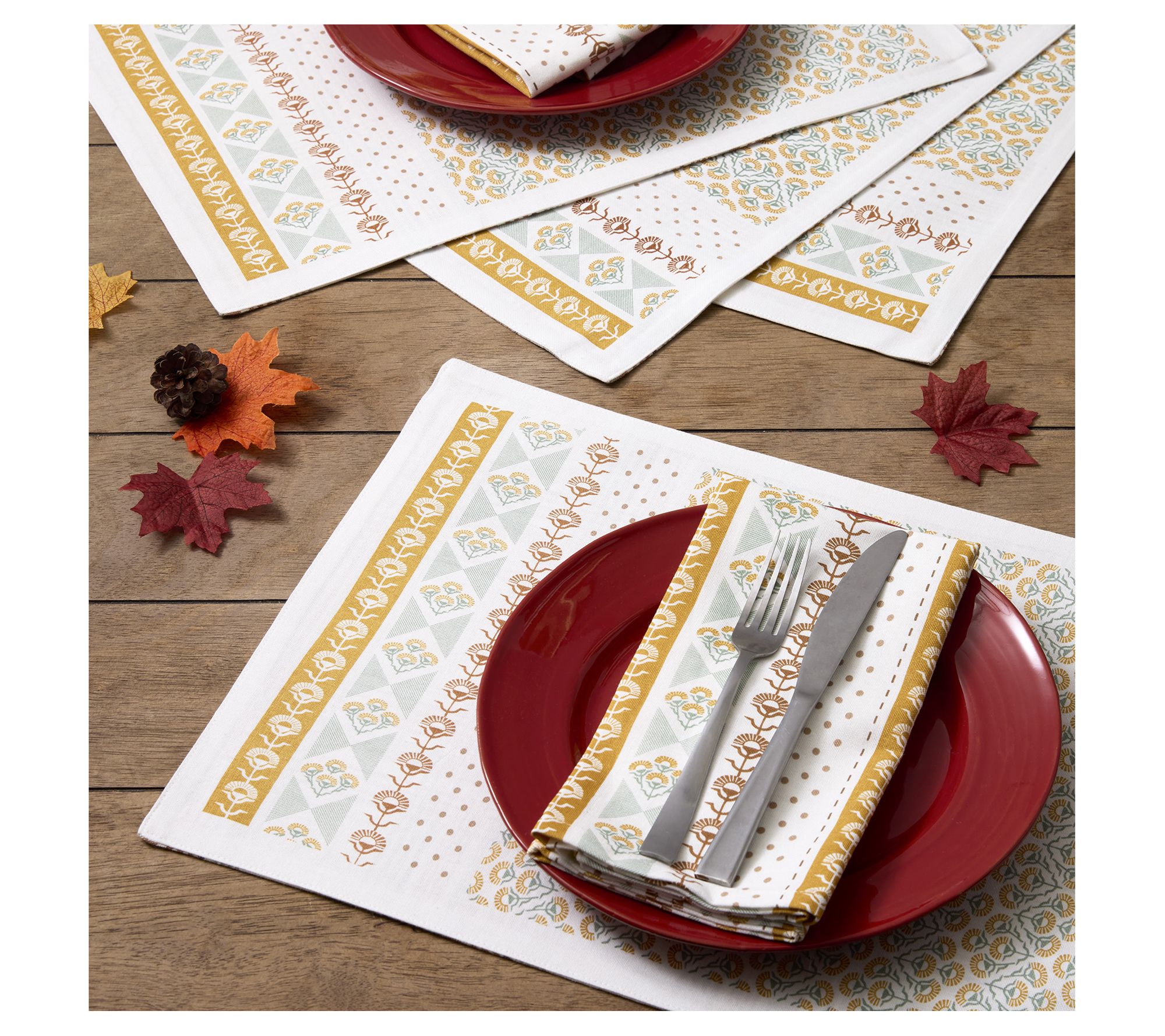 Set an inviting table for gatherings big or small with these Golden Gardens printed placemats. Soft 100% cotton with cozy plaid lining adds a festive touch for meals from harvest through Thanksgiving, while the flate weave design makes every setting feel special. From Design Imports.