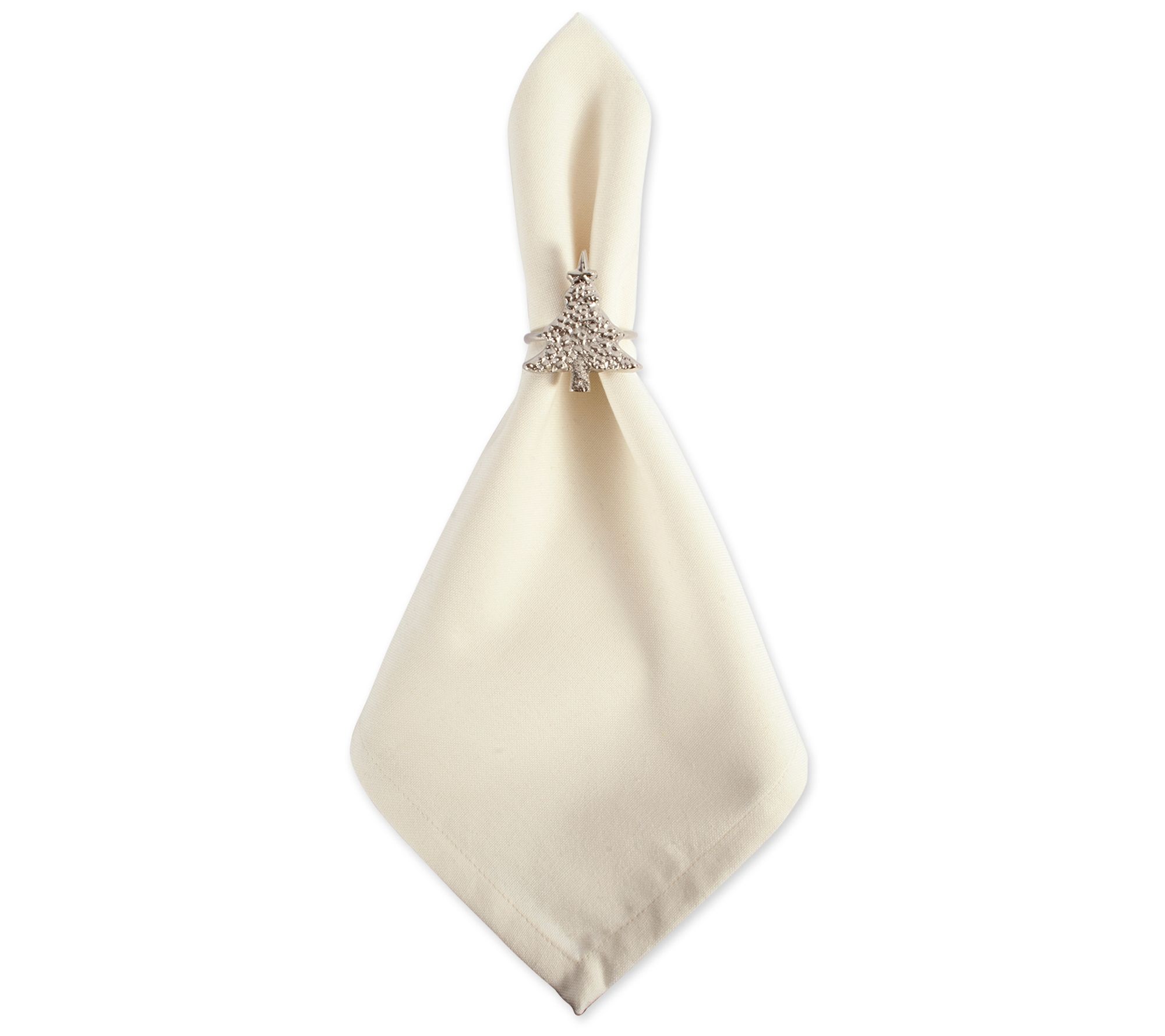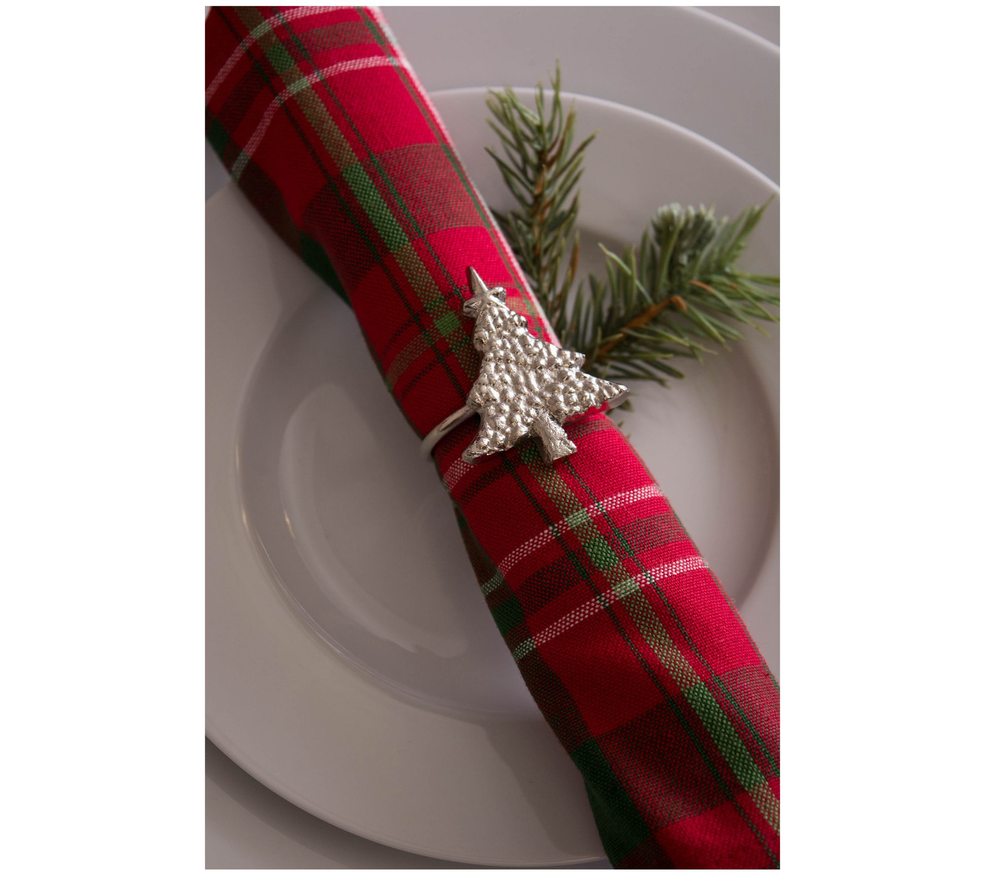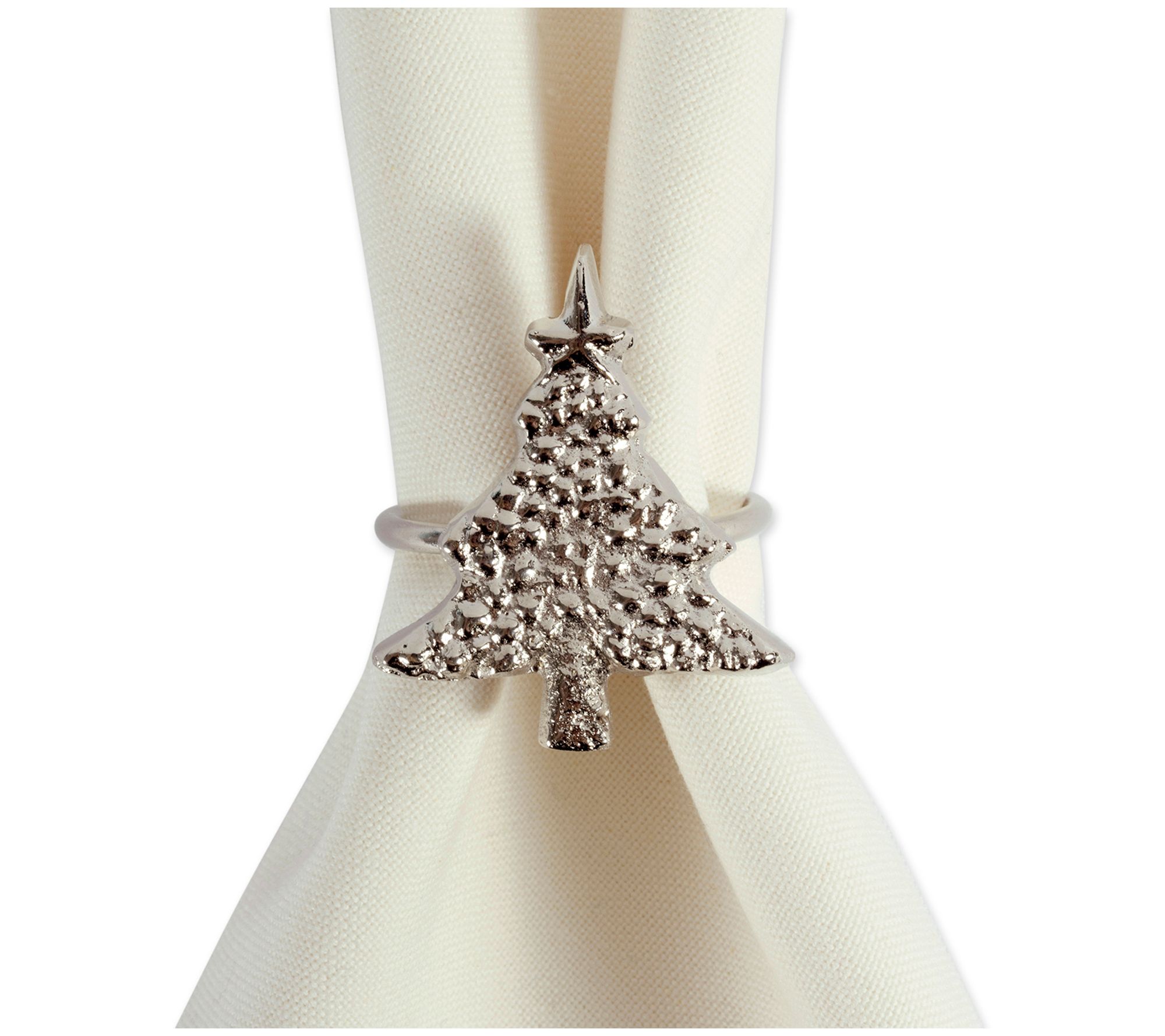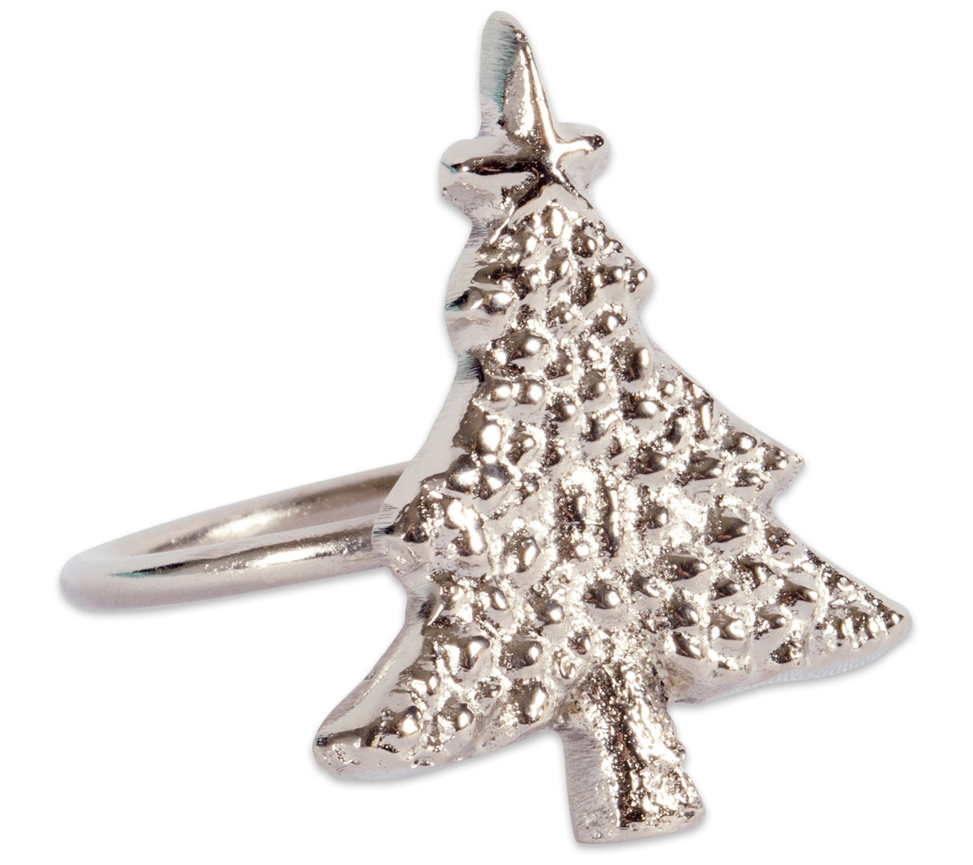 Enhance your holiday dining experience with this set of six Christmas tree napkin rings. These elegant napkin rings, crafted from casted brass with a polished silvertone finish, add a touch of sophistication to any table setting, whether you're hosting a formal affair or a casual gathering. From Design Imports.