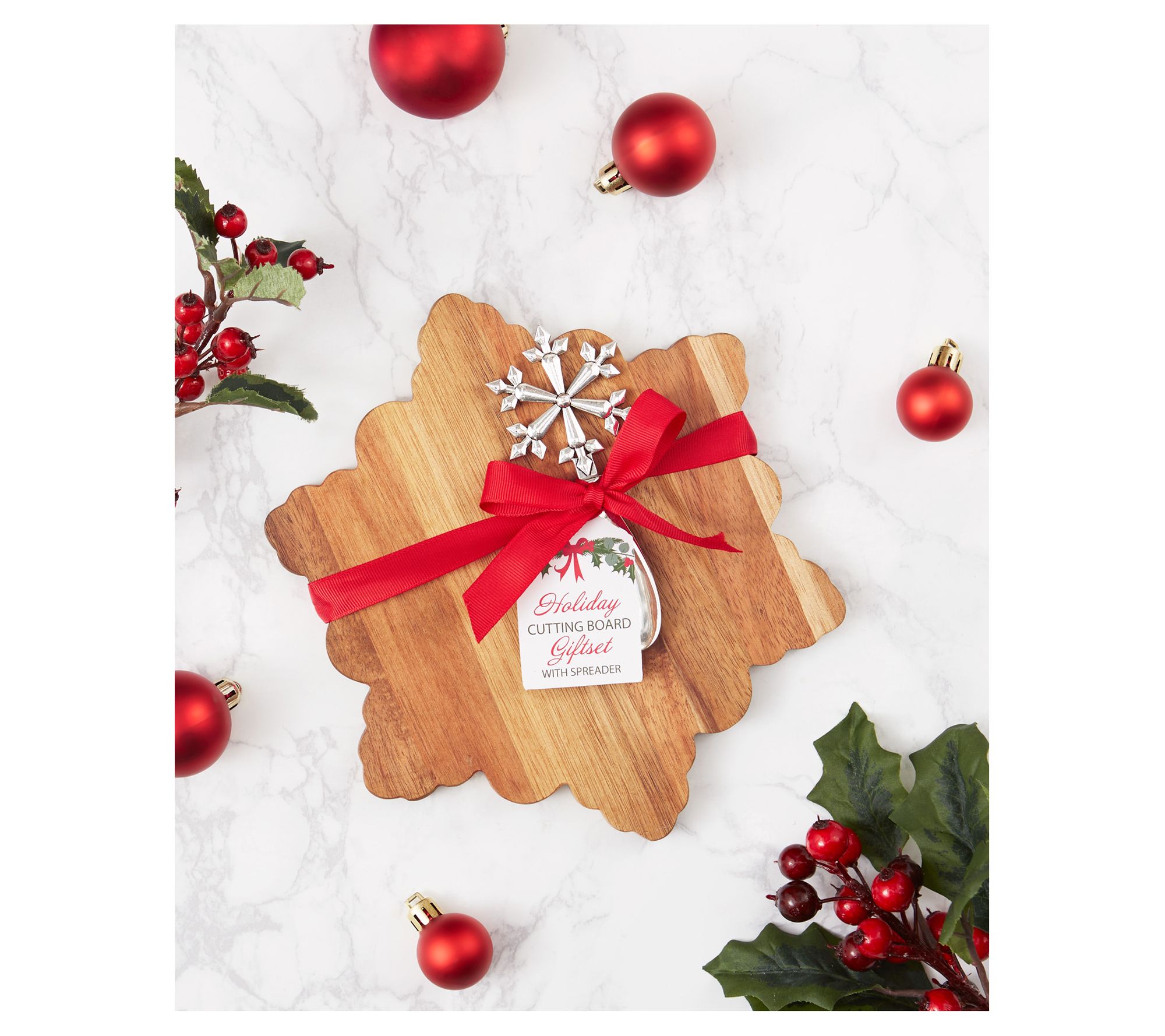 Whether you're hosting a cozy winter brunch or enjoying a festive cheese board fireside, this set brings seasonal charm and function to your table. A beautifully crafted acacia wood board pairs seamlessly with a snowflake-inspired zinc alloy spreader, all ready to gift with a cheerful red grosgrain ribbon. From Design Imports.