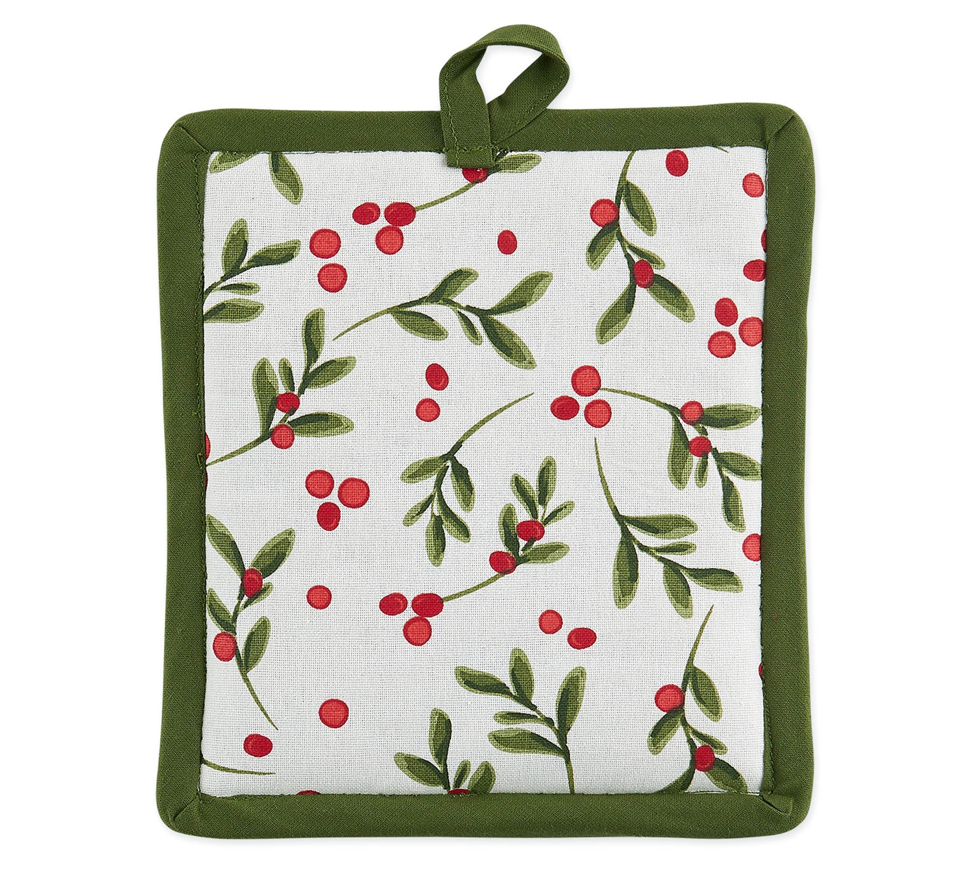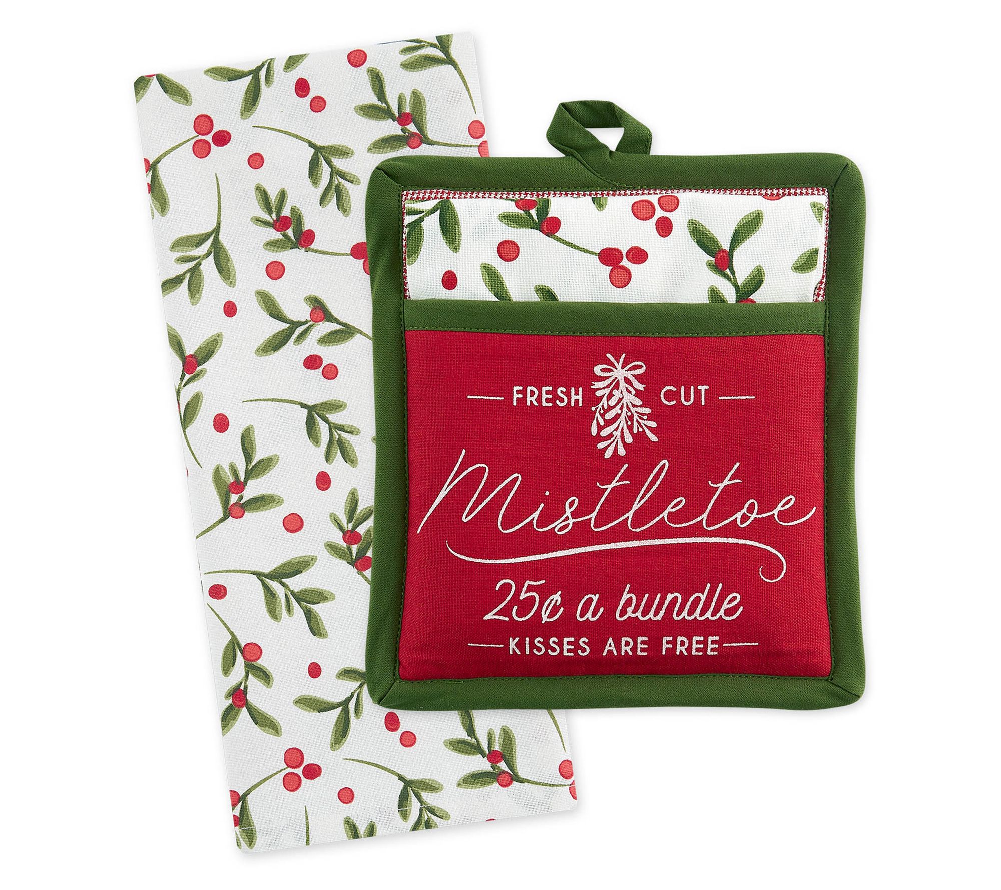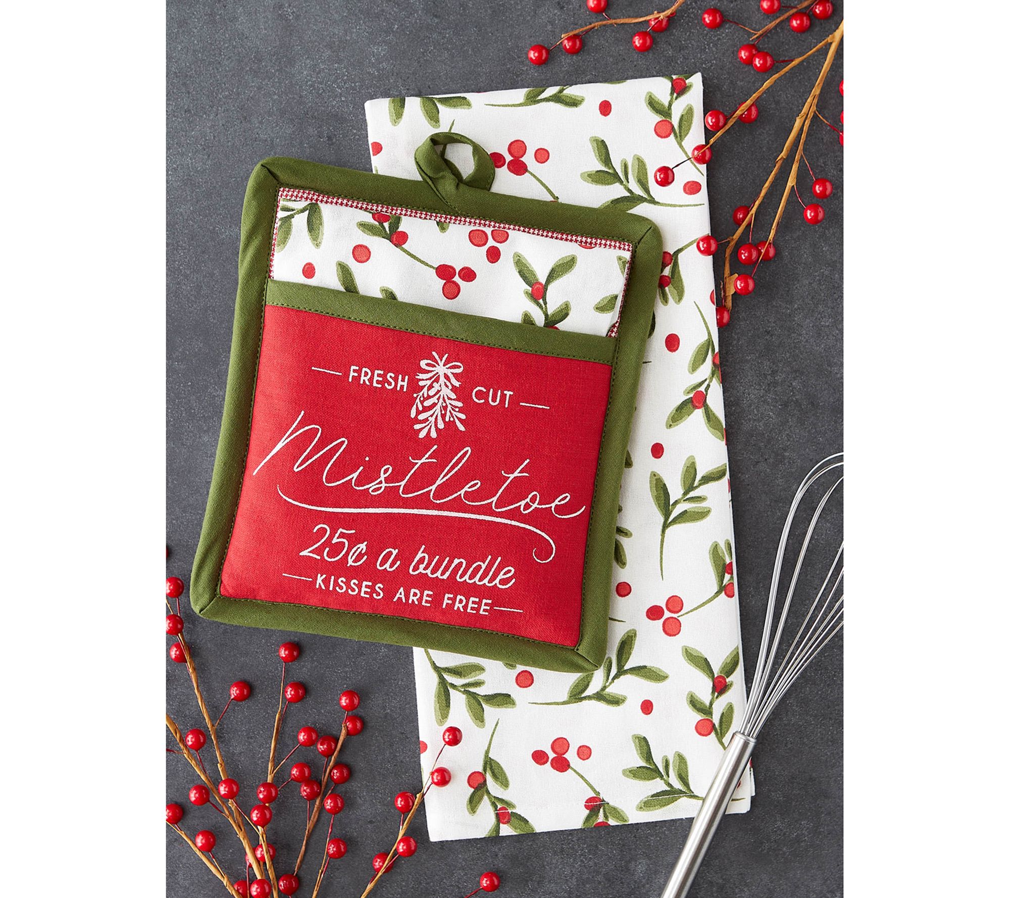 Holiday baking days just got merrier with this Under The Mistletoe potholder gift set, featuring a cheerful kitchen towel and perfectly sized potholder. Coordinated cotton textures and festive prints bring extra warmth to your seasonal cooking or make a thoughtful hostess gift for holiday gatherings. From Design Imports.