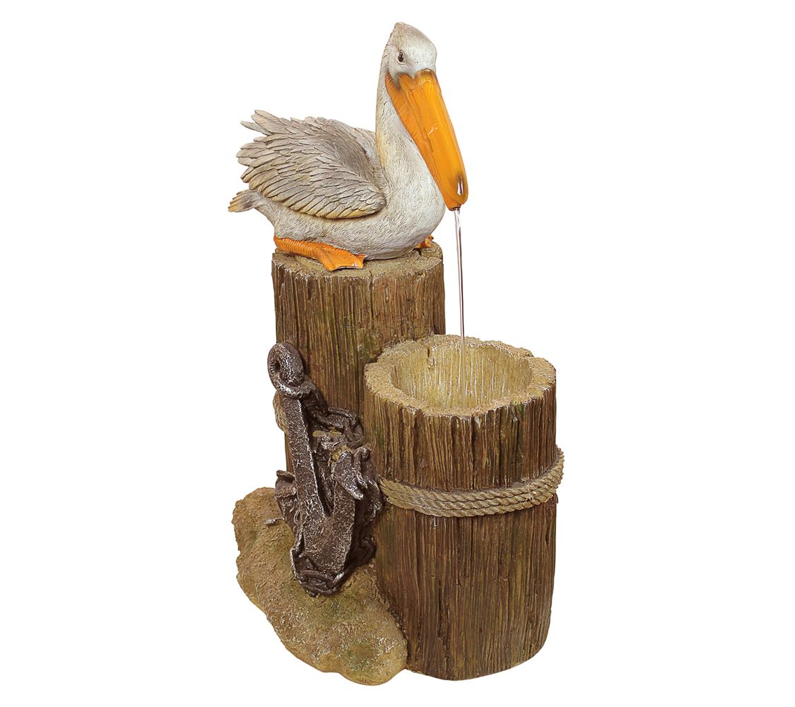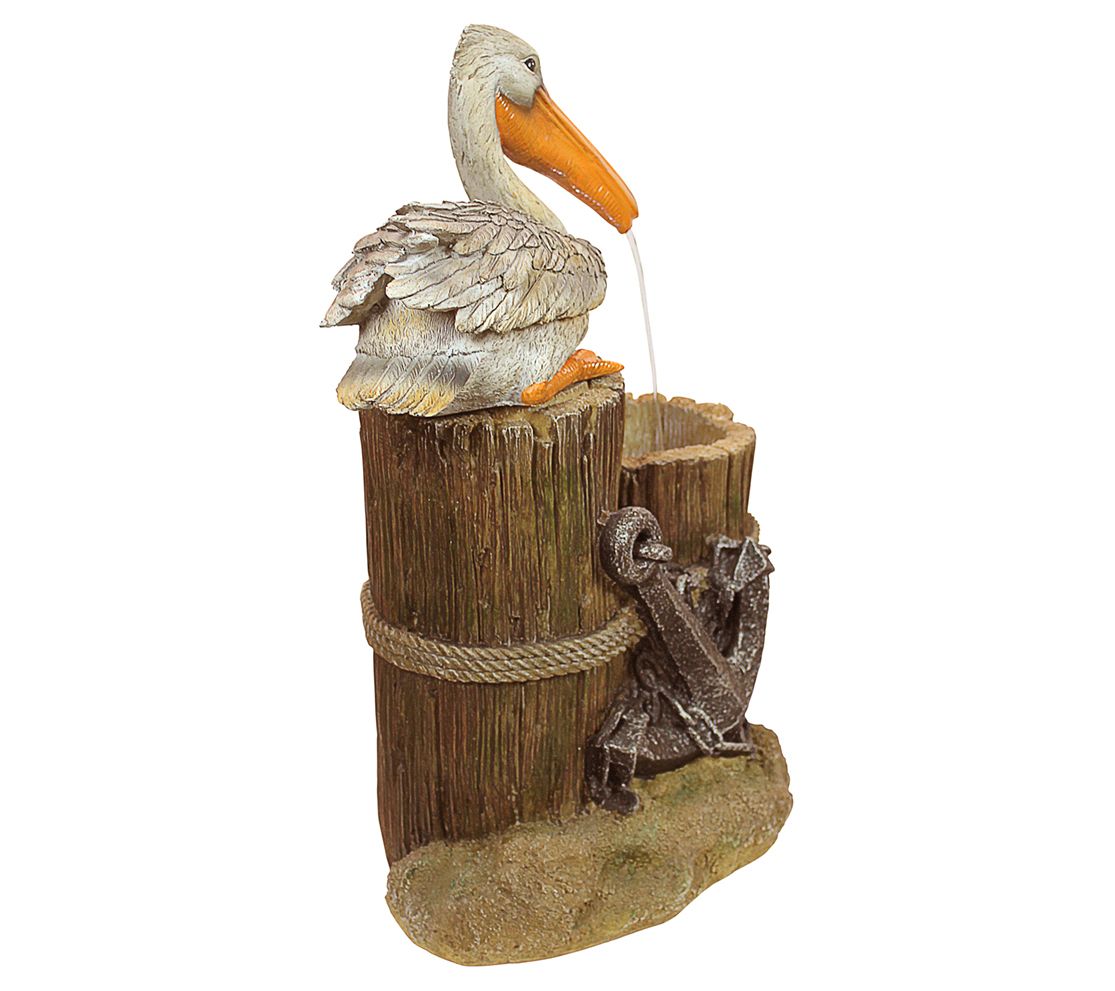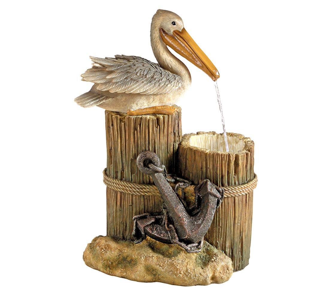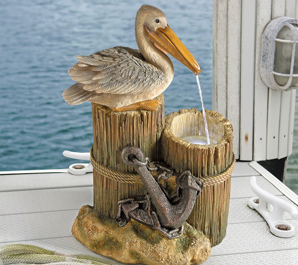 Welcoming the neighboring birds with its tranquil cascading waterfall, a peaceful perching pelican rests comfortably in your garden. This nautical themed resin fountain sculpture features faux wood, decorative rope and anchor design, and an LED illumination to the sparkling stream. From Design Toscano.