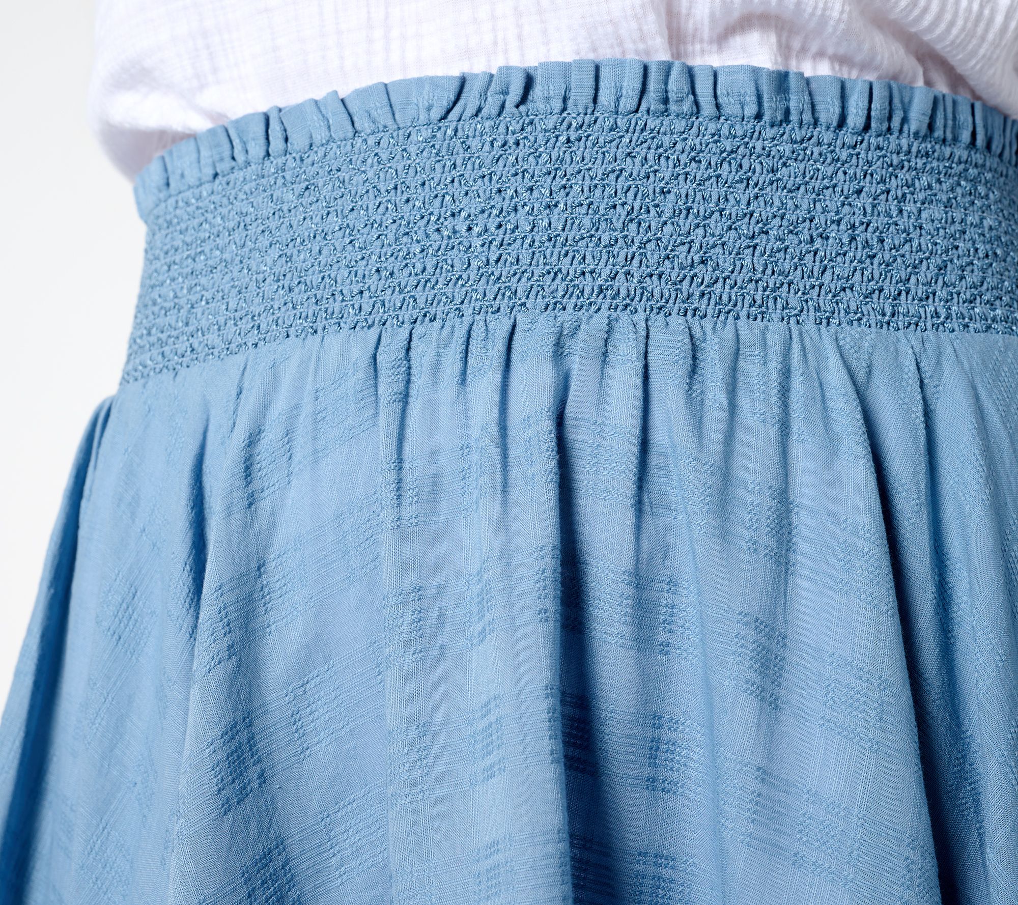 Features: decorative smocked waistband, lace detail at hem and sides, handkerchief hemline