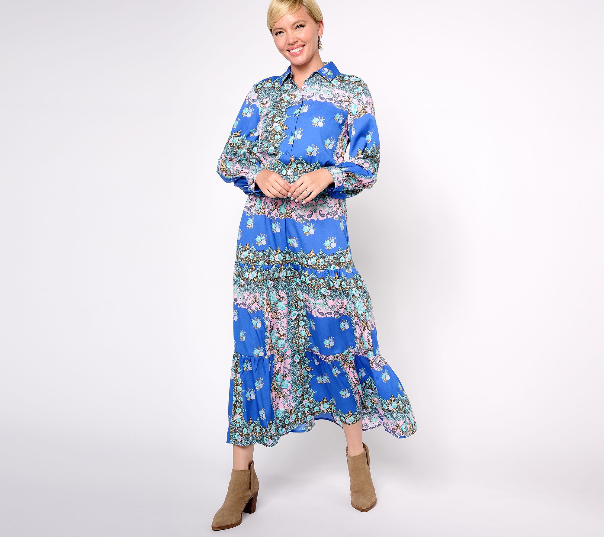 Features: printed, maxi length, collar, button-front closure to waist, full elastic waistline, tiered shirred skirt, long sleeves, vented button cuffs, bust darts, side-seam pockets