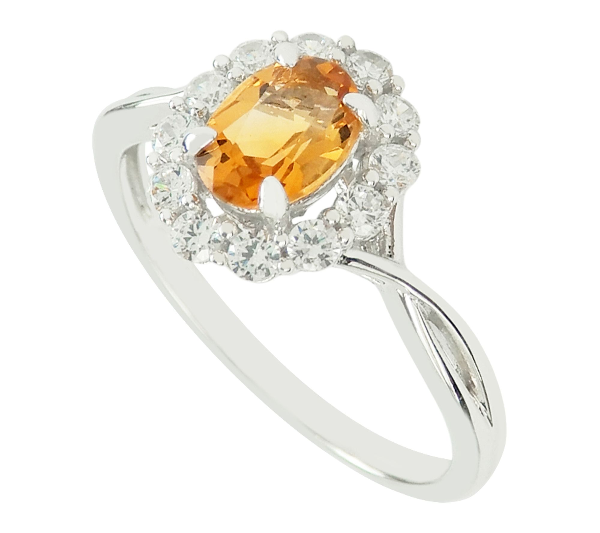 Sunny sparkle comes easy with this oval-cut halo ring -- whether you're brightening up daily denim or going all-out for a dinner date, its citrine center glows with golden warmth while shimmering Diamonique simulated diamonds dance around it. Prong settings and a polished sterling silver band create an irresistible look, ready to add joy to any occasion.