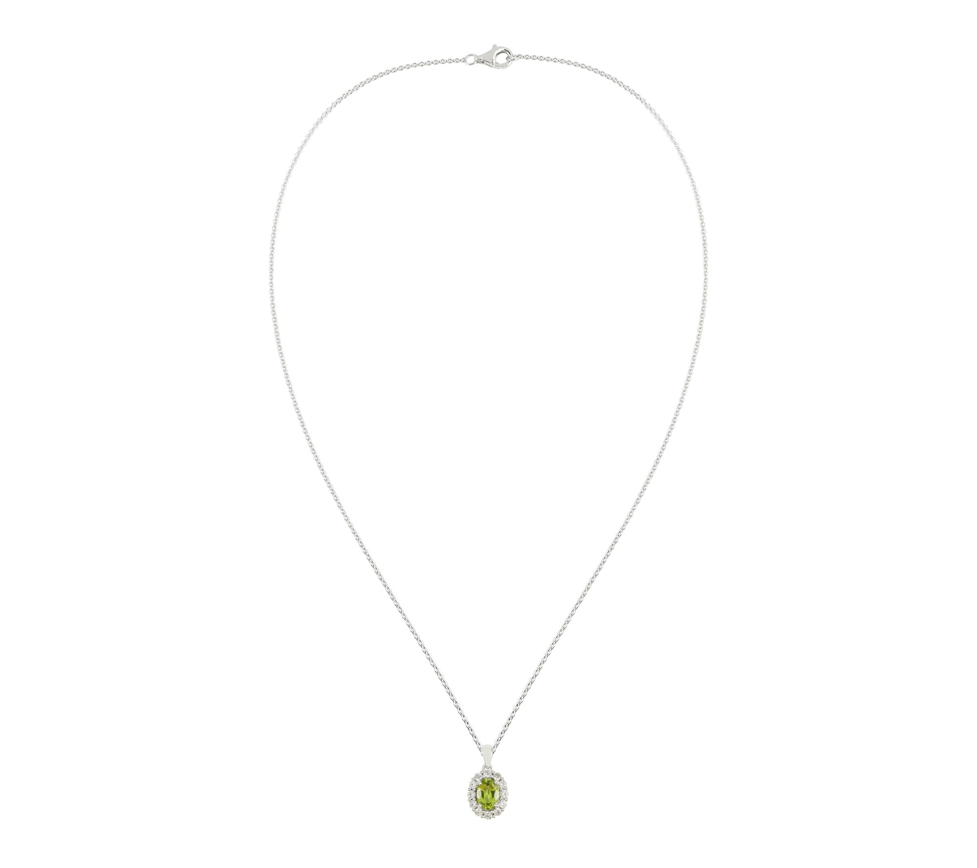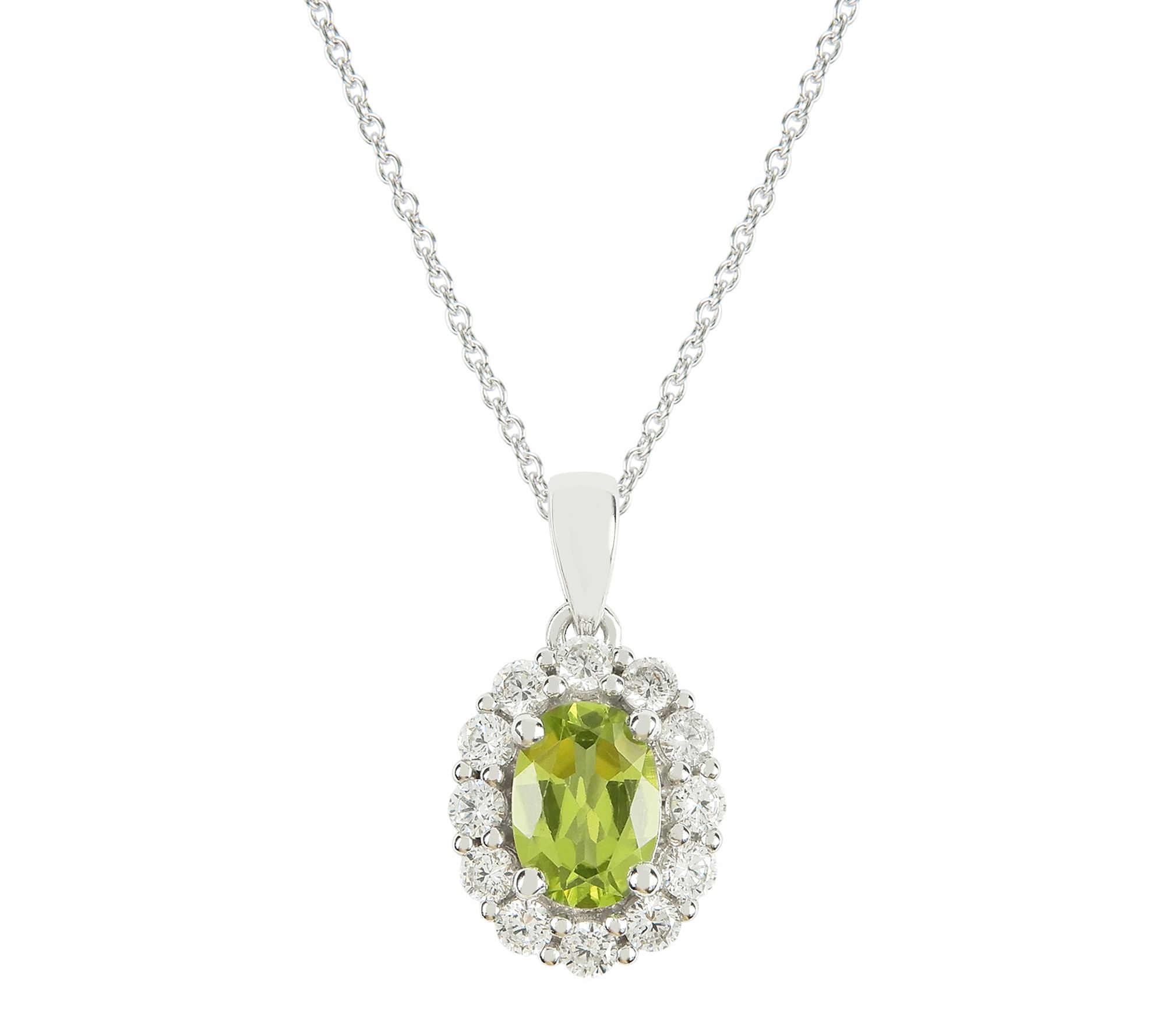 Add a touch of graceful color to your wardrobe with this pendant necklace, which pairs radiant peridot and sparkling Diamonique simulated diamonds in a refined halo design. Sterling silver and a high-polish finish highlight its brilliant stones, making it a beautiful accent for both weeknight dinners and special occasions.