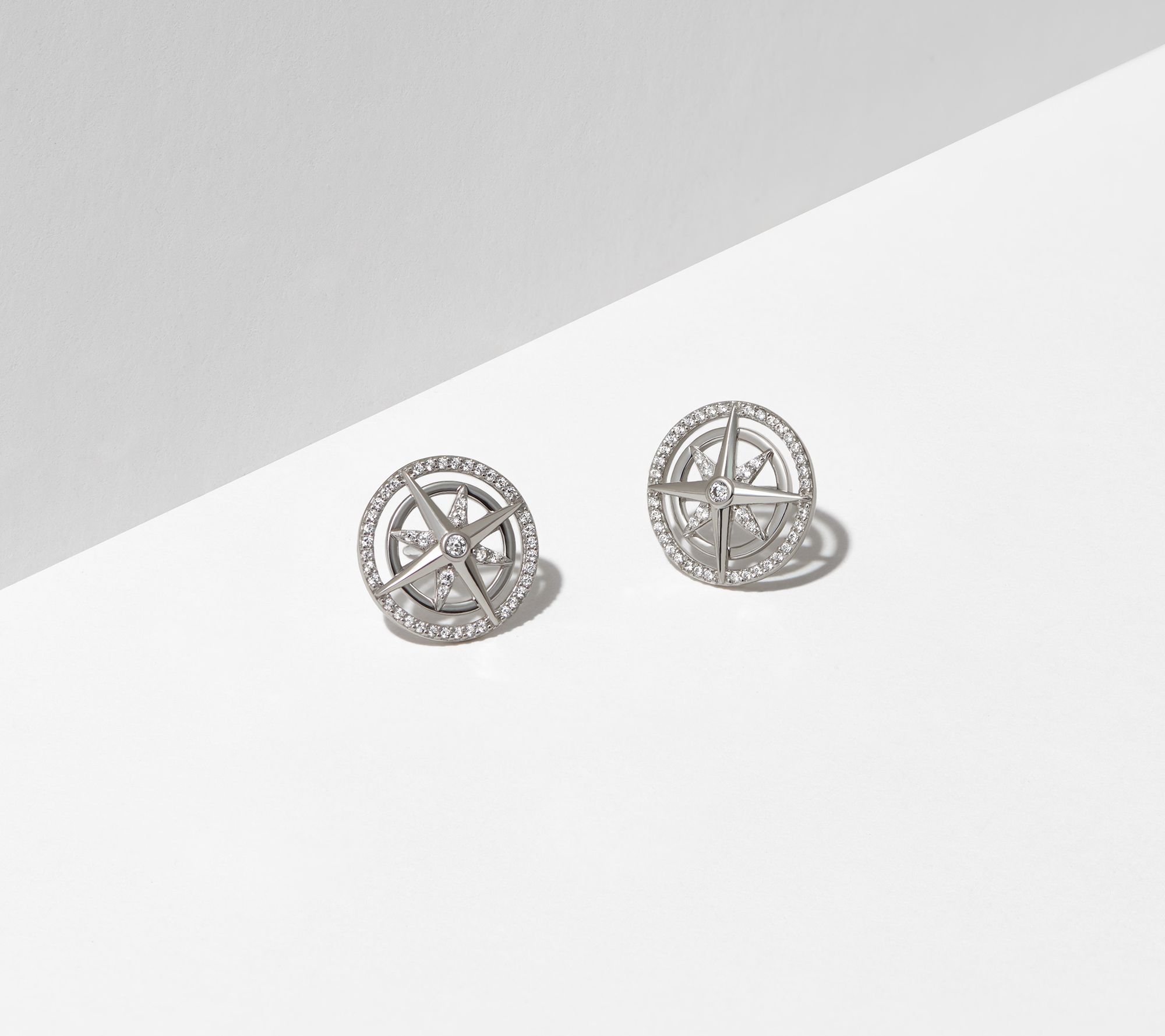 • North star disc studs with round-cut, bezel-set set Diamonique simulated diamonds; halo at star with round-cut, prong-set set