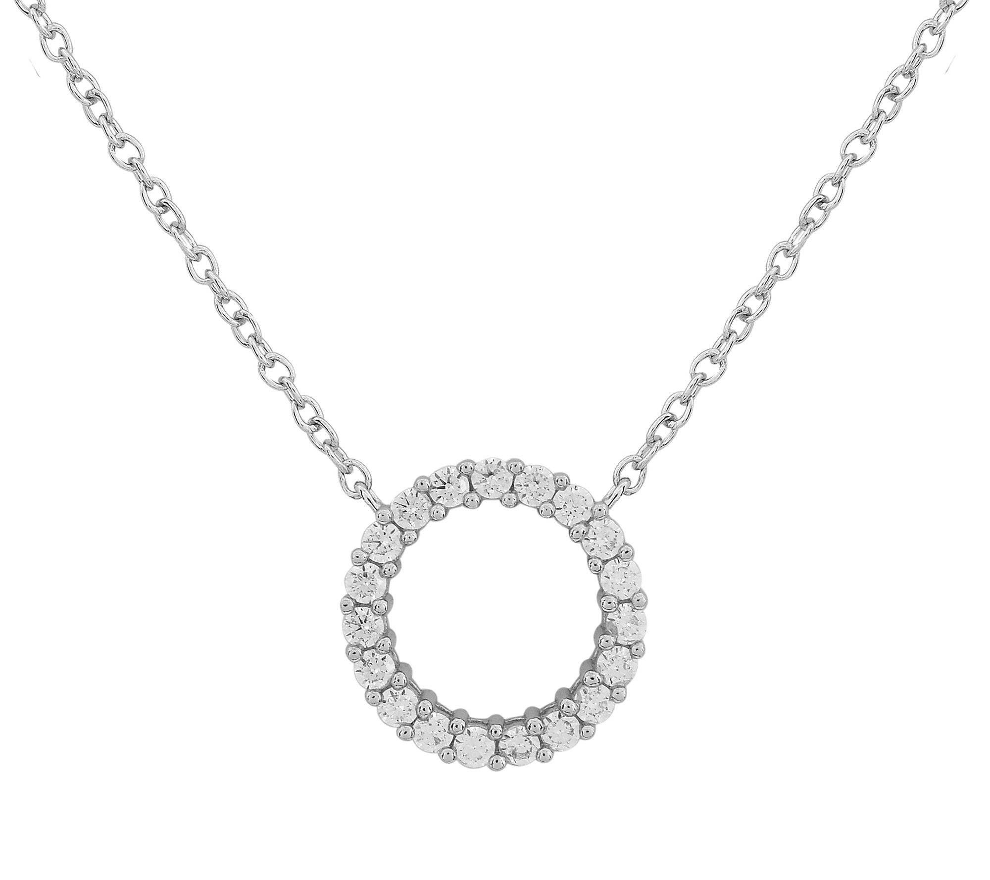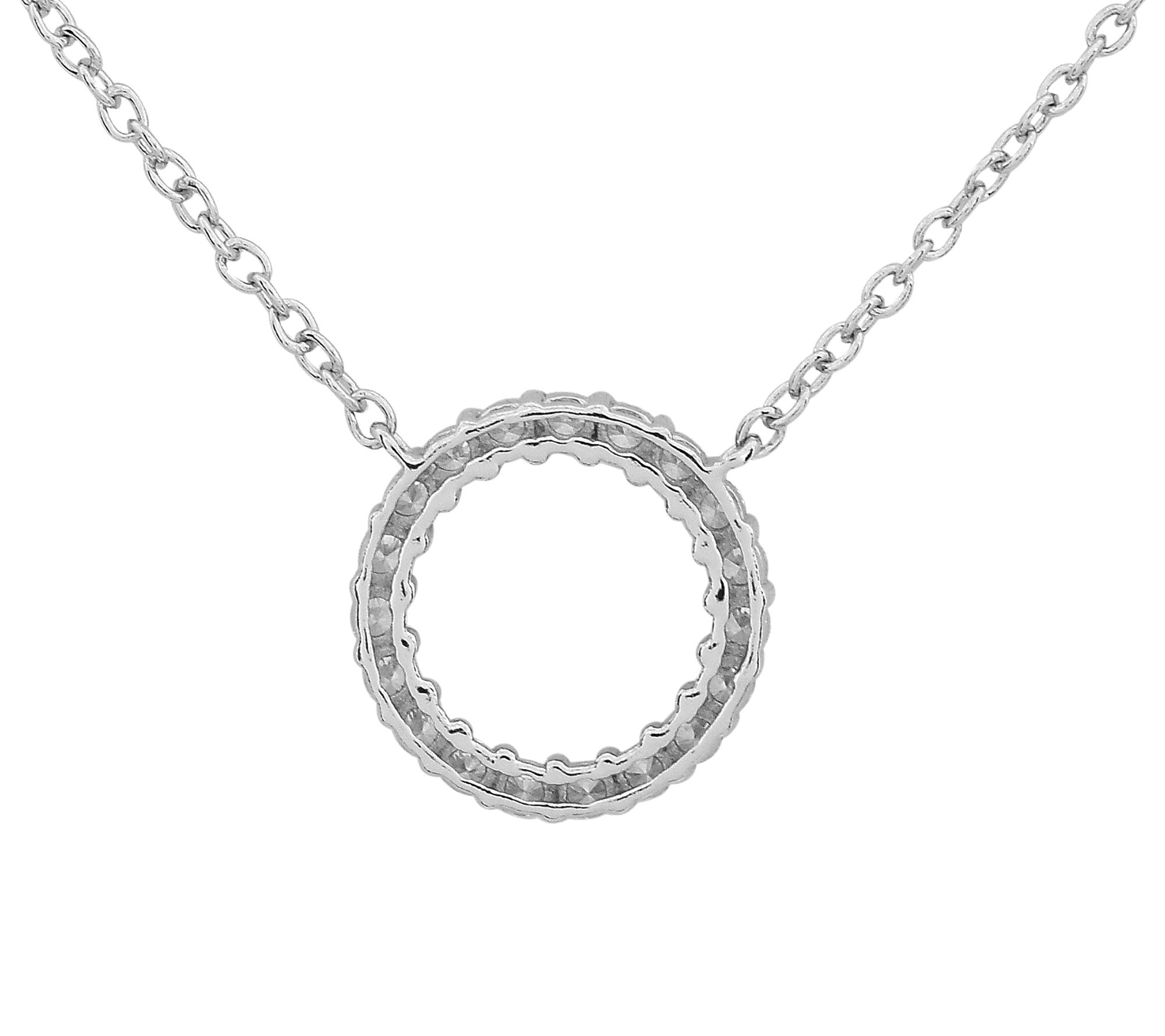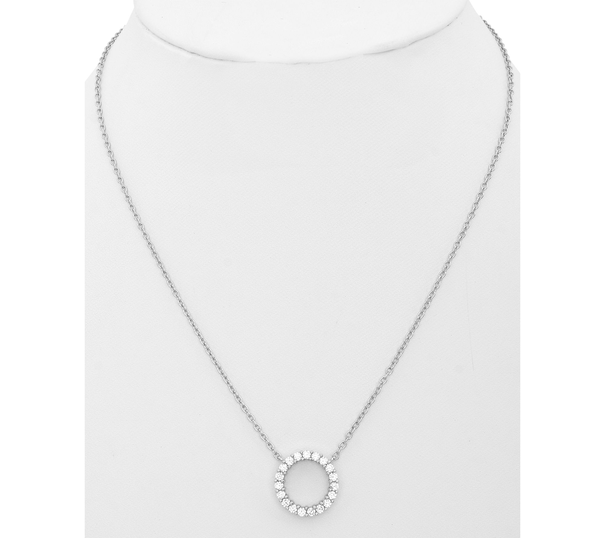 A circle of sparkling Diamonique simulated diamonds adds a bright accent to your everyday look, catching the light as you move through your day. The platinum-plated sterling silver pendant sits gracefully on an oval link chain, making it easy to style with casual outfits or your favorite dress for a special dinner.