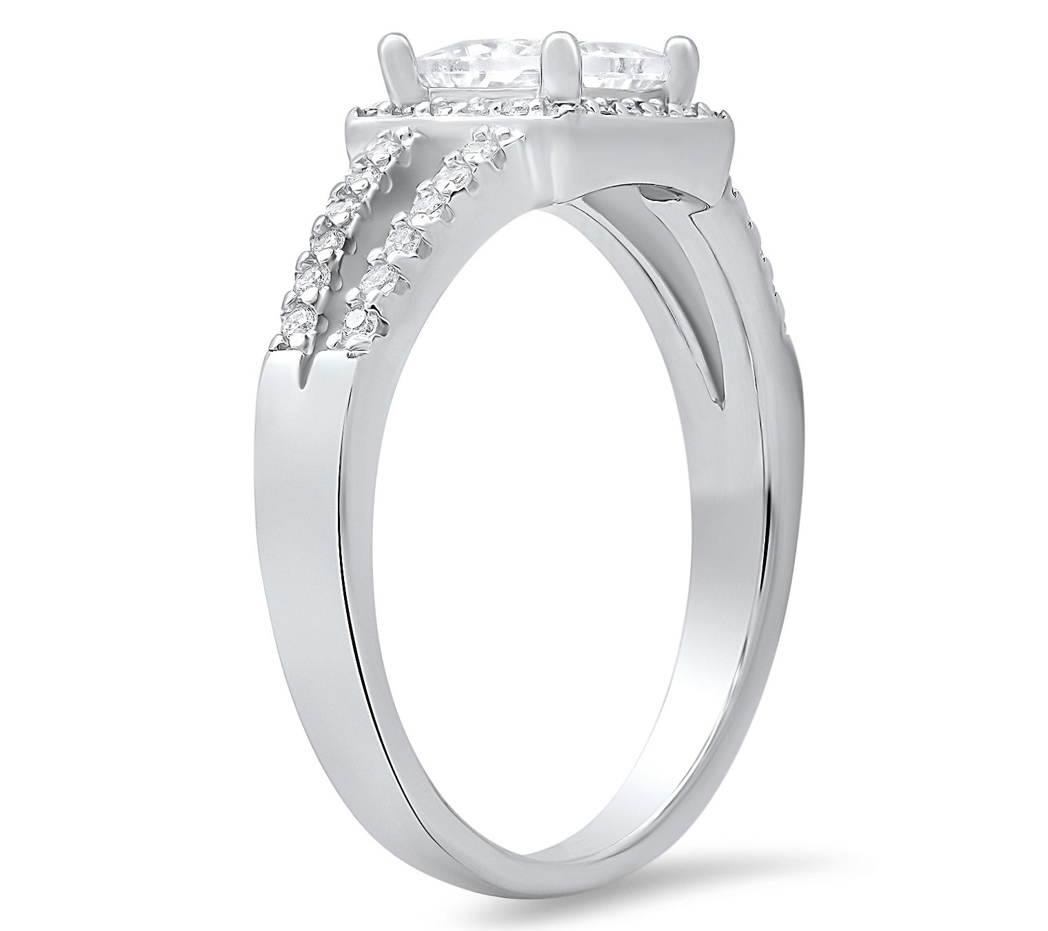 Whether you're dressing up for a special event or just want to add a touch of sparkle to your everyday look, this ring is perfect for any occasion. The stunning princess-cut Diamonique simulated diamond at the center of this sterling silver ring is surrounded by a halo of smaller simulated diamonds, making it a true showstopper. The split band design adds a modern twist, ensuring it stands out in your collection. Experience the elegance and luxury of this timeless piece.