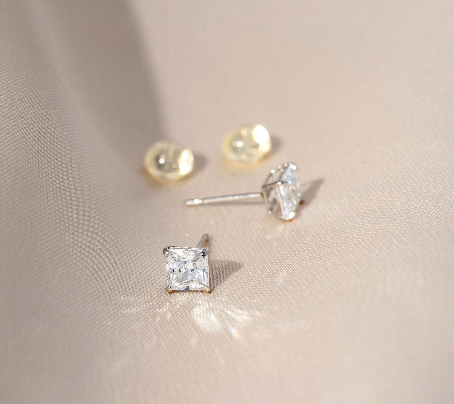• Prong-set, princess-cut solitaire stud; polished