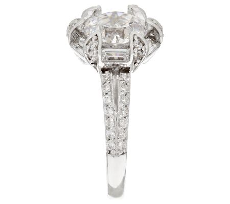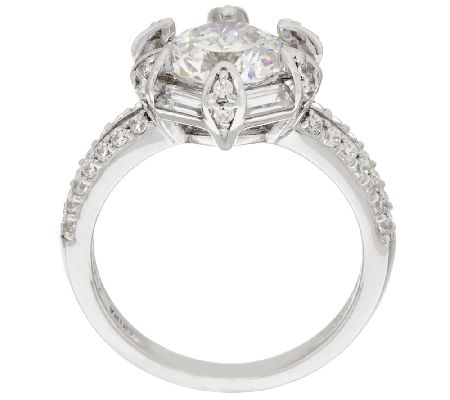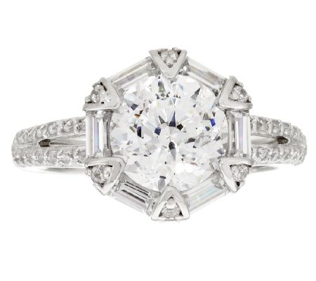 Fancy prong-set, 100-facet, round Diamonique simulated diamond center; bead-set, round Diamonique simulated diamonds on the six prongs; baguette Diamonique simulated diamonds between the prongs; split shoulder accented with bead-set, round Diamonique simulated diamonds; highly polished shank