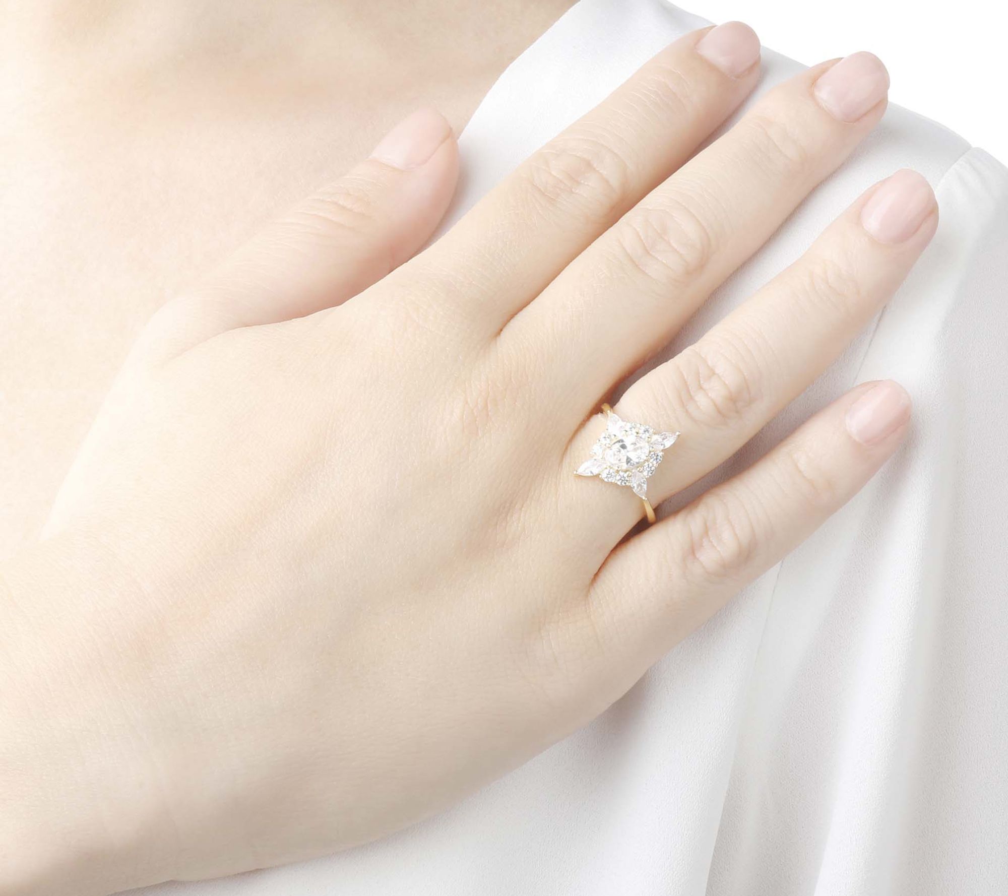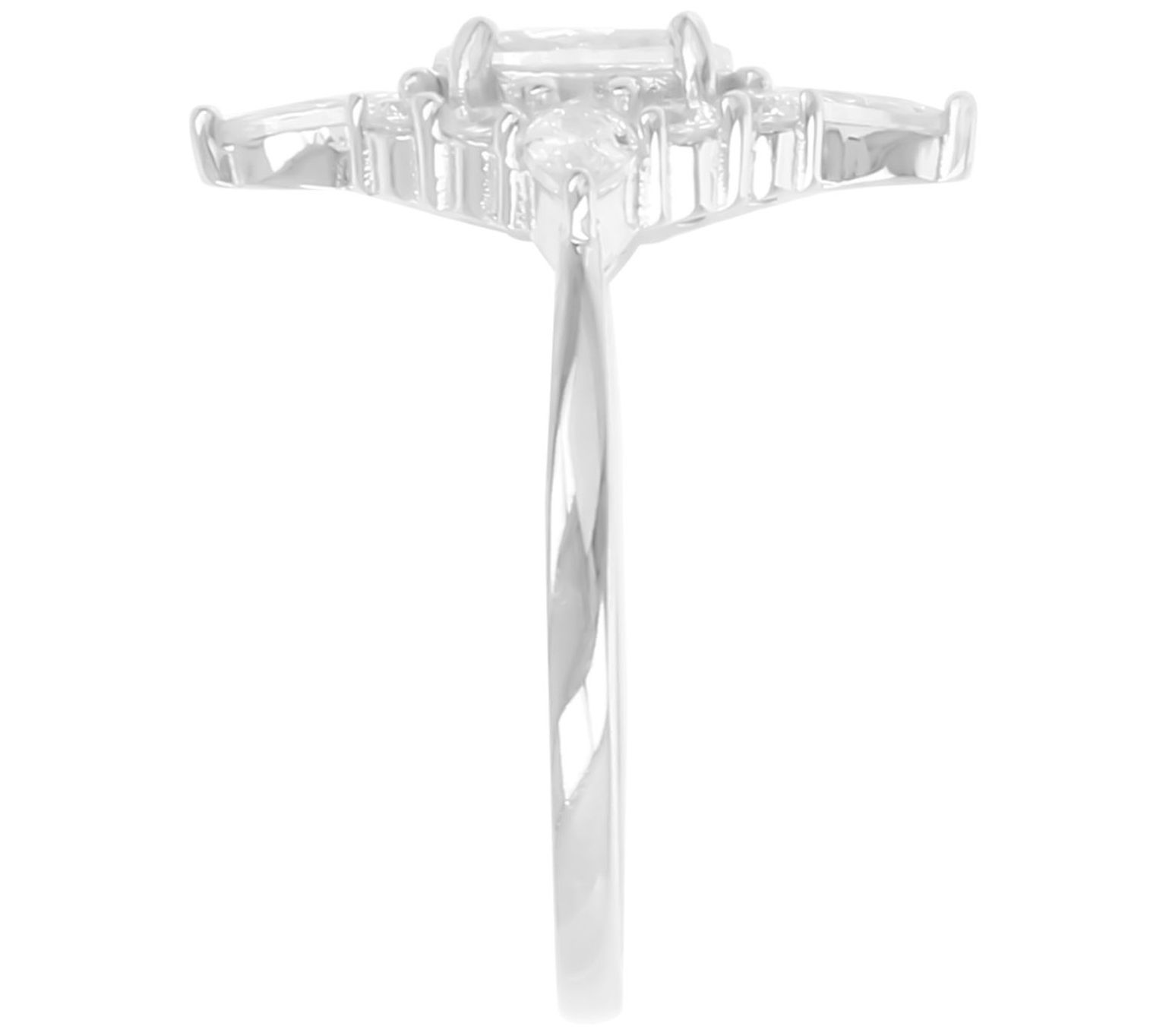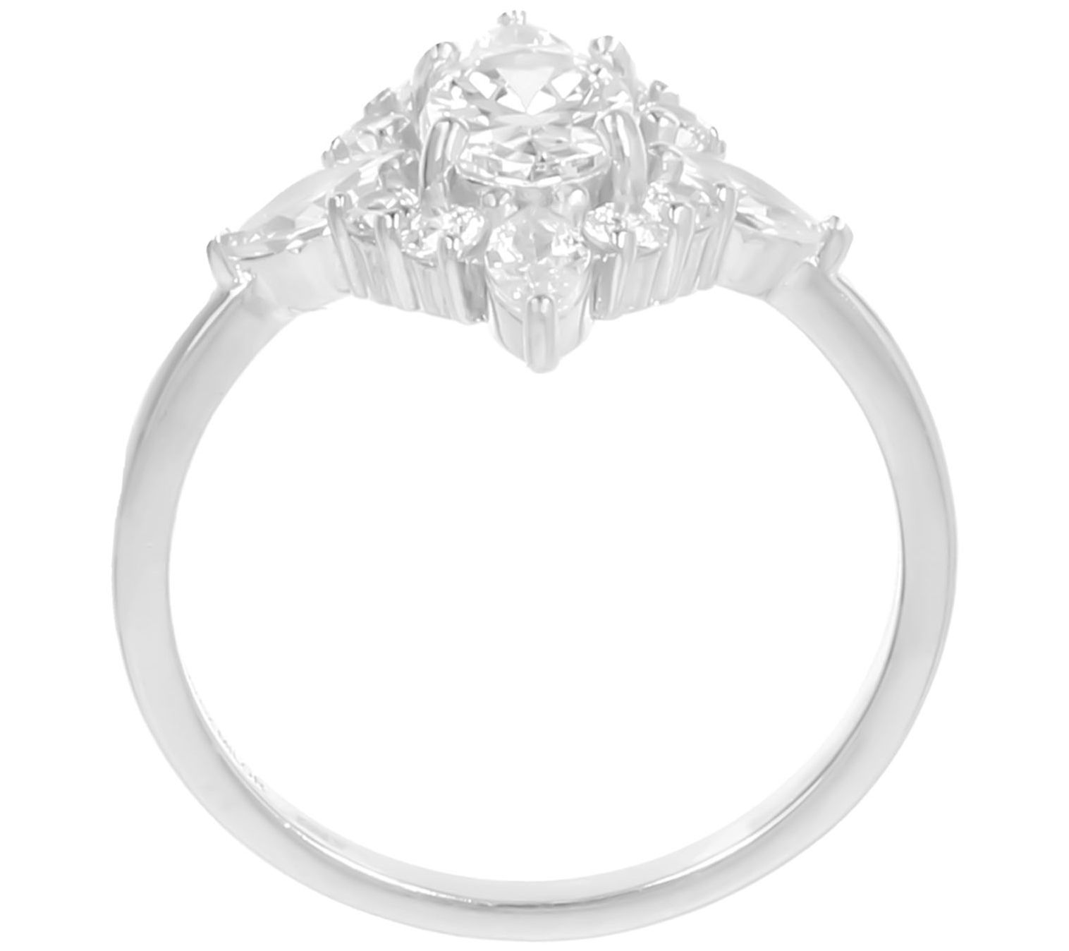 - Prong-set, oval-cut Diamonique simulated diamond center stone surrounded by prong-set, round- and marquise-cut Diamonique simulated diamonds