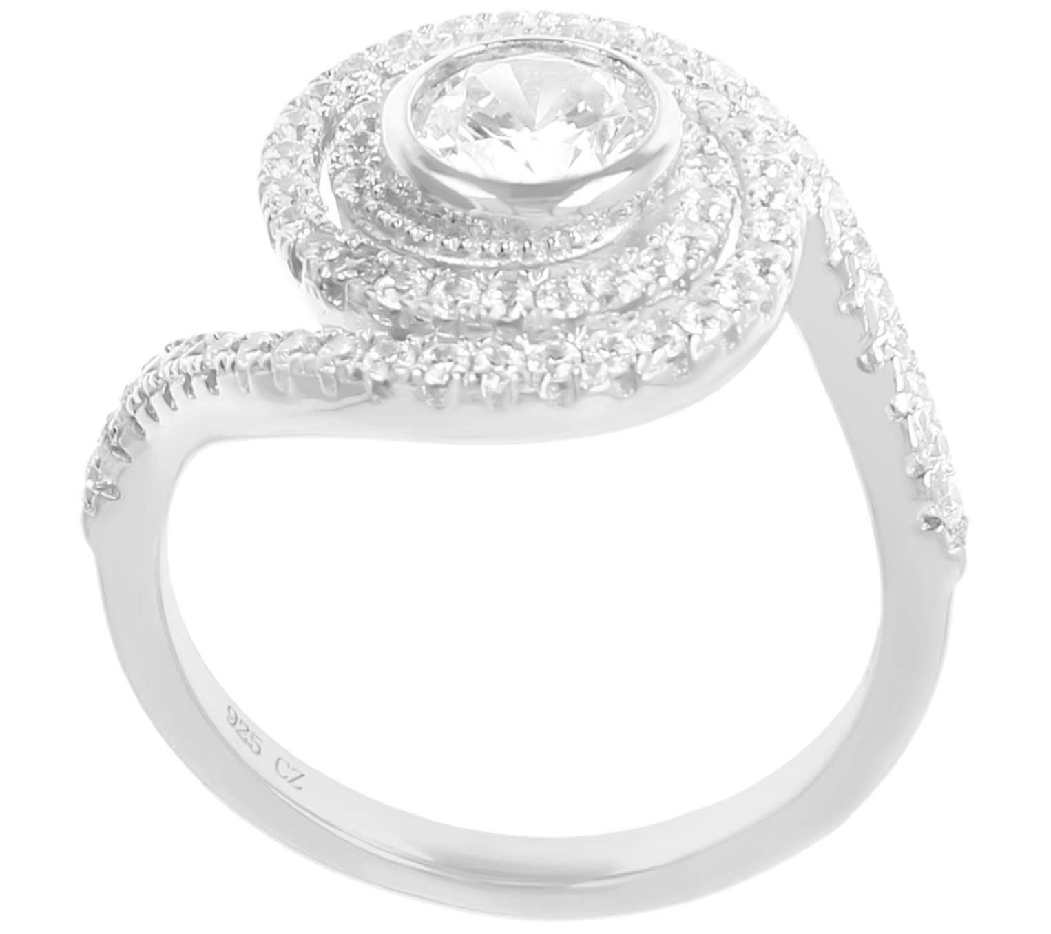 Bezel-set round, Diamonique simulated diamond in the center; surrounding the center stone is a swirl of prong-set, round Diamonique simulated diamonds; polished finish