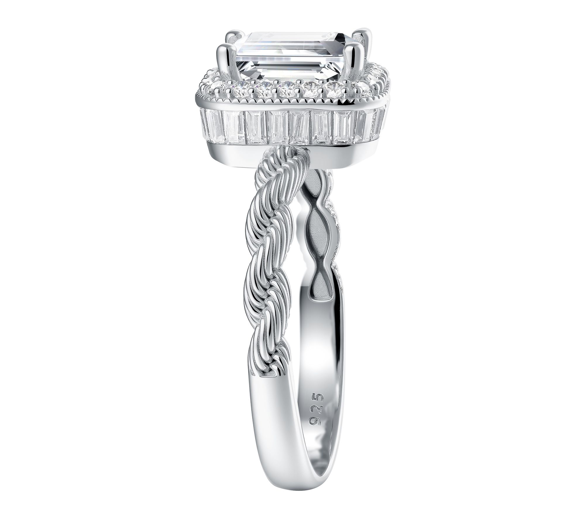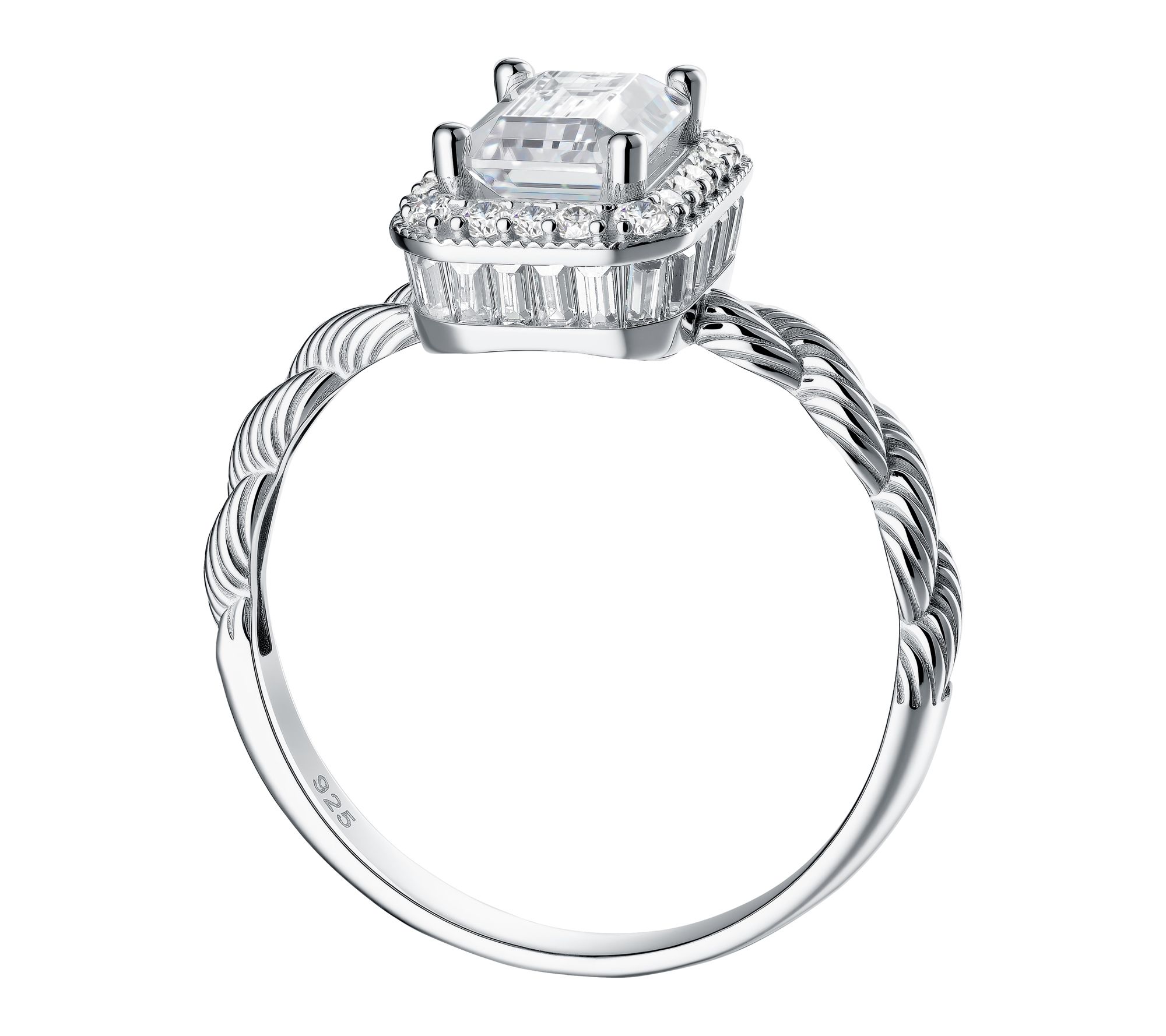 • Emerald-cut Diamonique simulated diamond solitaire; twisted band; halo of round, prong-set Diamonique simulated diamonds