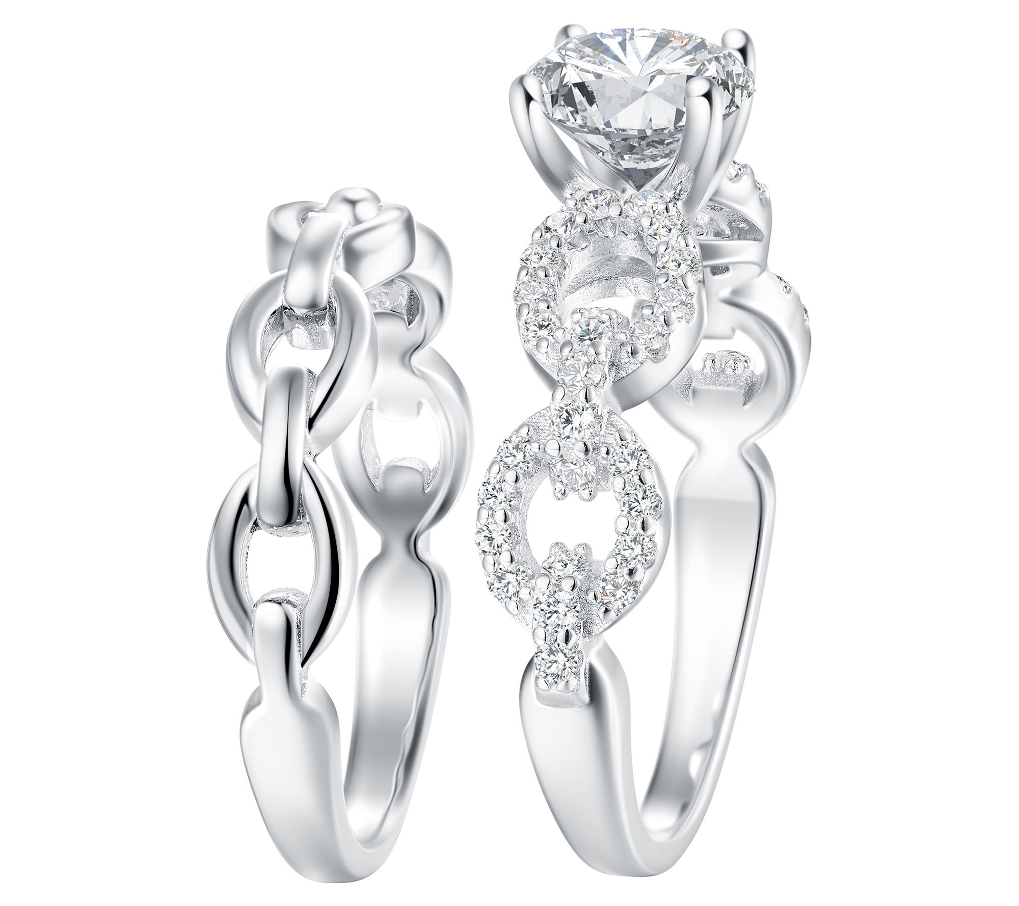 • Wedding band with chain link design; engagement ring has round-cut, prong-set Diamonique simulated diamond center with round-cut, pave-set Diamonique simulated diamonds on chain-link-style shank