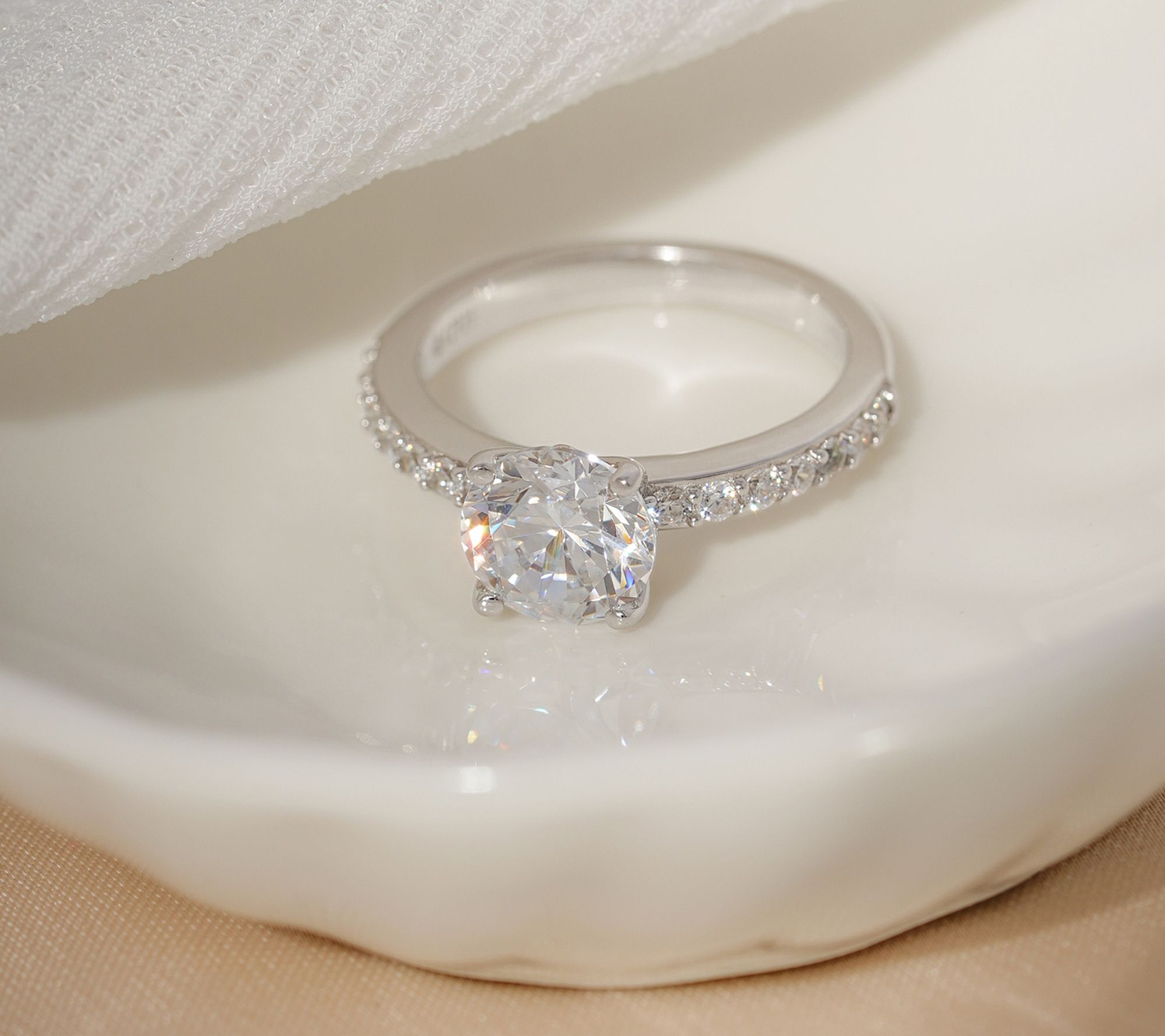 The look of luxury. Boasting a round, prong-set cubic zirconia Diamonique(R) simulated diamond, this highly polished ring allows you to incorporate a touch of extravagance into your everyday ensembles. Round, bead-set Diamonique simulated diamonds add shimmer to the shank.