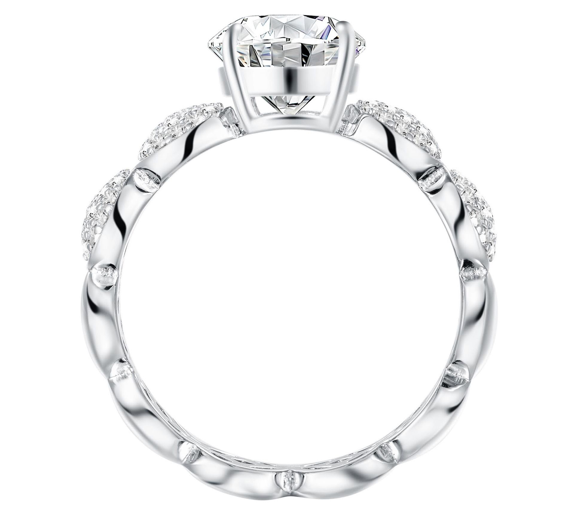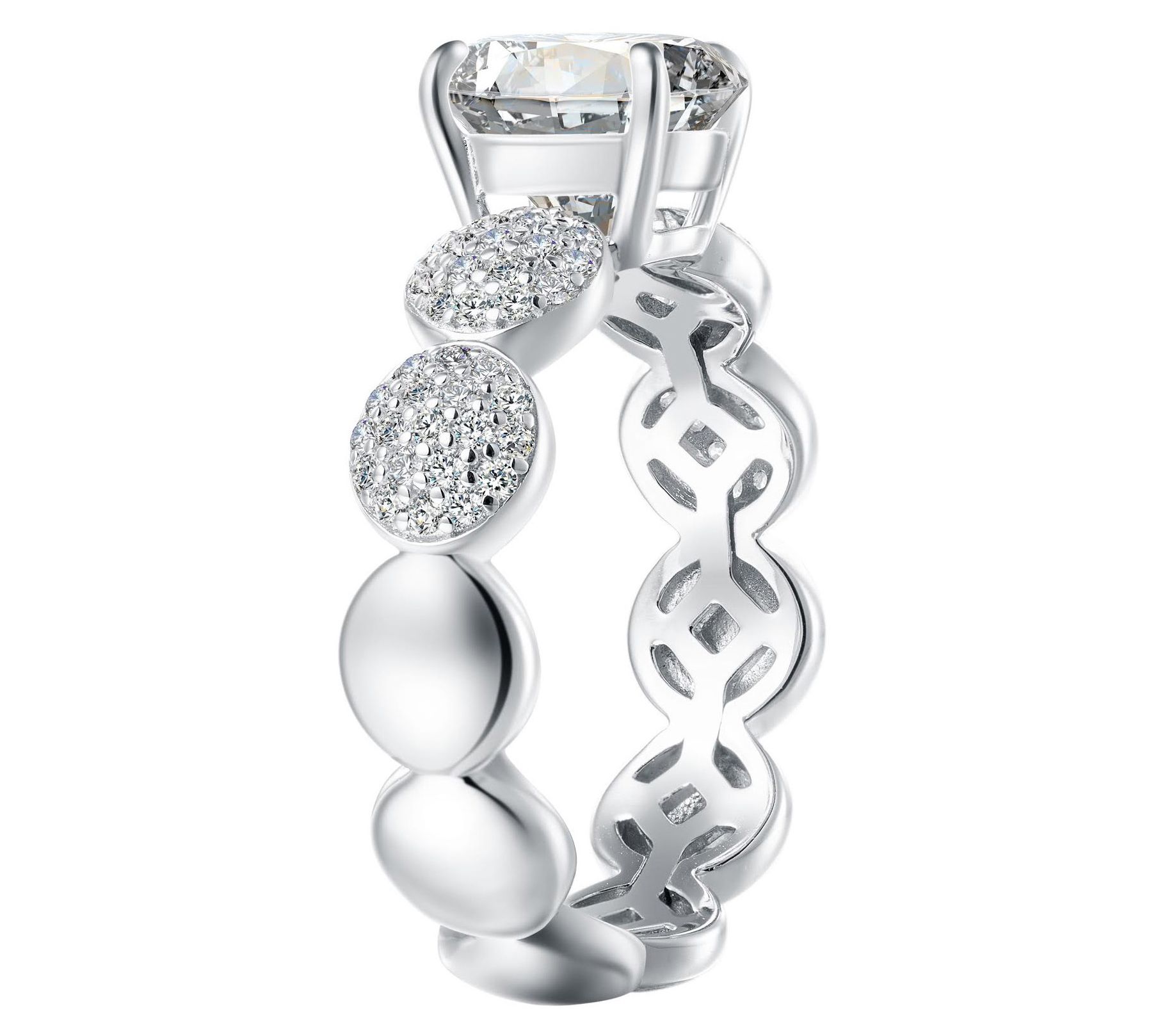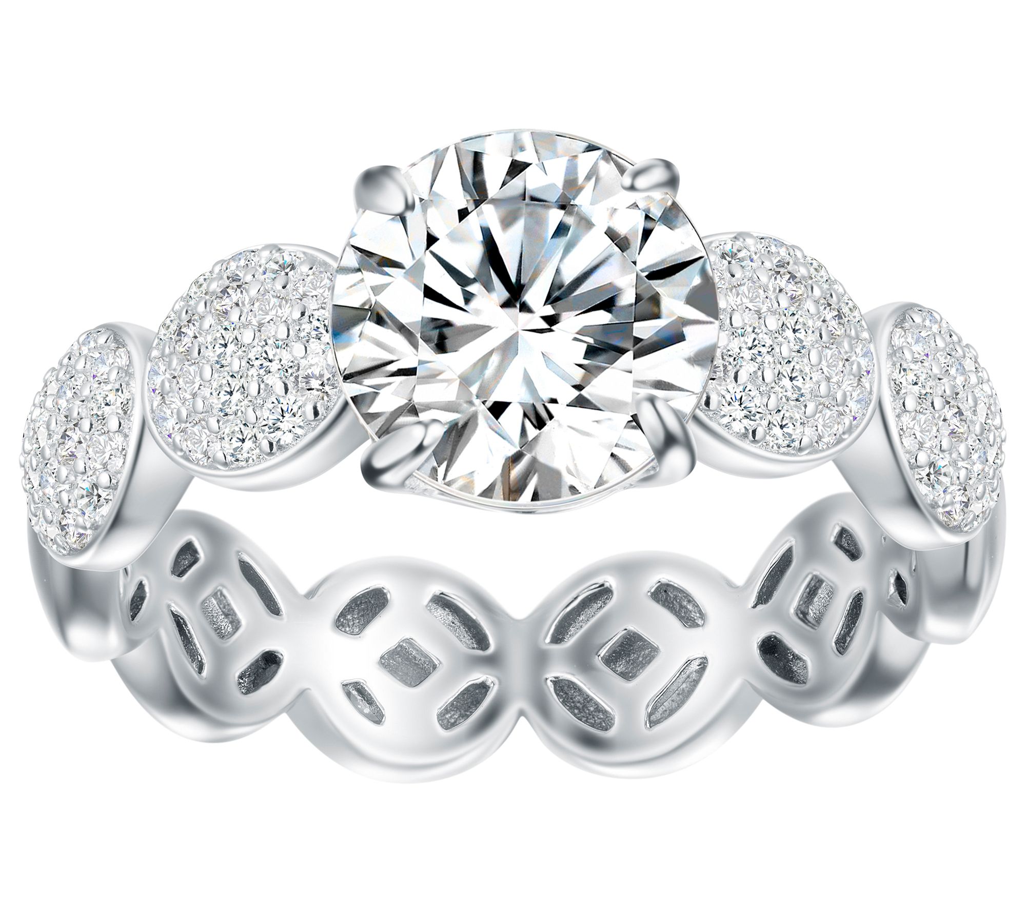 • Round-cut, prong-set Diamonique simulated diamond center and round-cut, pave-set Diamonique simulated diamond circles around band