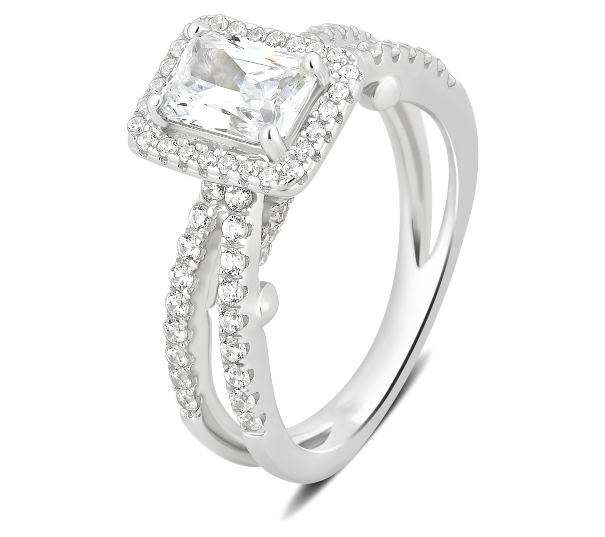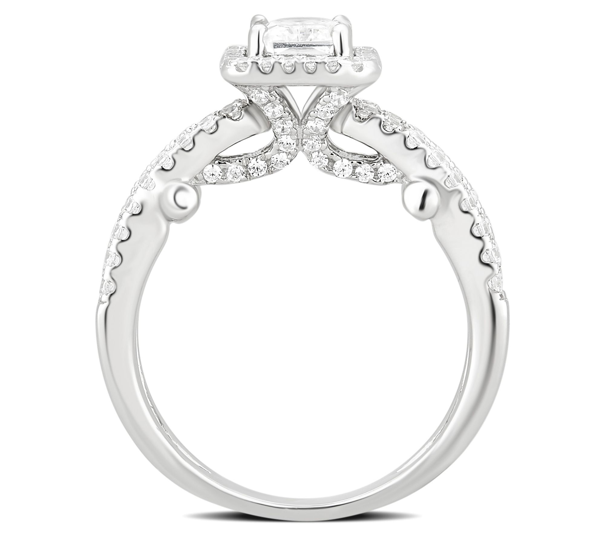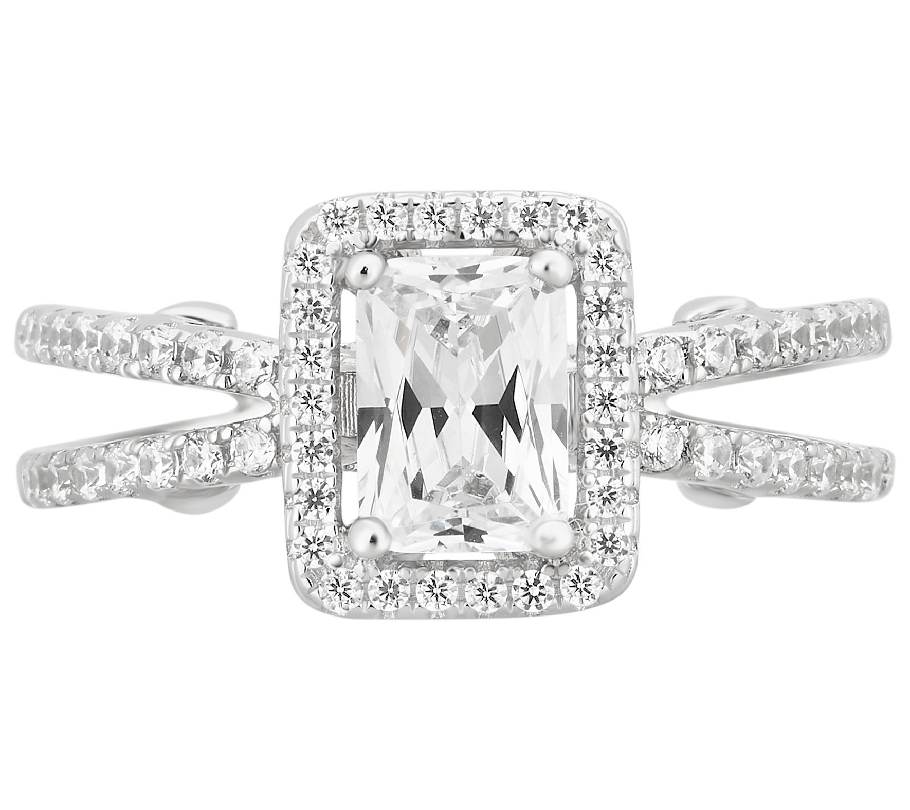 Emerald-cut prong-set Diamonique simulated diamond center; band and open shank outlined with round-cut prong-set Diamonique simulated diamonds