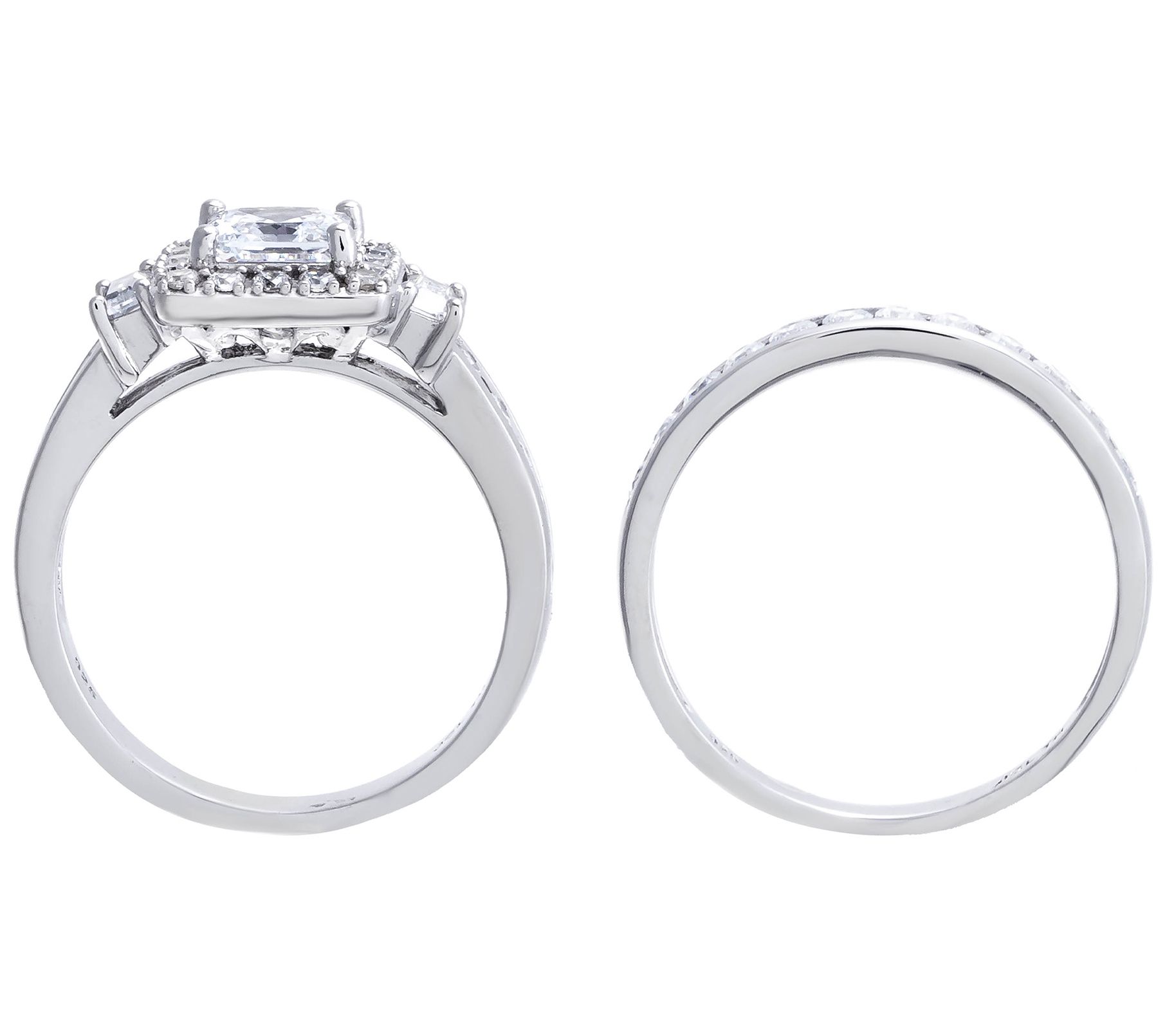 • Engagement ring: square-cut, prong-set Diamonique simulated diamond center with baguette-cut, prong-set Diamonique simualted diamond side stones and round-cut, halo-set Diamonique simulated diamonds; shank outlined with round-cut, channel-set Diamonique simulated diamonds