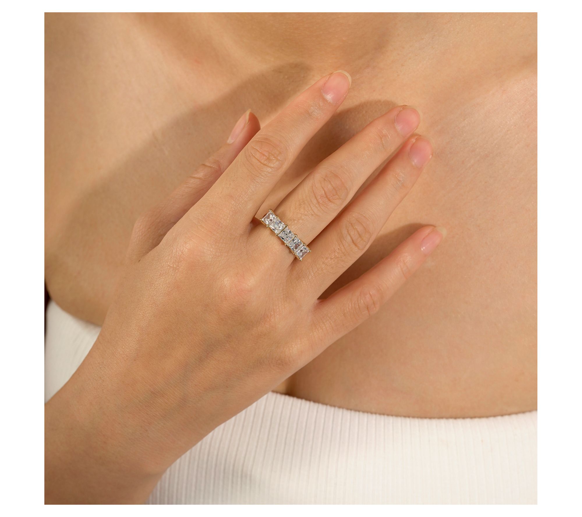 Five princess-cut, shared prong-set Diamonique simulated diamonds; polished finish