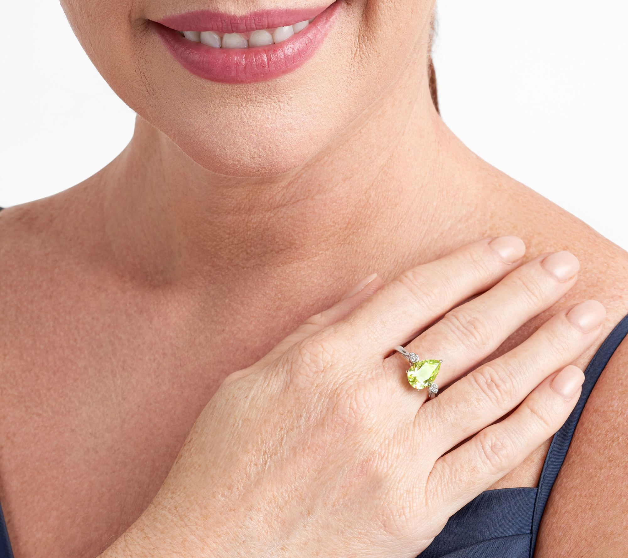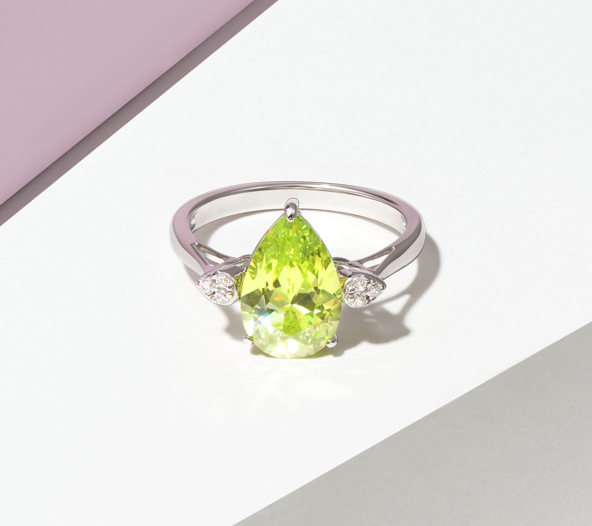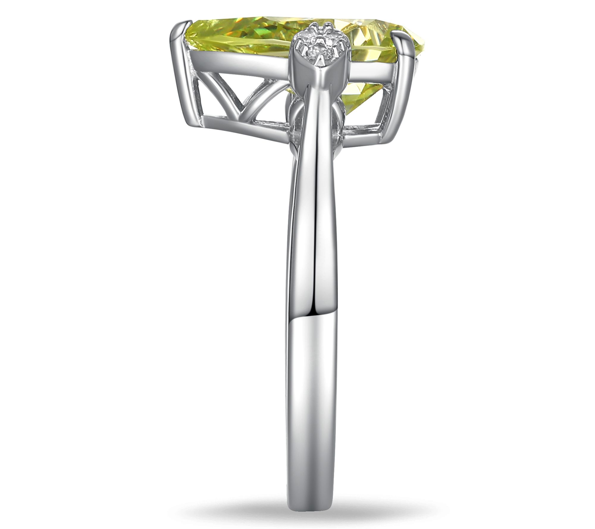 - Pear-cut, prong-set simulated peridot Diamonique simulated diamond flanked by round, prong-set Diamonique simulated diamonds